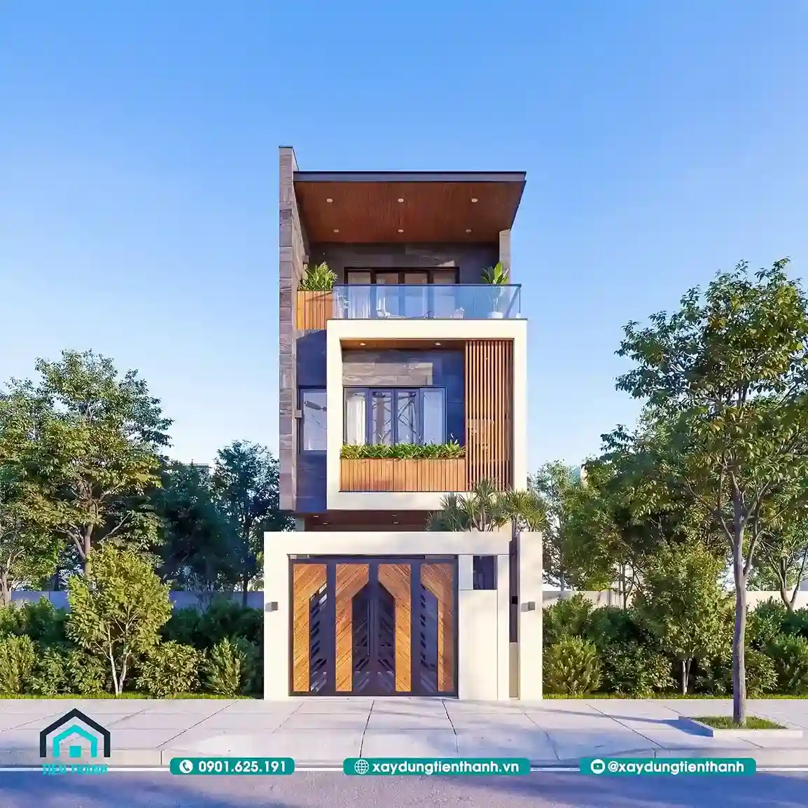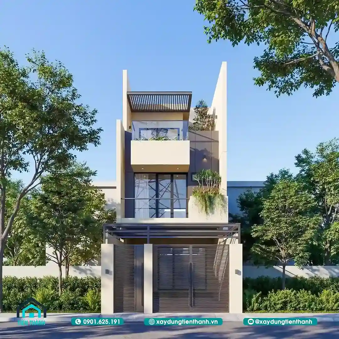 Mẫu nhà ống 3 tầng hiện đại nổi bật với hình khối vuông vức và màu sắc tinh tế.