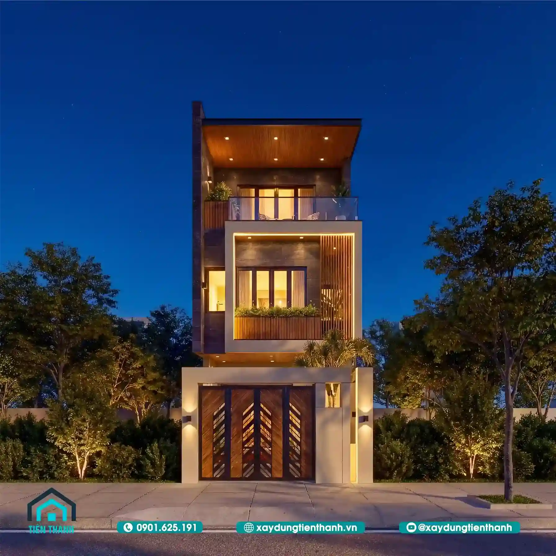 Phối cảnh ban đêm của nhà phố hiện đại với hệ thống chiếu sáng ngoại thất.