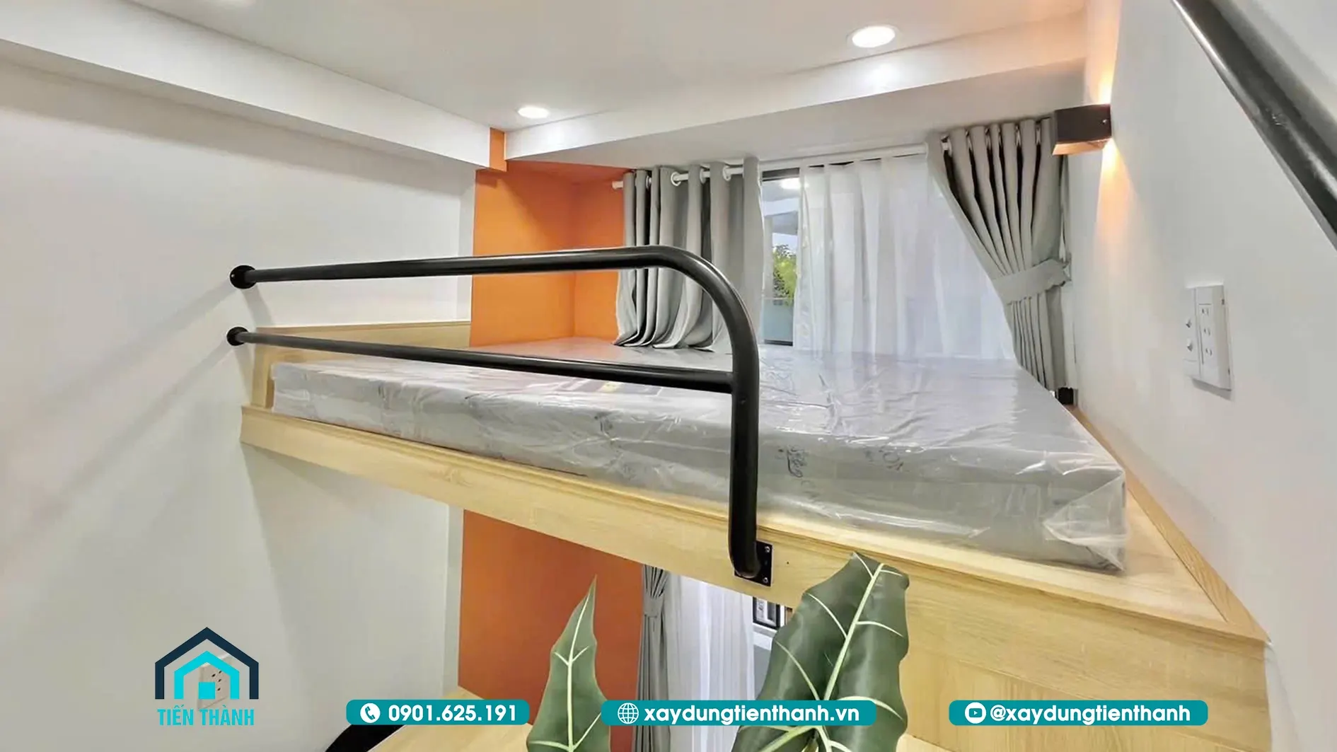 Gác lửng với lan can đen chắc chắn tạo điểm nhấn cho căn phòng trọ hiện đại.