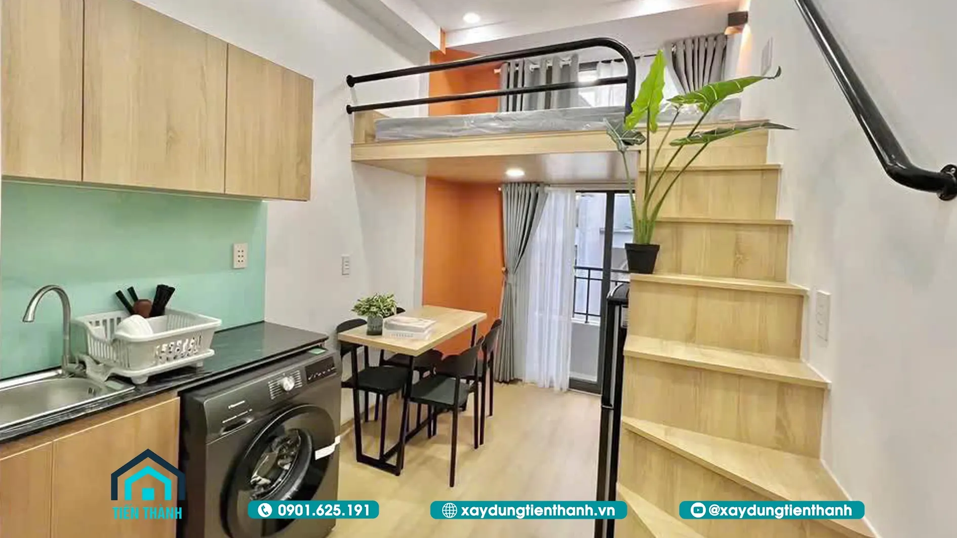 Khu vực bếp và lối lên gác được bố trí khoa học trong mẫu phòng trọ đẹp.
