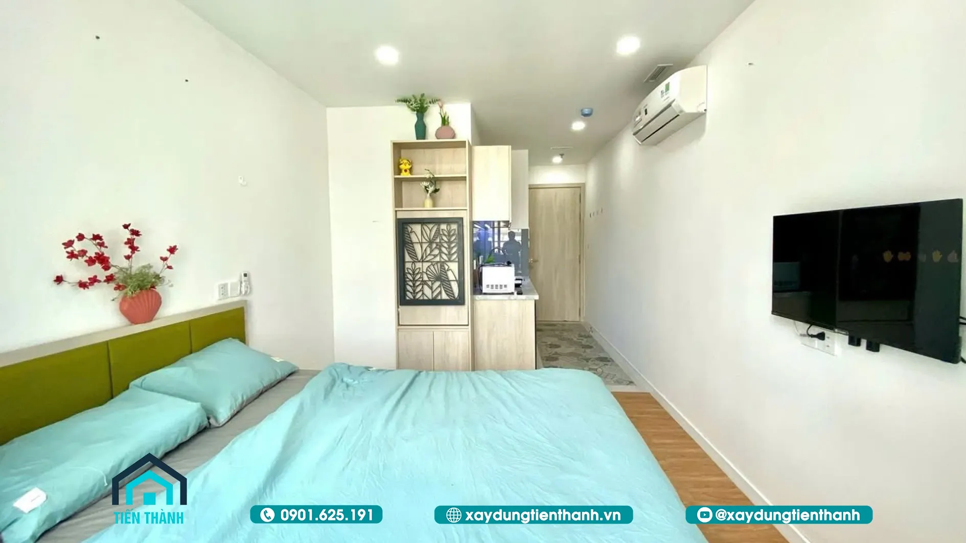 Căn phòng có đầy đủ toilet, bếp giường ngủ và trang trí đẹp