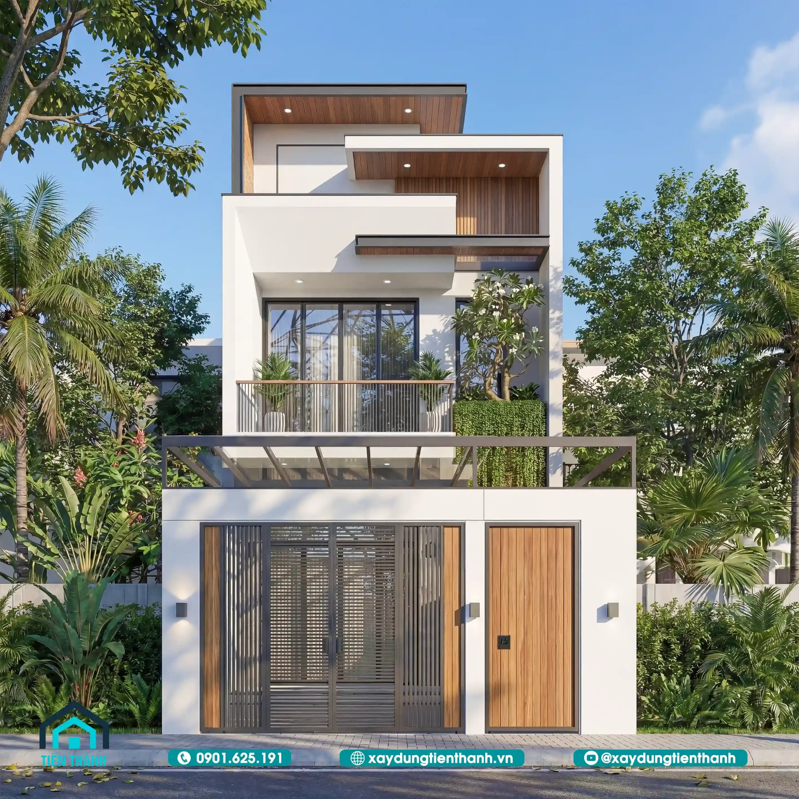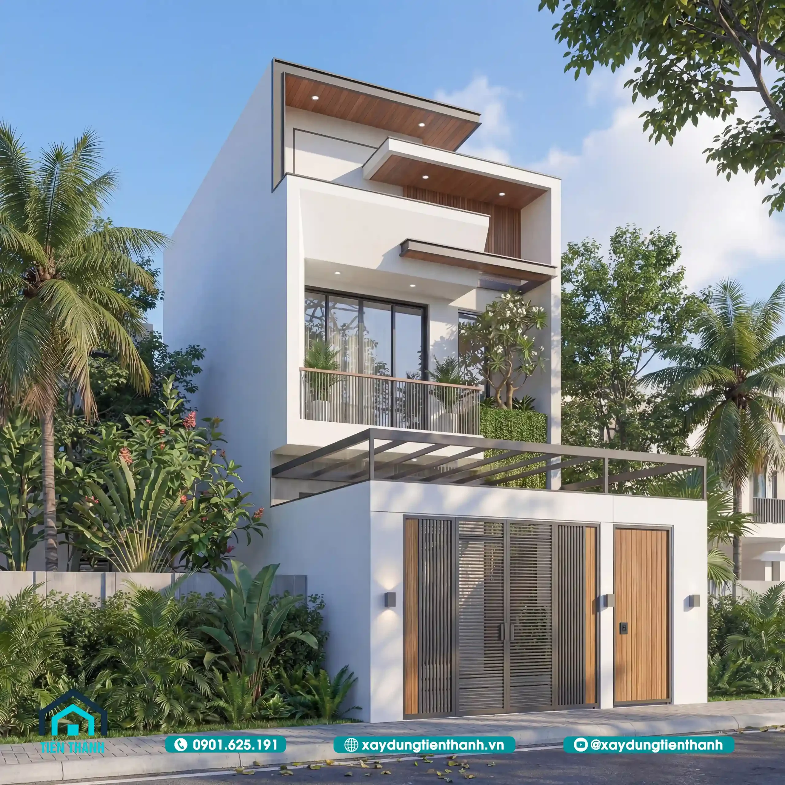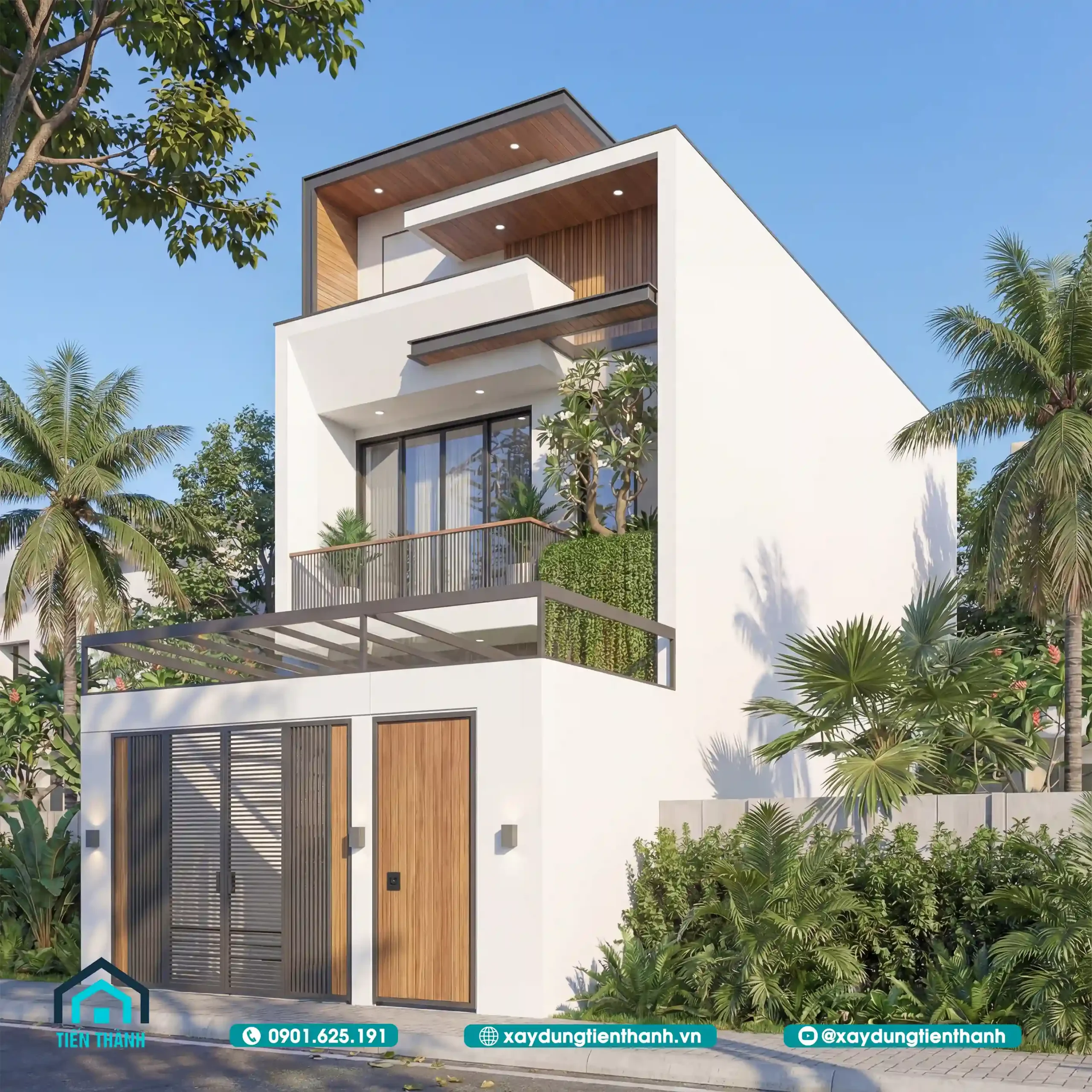 Góc nhìn nghiêng mẫu nhà phố thể hiện sự kết hợp hài hòa giữa màu trắng và gỗ.