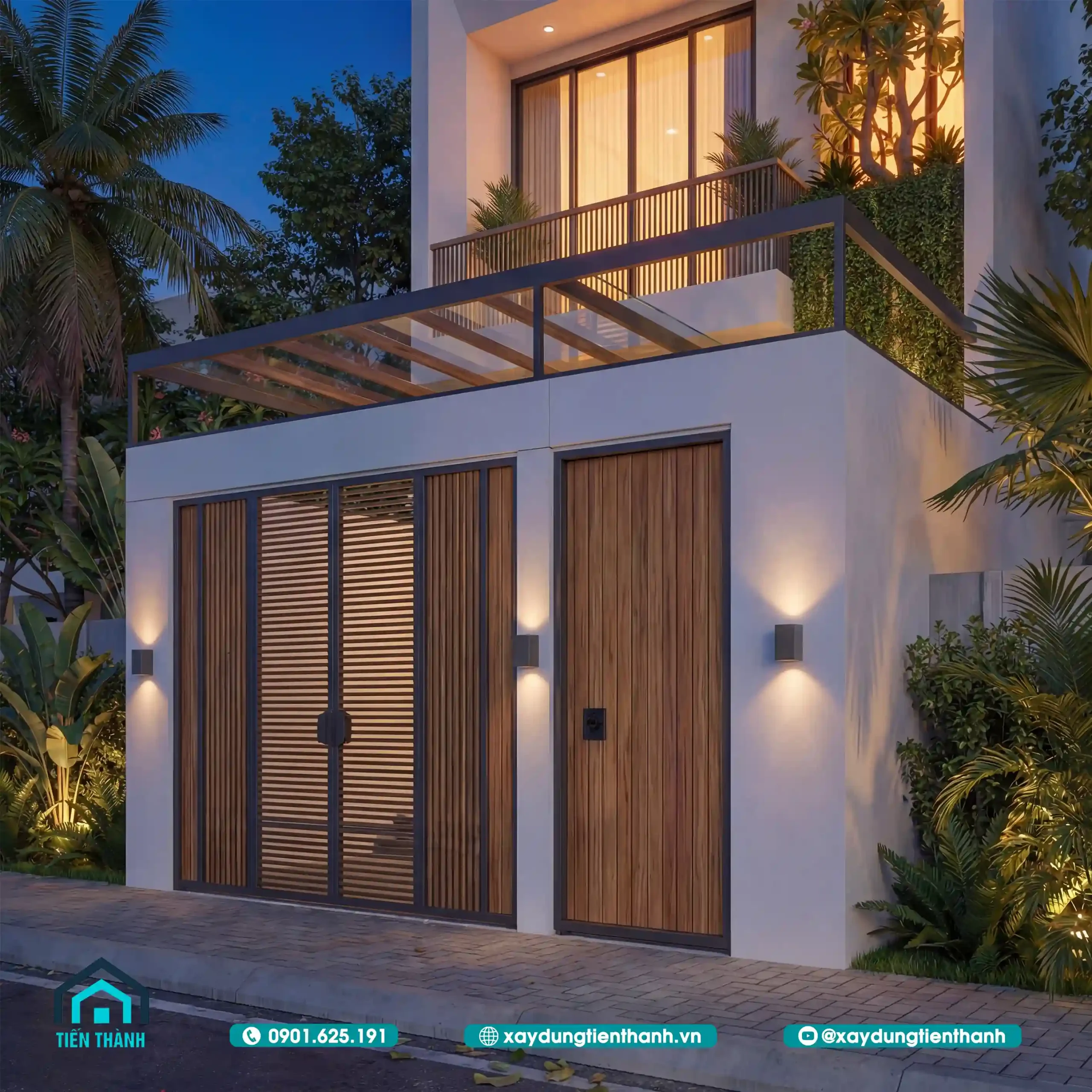 Mặt tiền là “bộ mặt” của gia chủ. Với phong cách hiện đại, các vật liệu như gỗ nhựa ngoài trời, kính cường lực và cây xanh được kết hợp hài hòa.