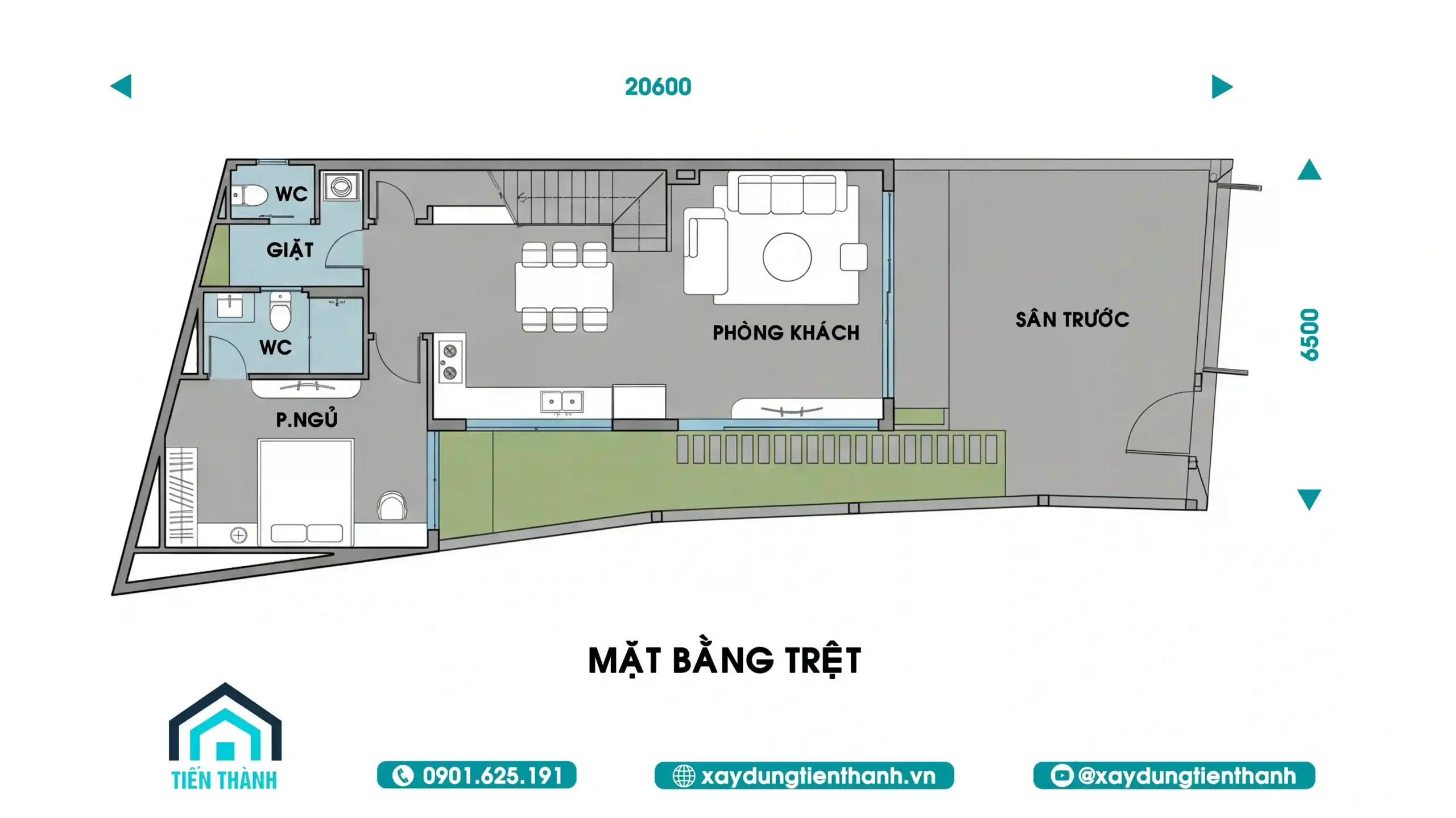 - Khu vực phụ: Bao gồm nhà vệ sinh (WC) và khu giặt phơi được đặt kín đáo ở phía cuối nhà, đảm bảo tính thẩm mỹ và phong thủy.