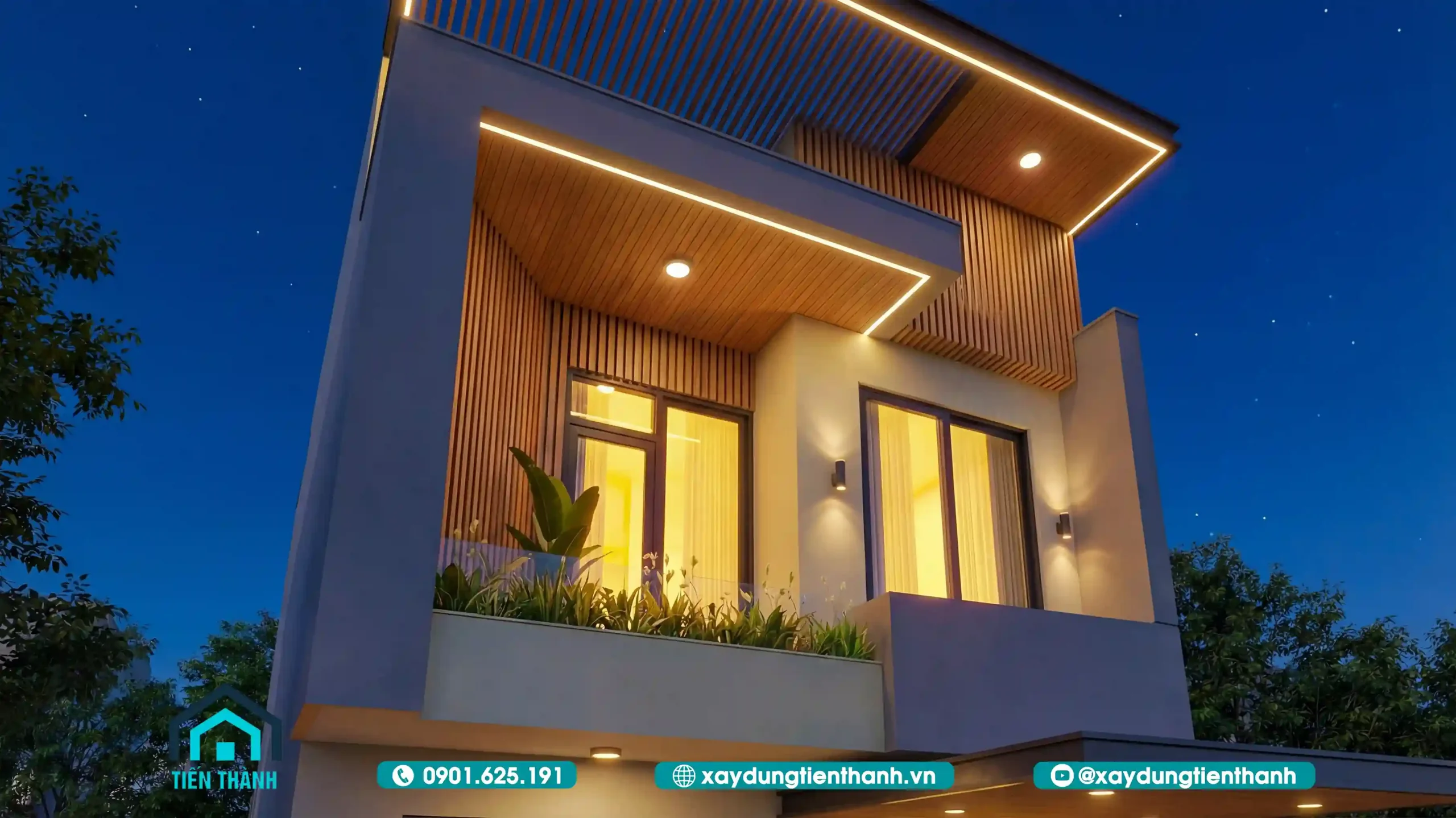 Mẫu thiết kế dưới đây là minh chứng rõ nét cho sự kết hợp giữa vật liệu hiện đại và ánh sáng nghệ thuật. Một ngôi nhà 2 tầng không chỉ để ở, mà còn là một tác phẩm nghệ thuật ngay từ cái nhìn đầu tiên.