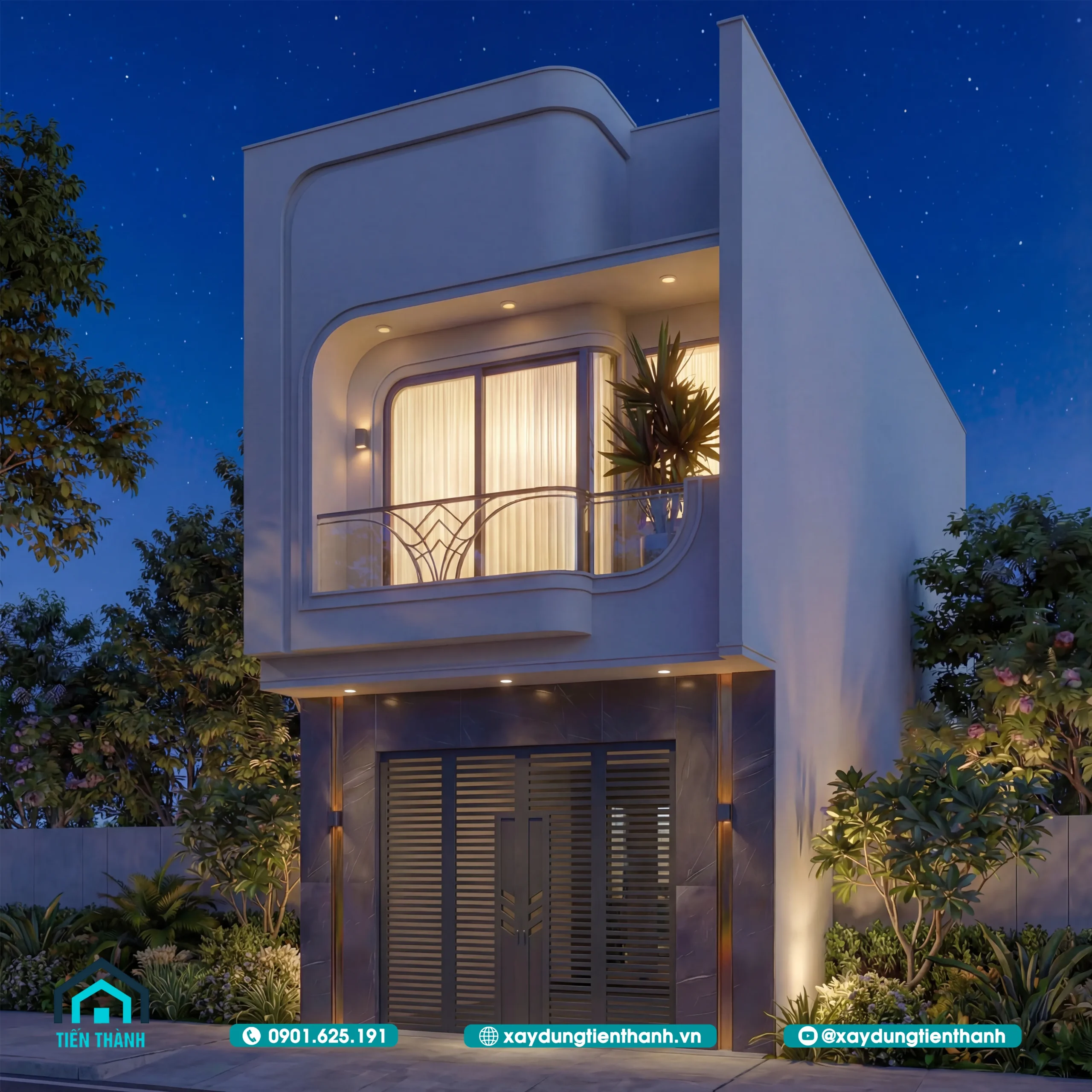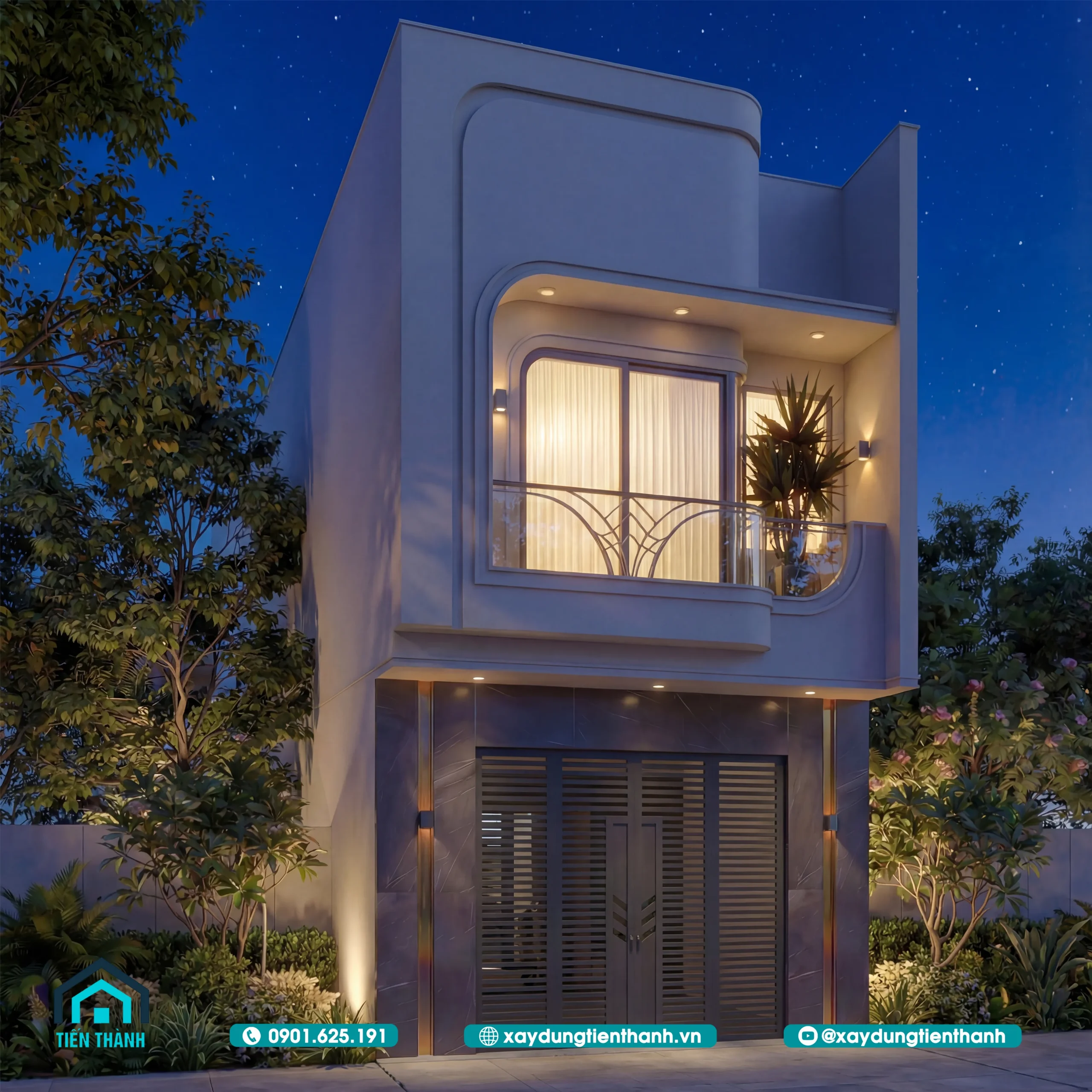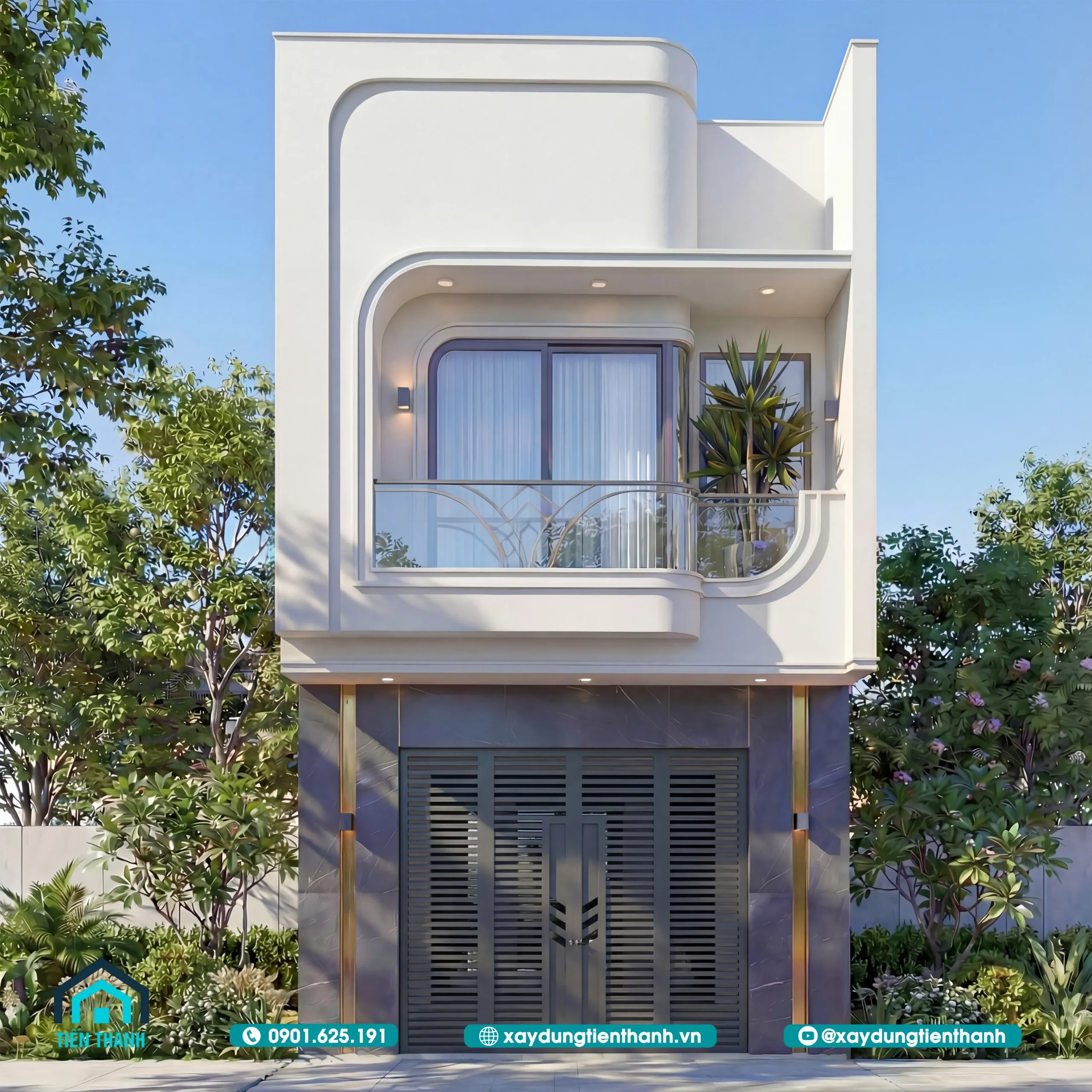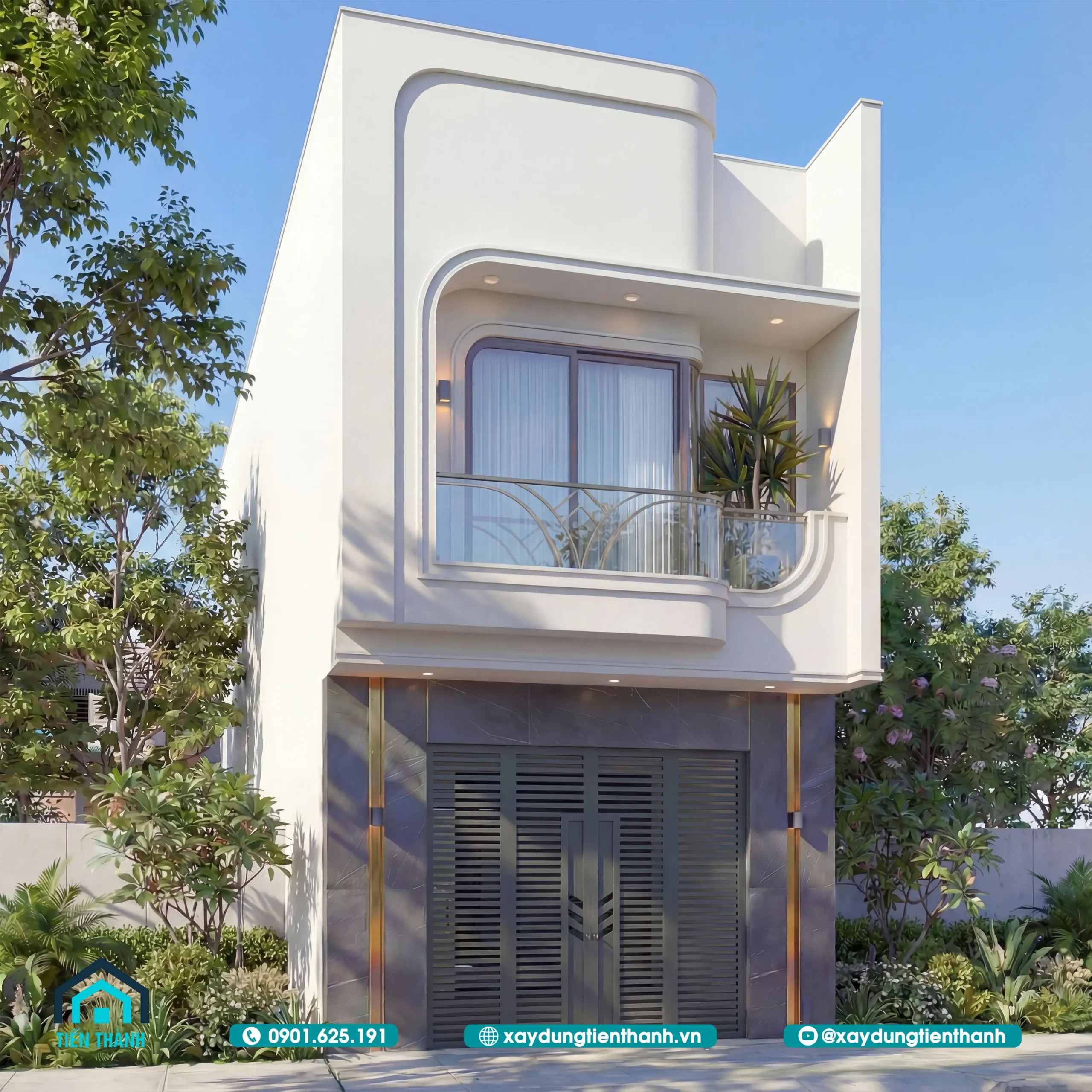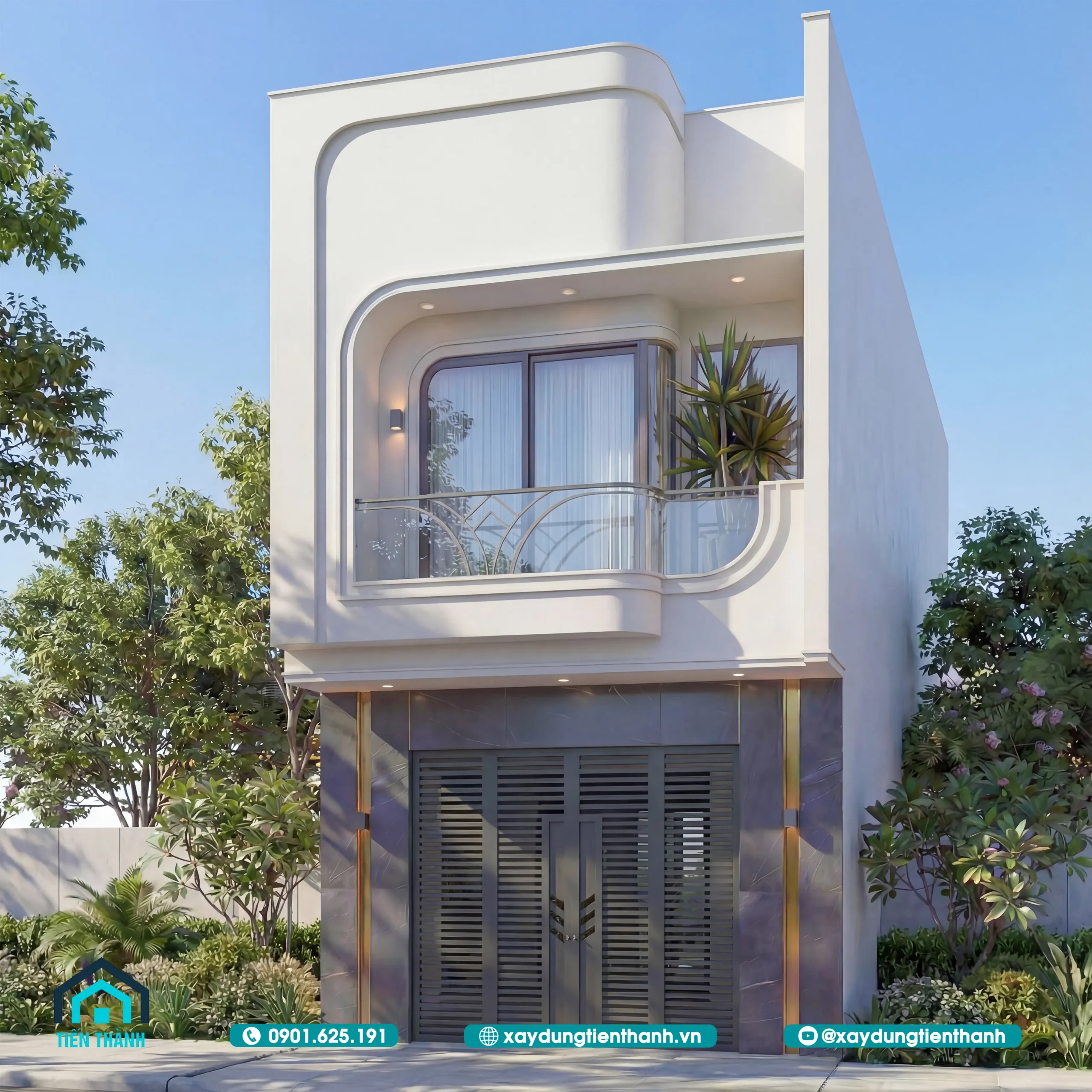 Nhà phố hai tầng hiện đại với thiết kế bo góc mềm mại và ban công kính sang trọng.