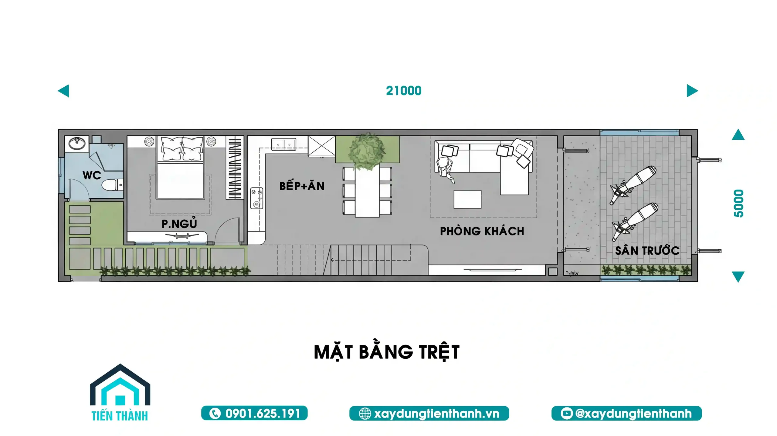 Để đánh giá một mẫu nhà 2 tầng 5m đẹp, chúng ta cần đi sâu vào cách bố trí mặt bằng công năng. Dưới đây là giải pháp thiết kế cho tầng trệt với chiều dài khu đất lên tới 21m.