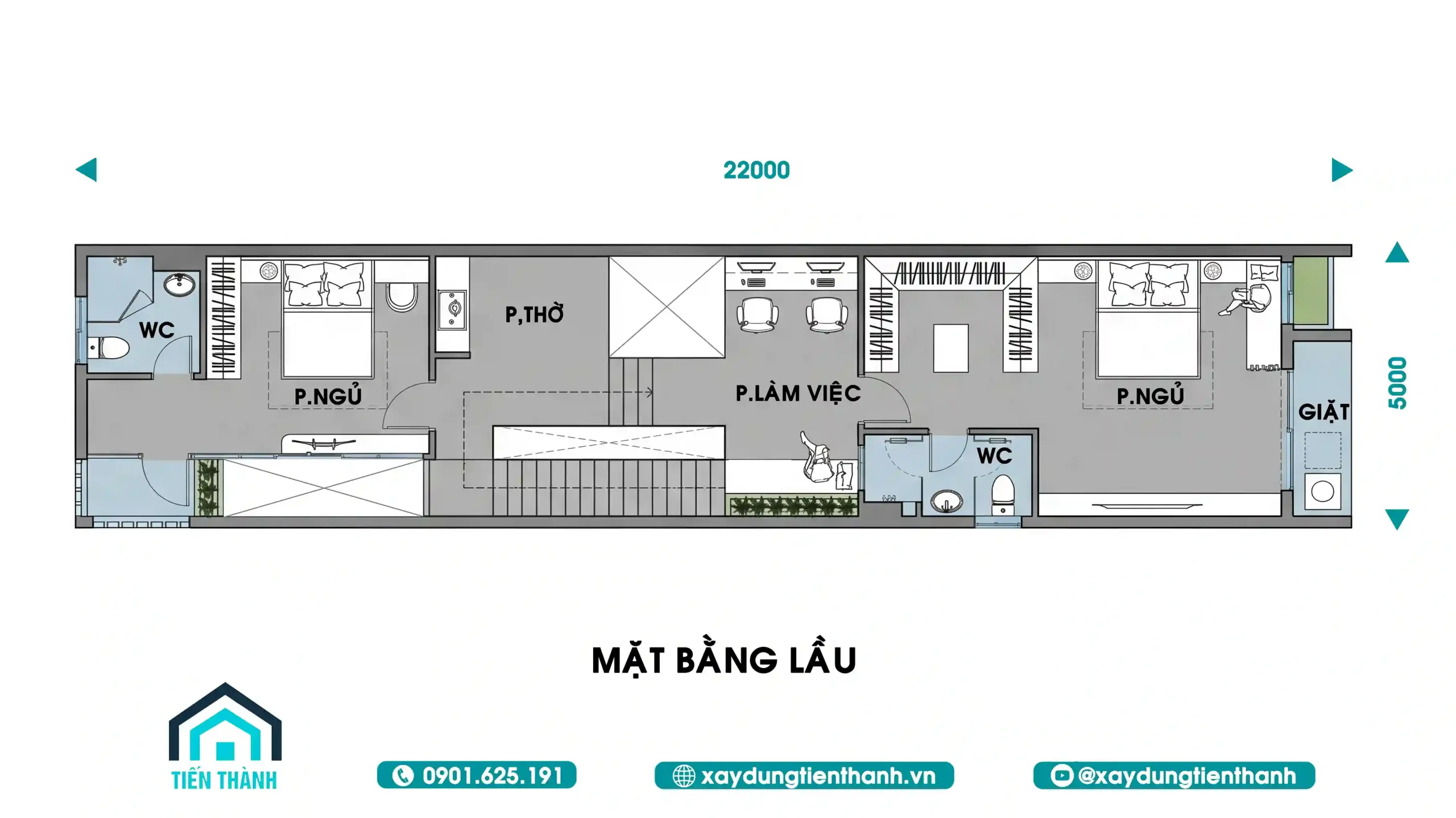 Dựa trên bản vẽ chi tiết, chúng ta có thể thấy cách sắp xếp cực kỳ khoa học trên diện tích sàn 5m x 22m: