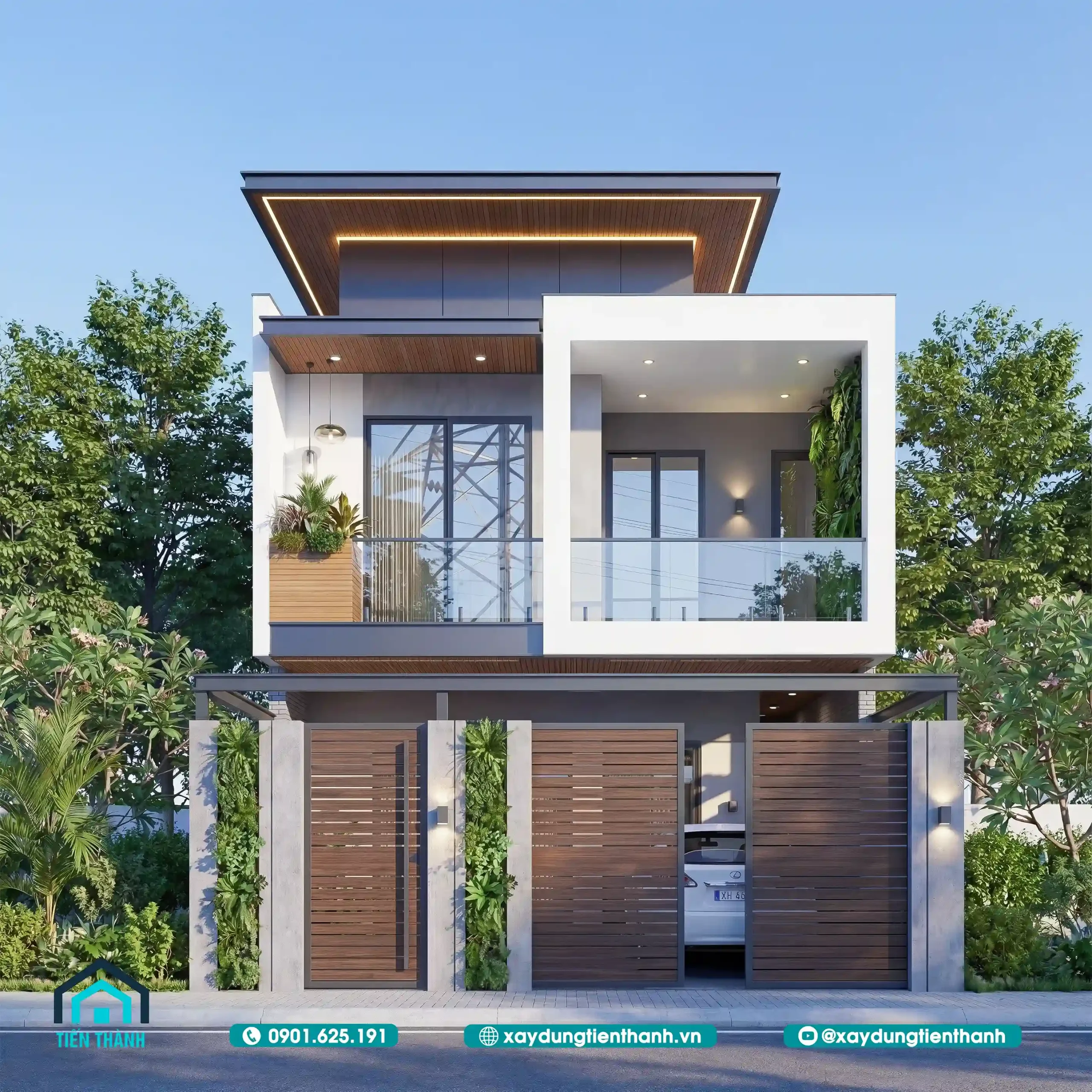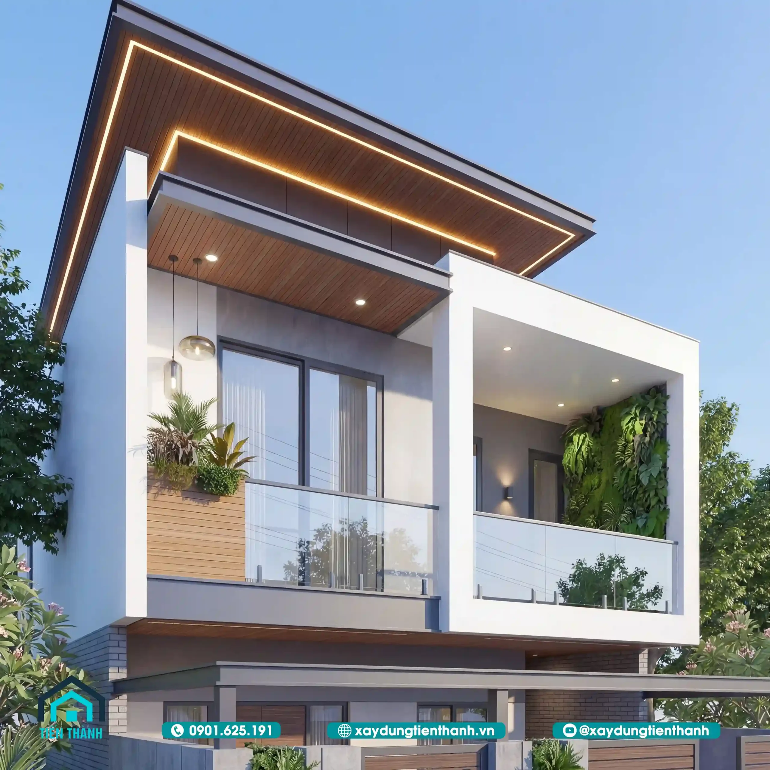 - Mảng xanh cân bằng: Việc đưa cây xanh vào mặt tiền không chỉ có tác dụng thẩm mỹ mà còn giúp cân bằng ngũ hành. Cây xanh (Mộc) kết hợp với ánh sáng (Hỏa) và màu trắng của tường (Kim) tạo nên một vòng tròn sinh khí hài hòa.