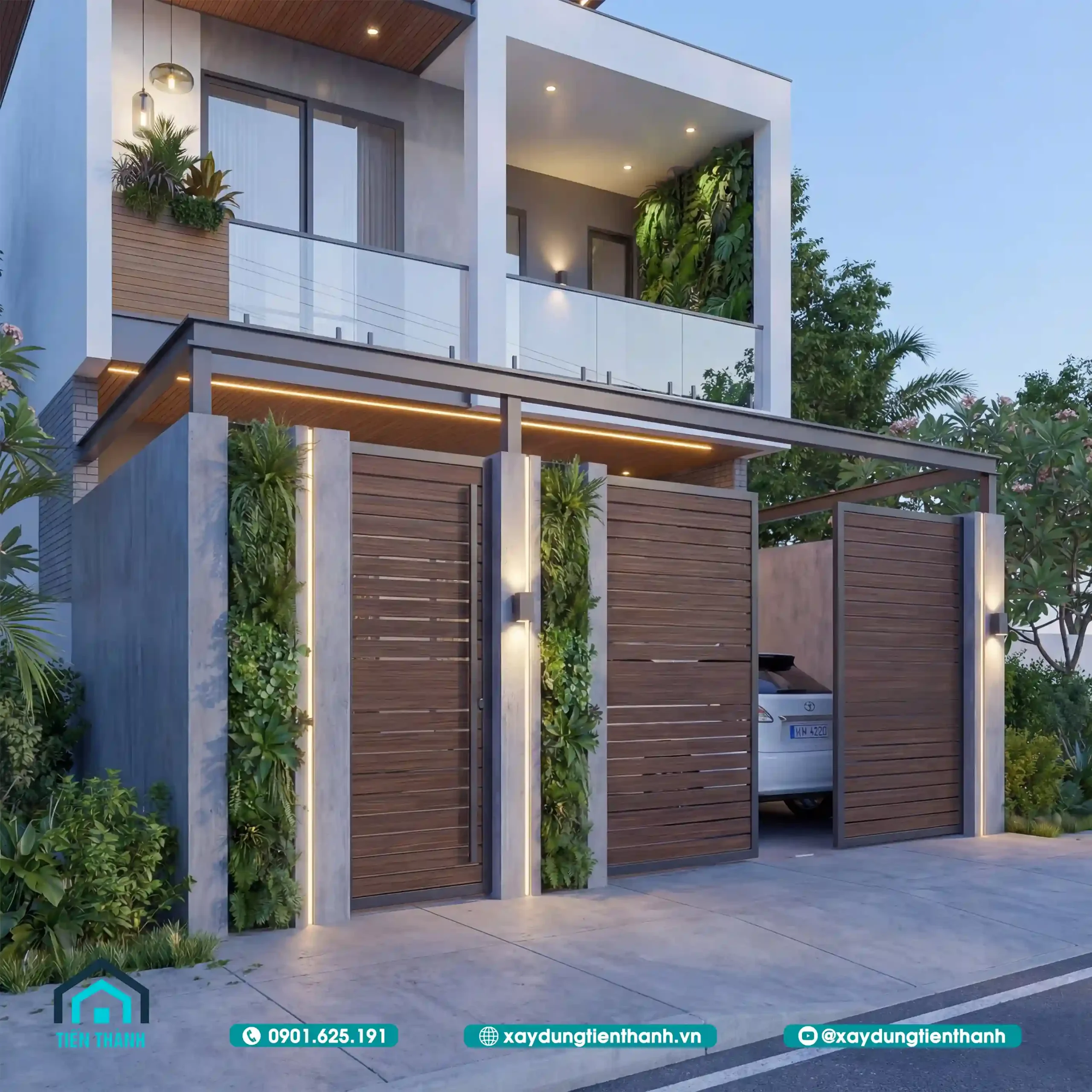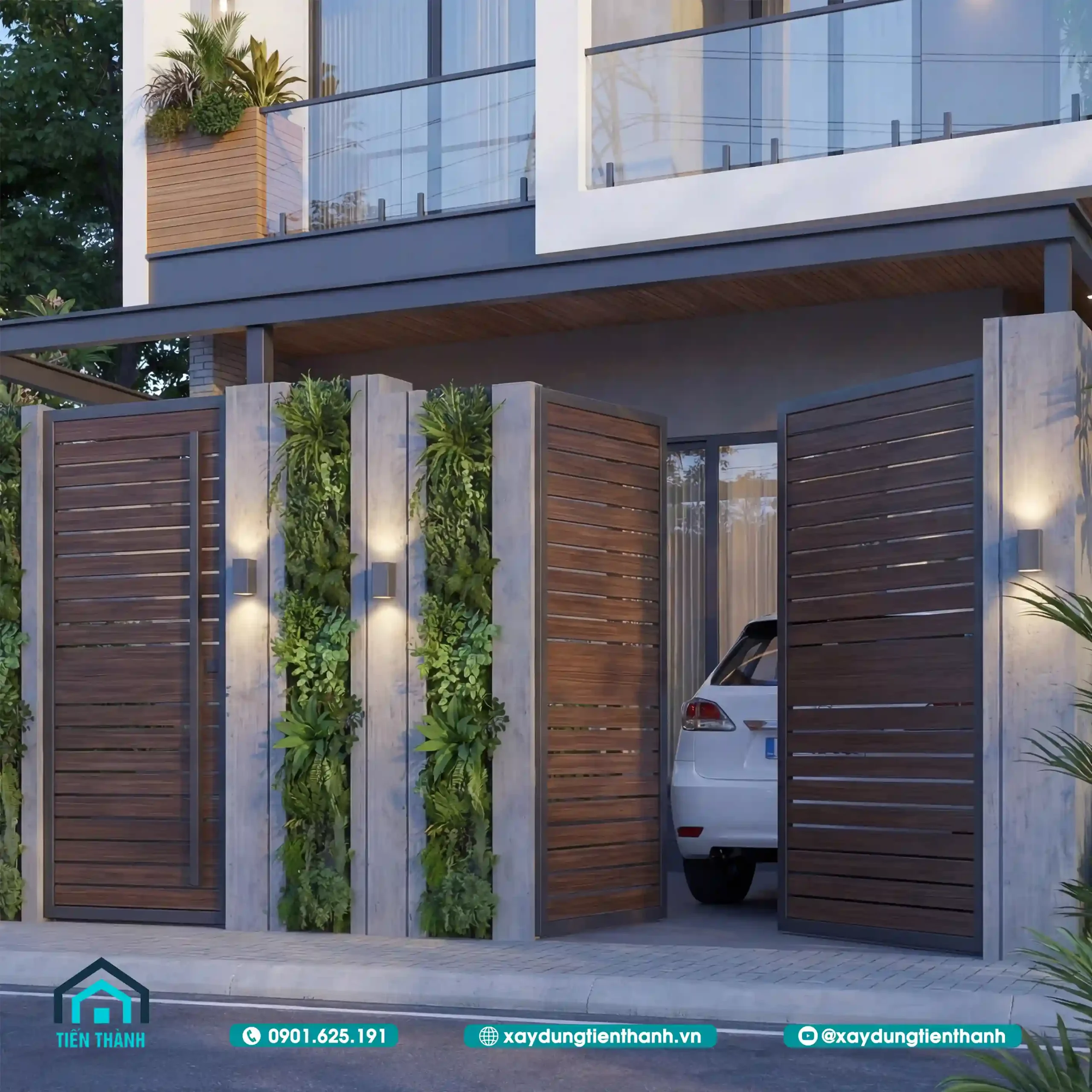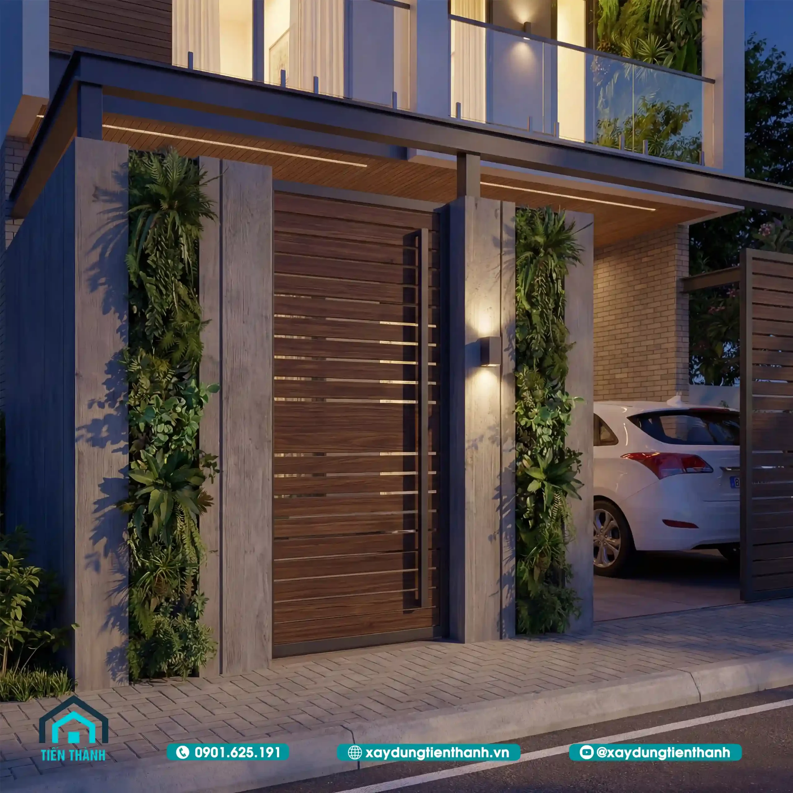 Hệ cổng rào được thiết kế đồng bộ với kiến trúc nhà, tích hợp thêm các trụ cây xanh.