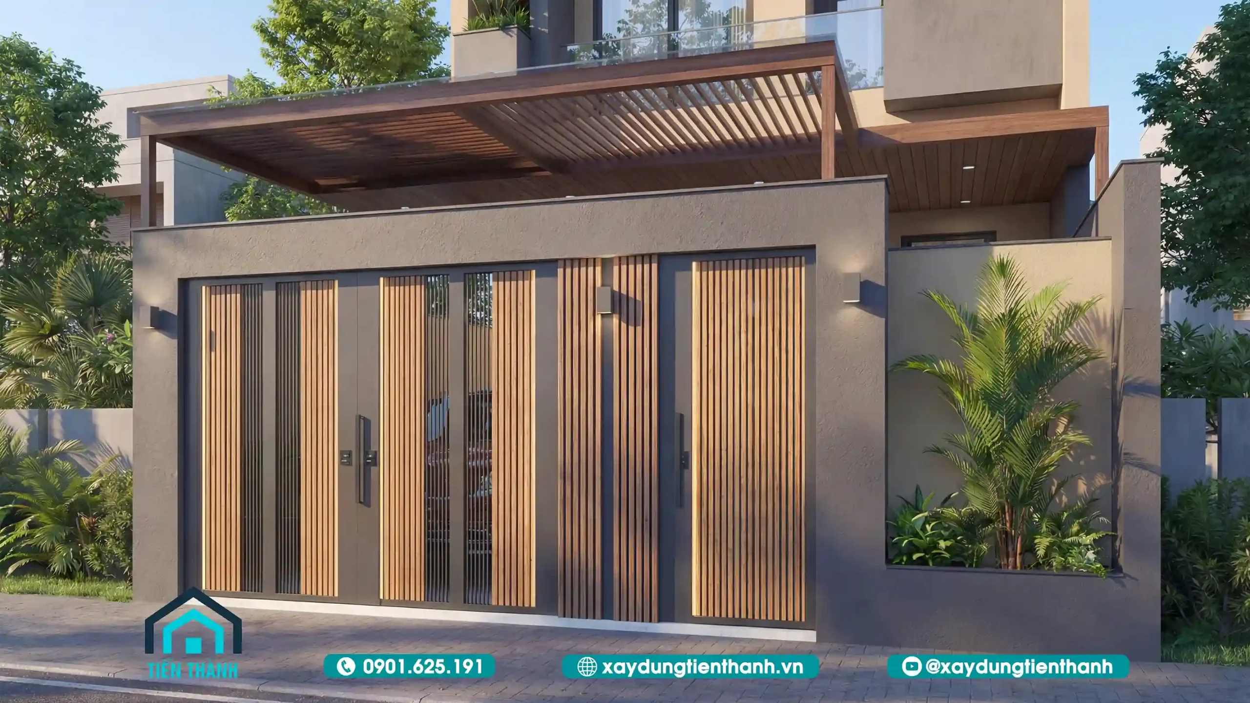 Điểm nhấn đầu tiên chính là hệ thống cổng chính. Sự kết hợp giữa tông màu xám trung tính của sơn tường và những nan gỗ nâu ấm áp tạo nên một cái nhìn thiện cảm ngay từ cái nhìn đầu tiên.
