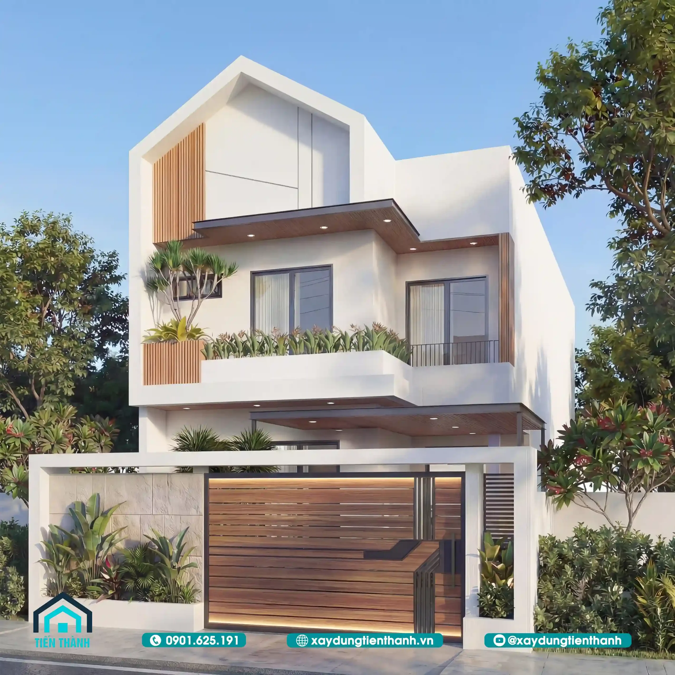Mặt tiền được chia thành hai khối kiến trúc chính. Một bên là khối nhà mái nhọn cách điệu tạo điểm nhấn về chiều cao, bên còn lại là khoảng ban công rộng rãi với hệ cây xanh mướt. Sự tương phản giữa màu trắng chủ đạo và màu nâu của gỗ mang lại cảm giác ấm cúng nhưng không kém phần thời thượng.