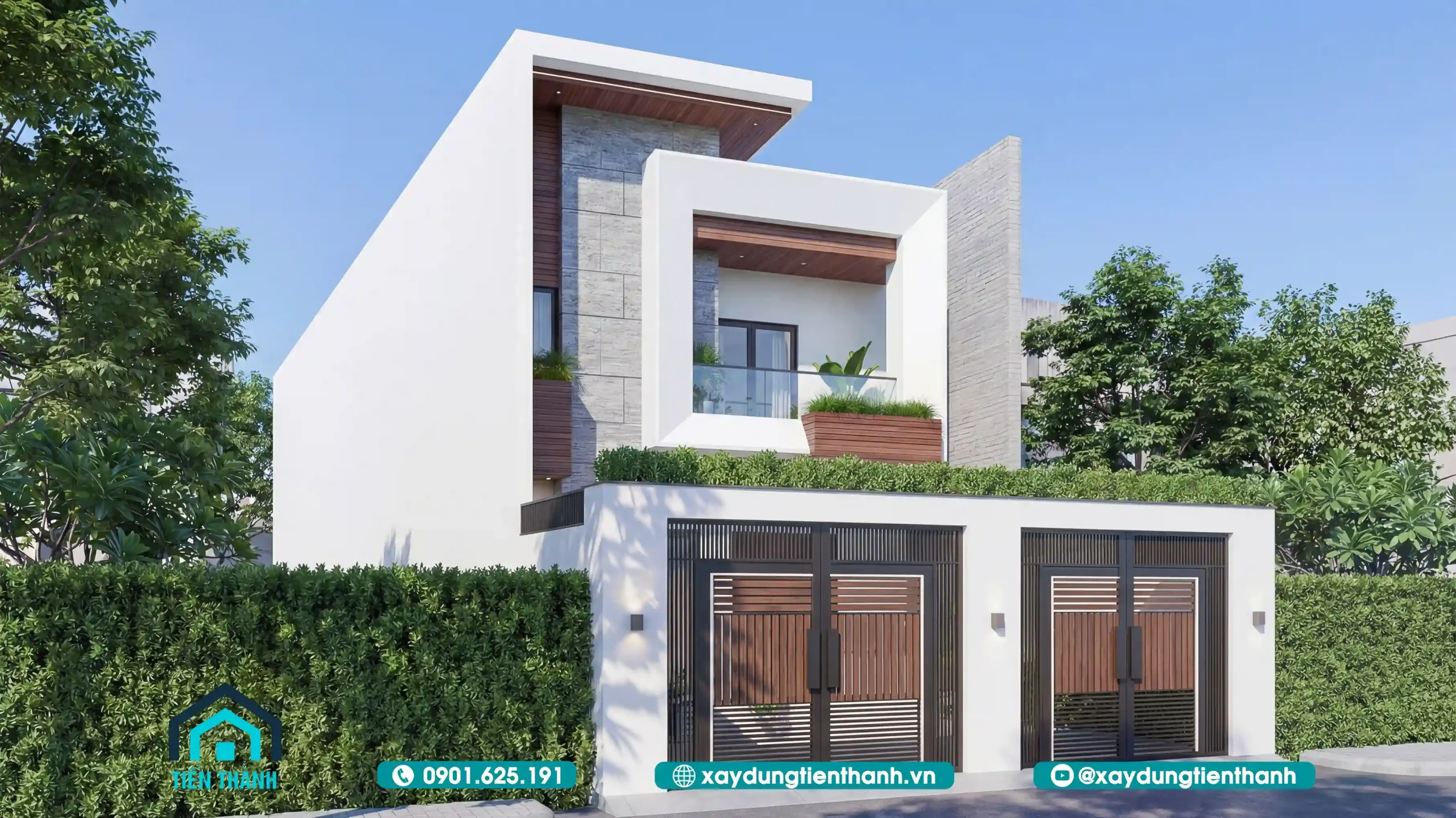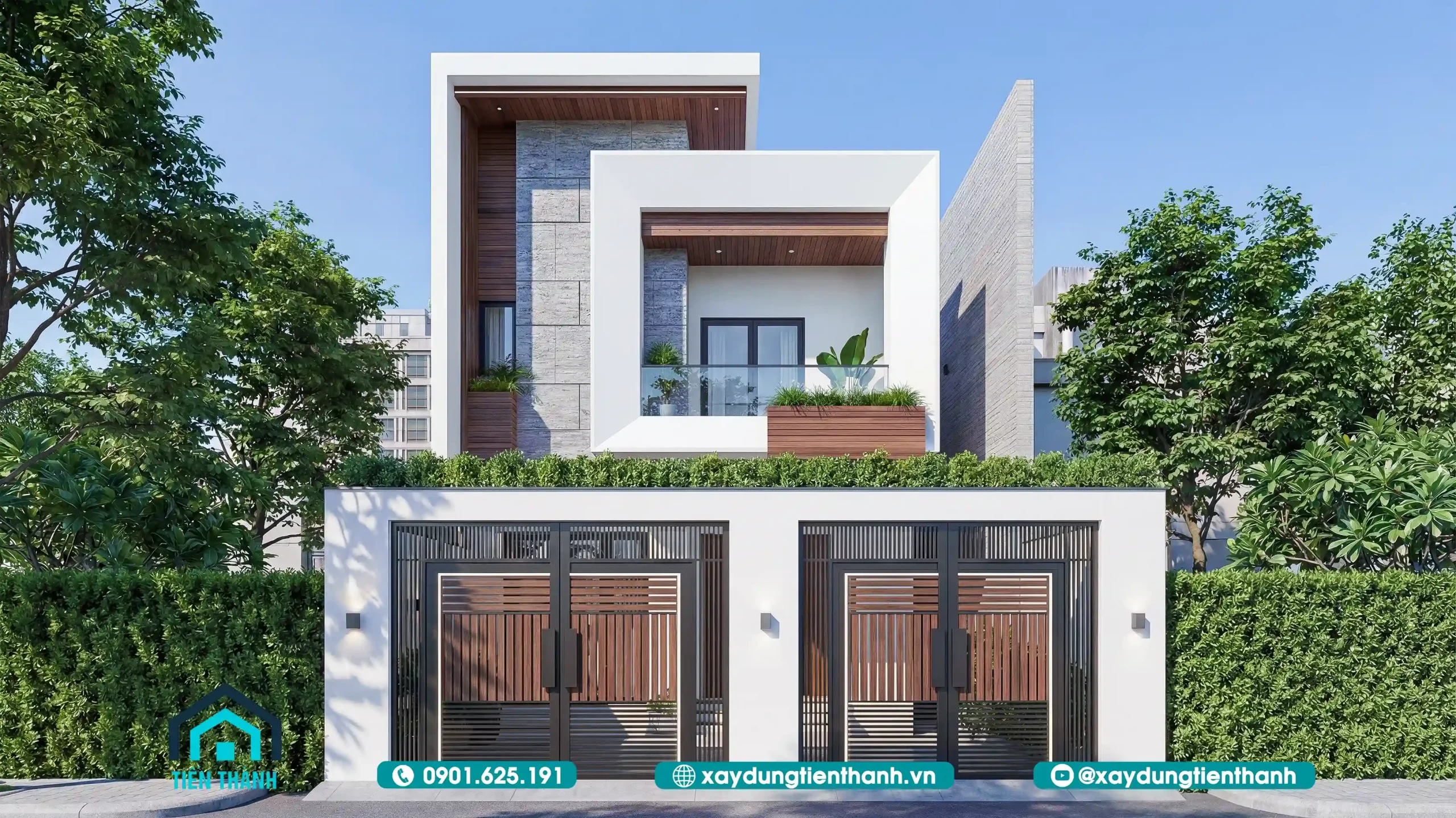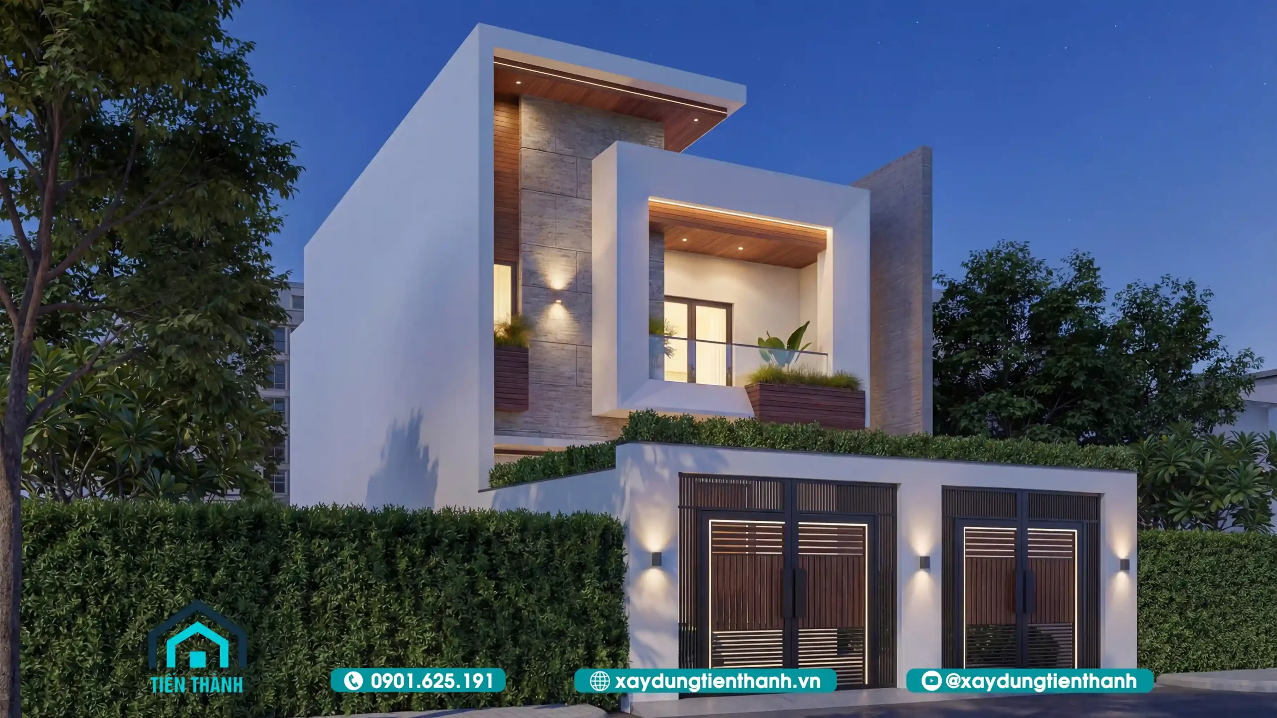 Phối cảnh tổng thể mẫu nhà 2 tầng mặt tiền 8m phong cách hiện đại sang trọng.