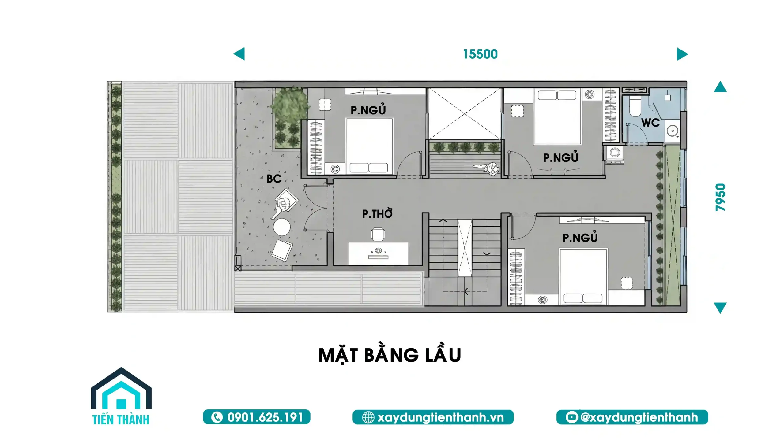 - Ban công (BC): Một khoảng sân thượng nhỏ phía trước phòng thờ không chỉ giúp lưu thông không khí mà còn là nơi gia chủ có thể thư giãn, trồng hoa hoặc nhâm nhi tách trà vào buổi tối.