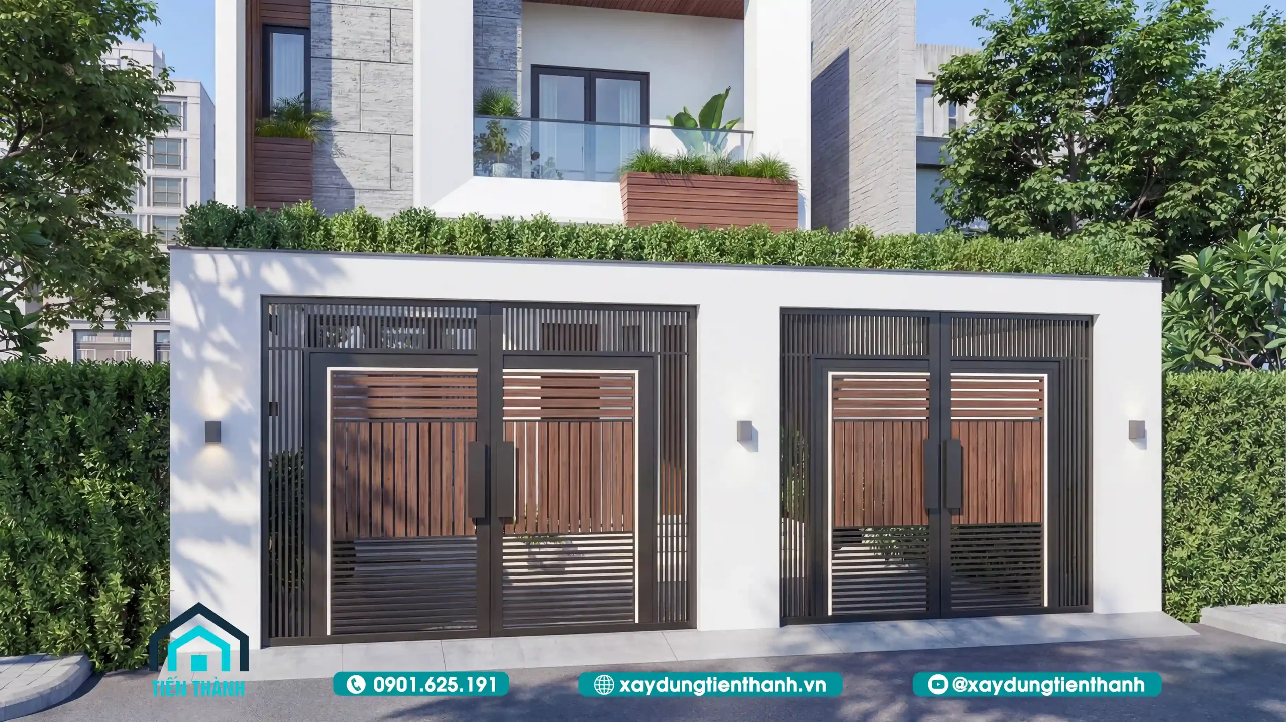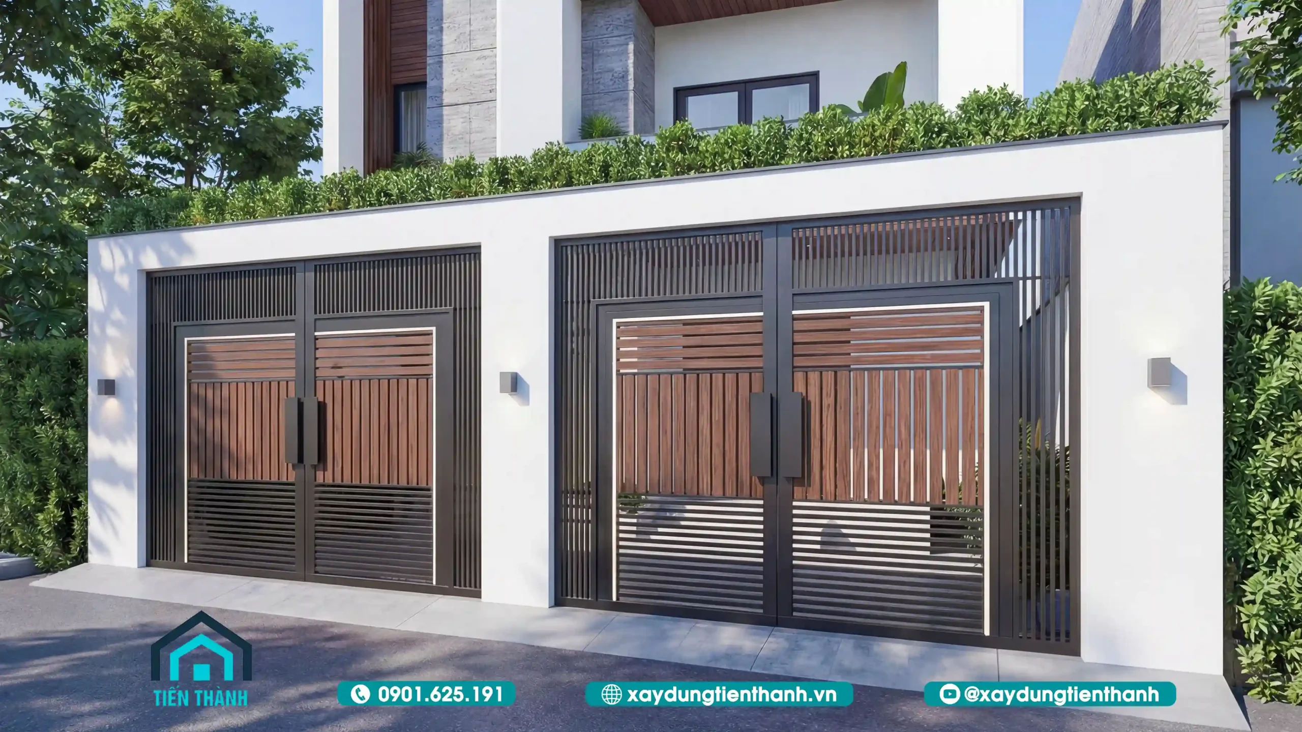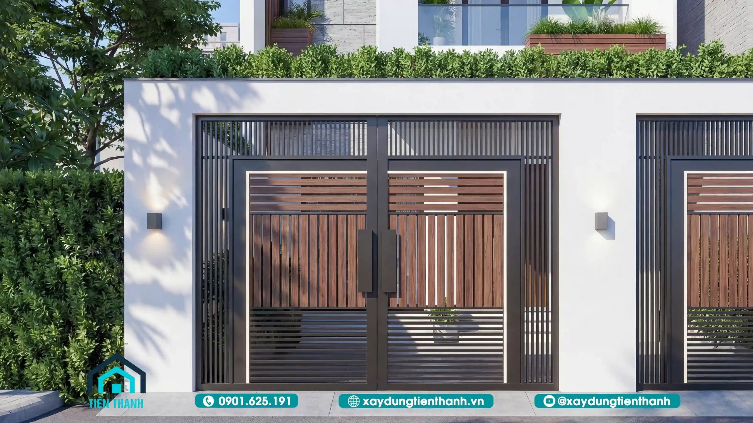 - Chất liệu: Cửa cổng sử dụng khung thép sơn tĩnh điện đen kết hợp với nan gỗ nhựa. Sự kết hợp này mang lại cảm giác chắc chắn nhưng không hề nặng nề, phù hợp với tổng thể hiện đại của ngôi nhà.