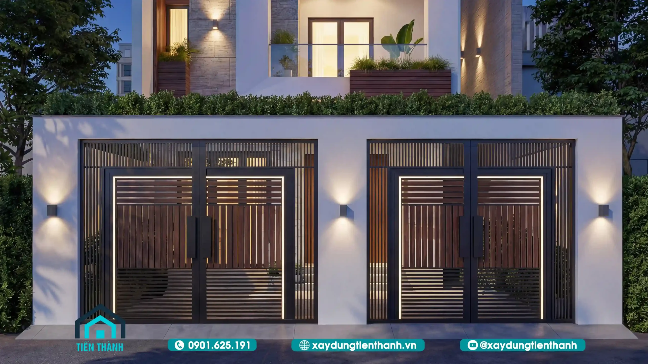 Dưới ánh sáng đèn, các nan cửa cổng cũng hiện lên rõ nét hơn. Việc kết hợp đèn tường tại các trụ cổng giúp đảm bảo an ninh, đồng thời giúp khách đến chơi nhà dễ dàng nhận diện địa chỉ.