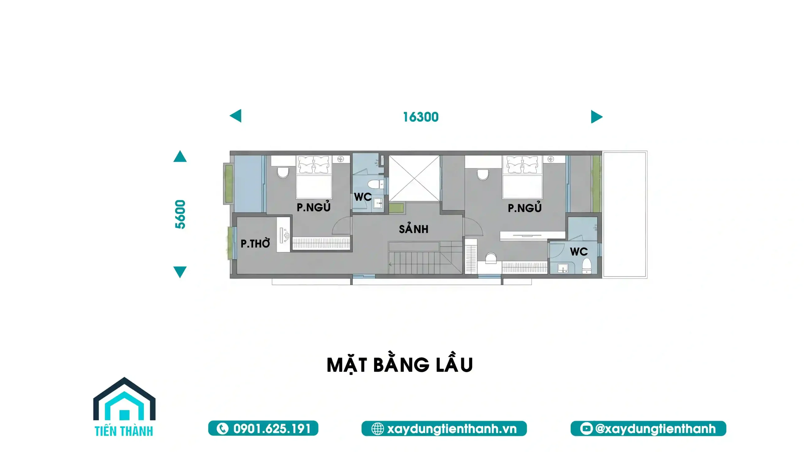 - Hệ thống phòng ngủ: Gồm 2 phòng ngủ lớn được trang bị vệ sinh riêng (WC). Khoảng sảnh thang rộng rãi có thể tận dụng làm nơi sinh hoạt chung hoặc góc đọc sách cho con cái.