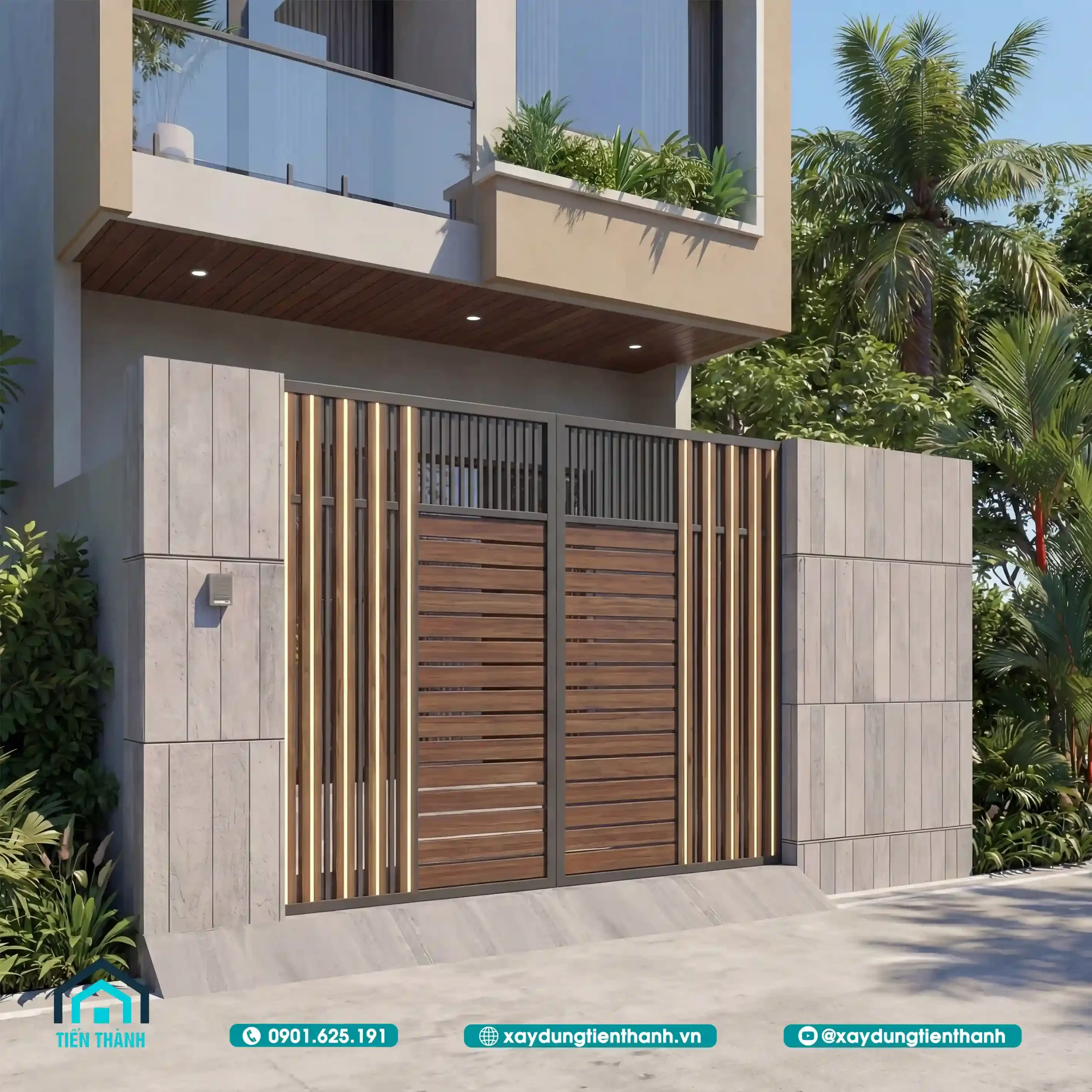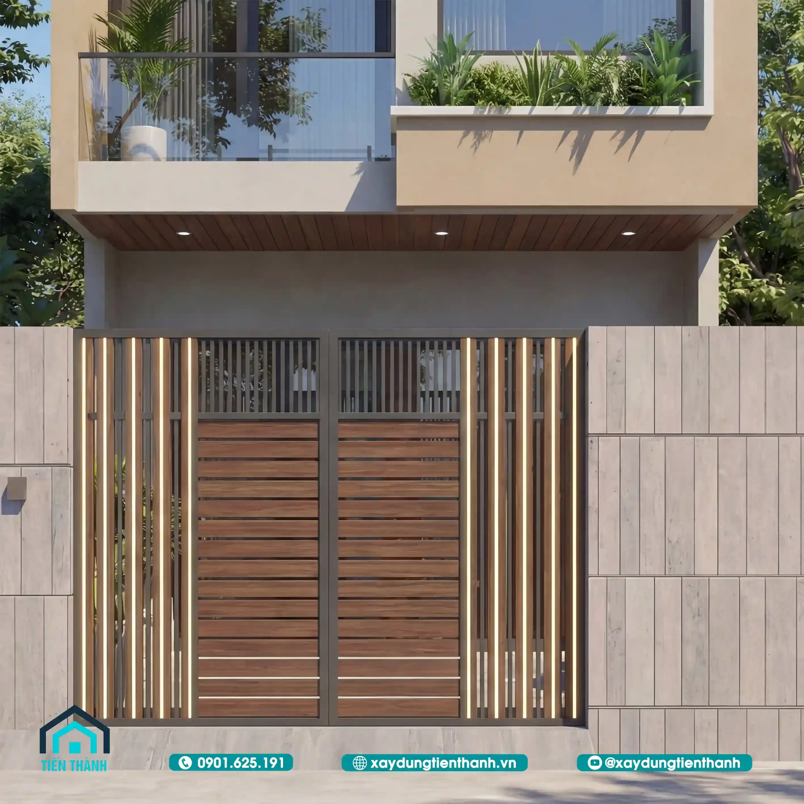 Cổng chính được thiết kế tinh xảo với các thanh gỗ dọc tích hợp đèn LED.