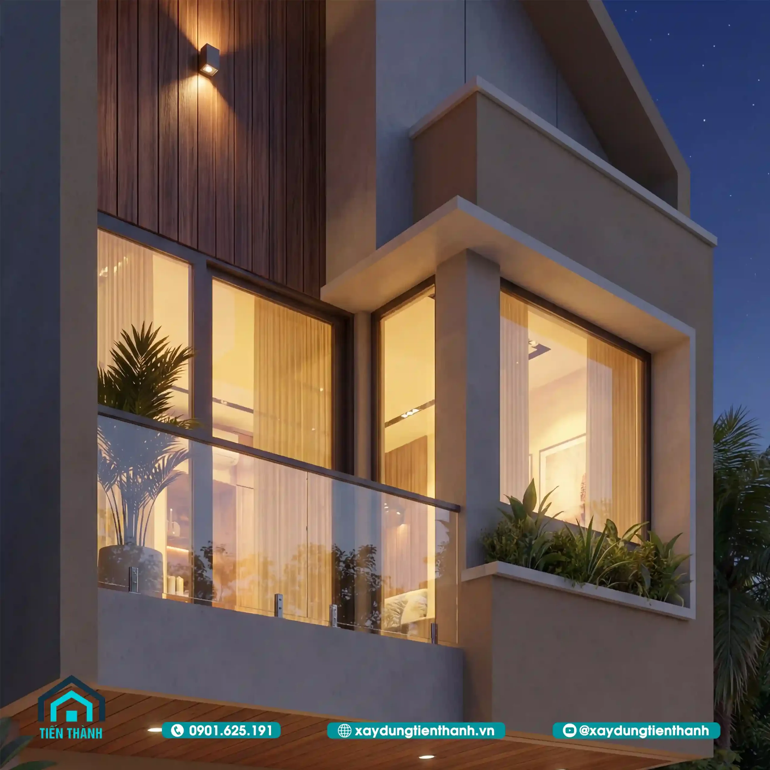 Cận cảnh ban công tầng hai với sự ấm áp lan tỏa từ ánh đèn nội thất.