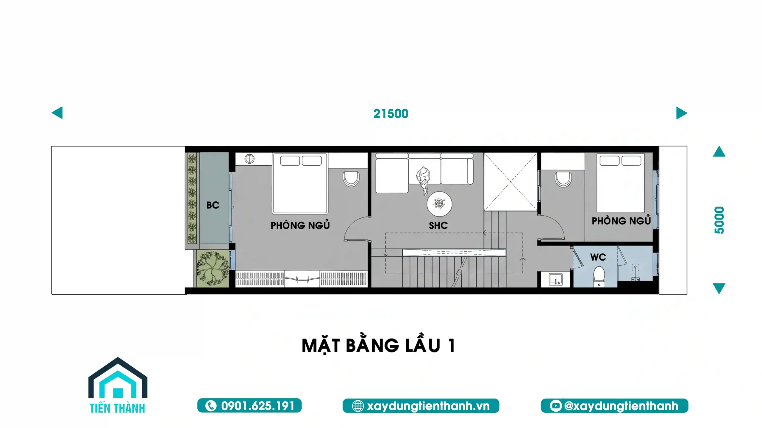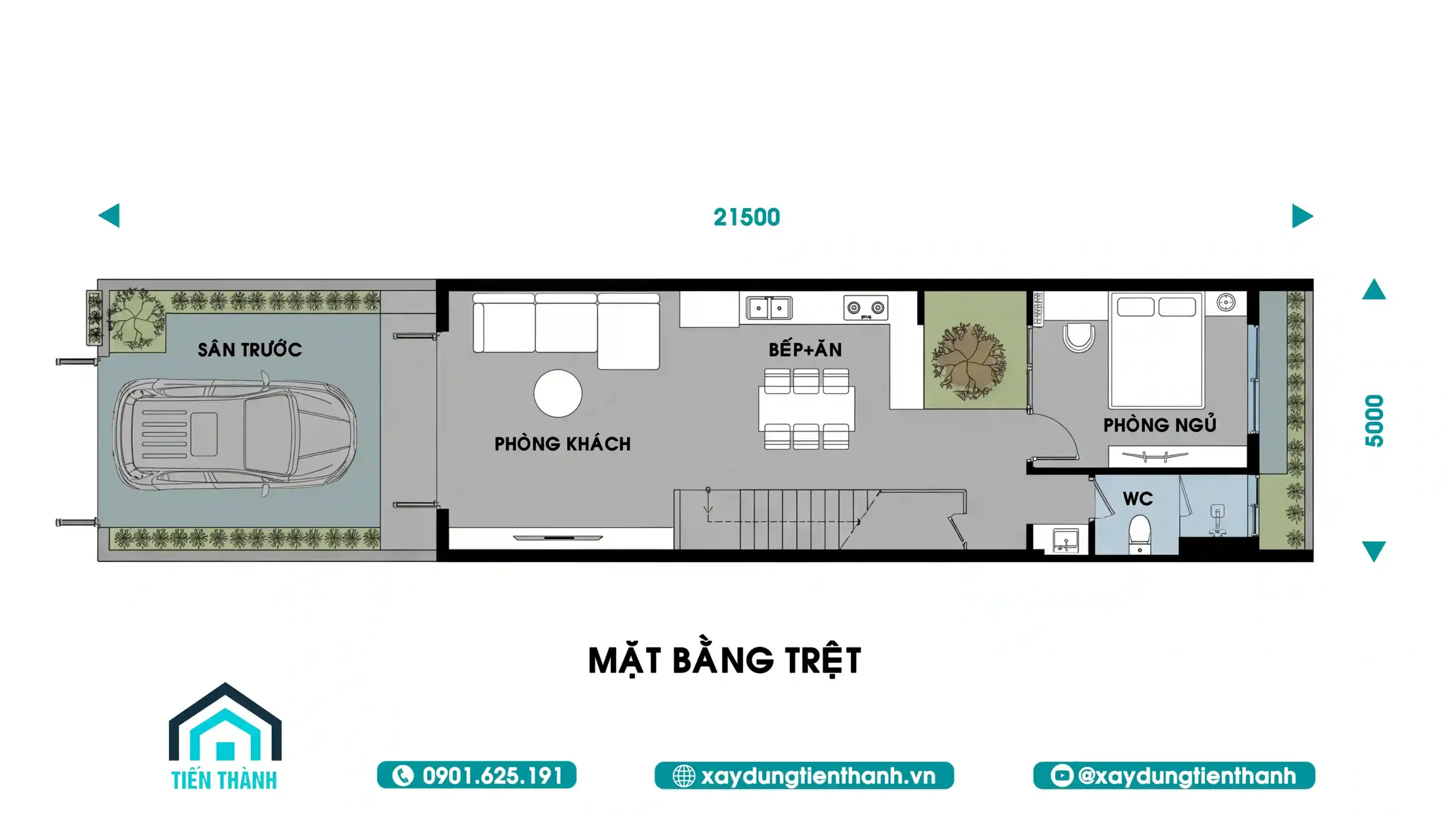 - Diện tích lý tưởng: Chiều ngang 5m vừa đủ để phân chia các khu vực chức năng mà không bị quá hẹp. Chiều sâu 20m là lợi thế lớn để tạo ra các khoảng sân vườn hoặc giếng trời.