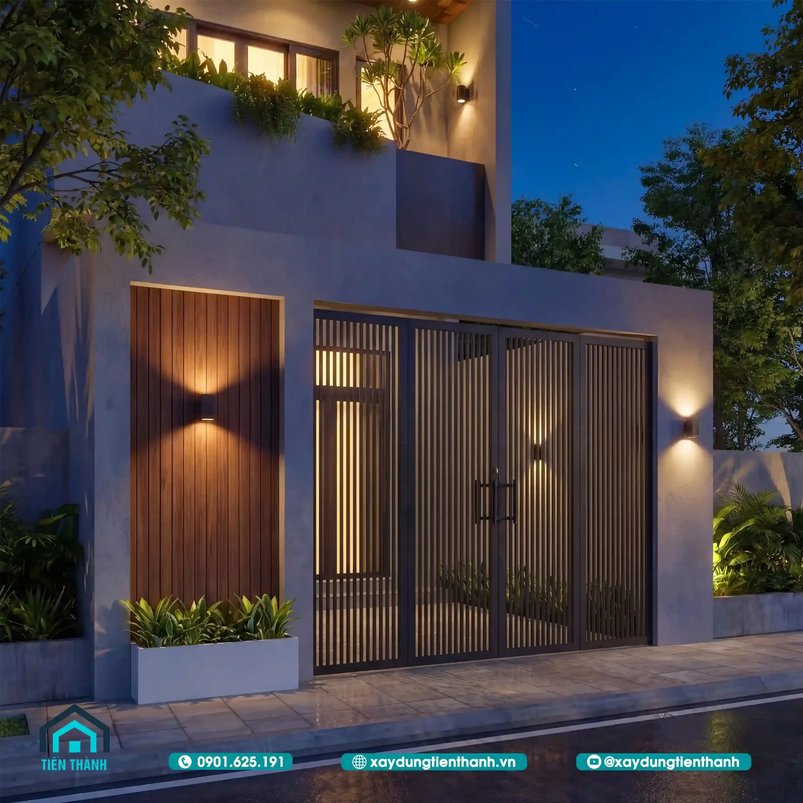 Khi lên đèn, sự đồng bộ giữa hệ cổng và mặt tiền nhà trở nên rõ nét hơn. Đèn hắt tại mảng tường gỗ cổng chính không chỉ có tác dụng dẫn hướng. Mà còn là điểm nhấn thị giác ấn tượng cho bất kỳ ai đi ngang qua.