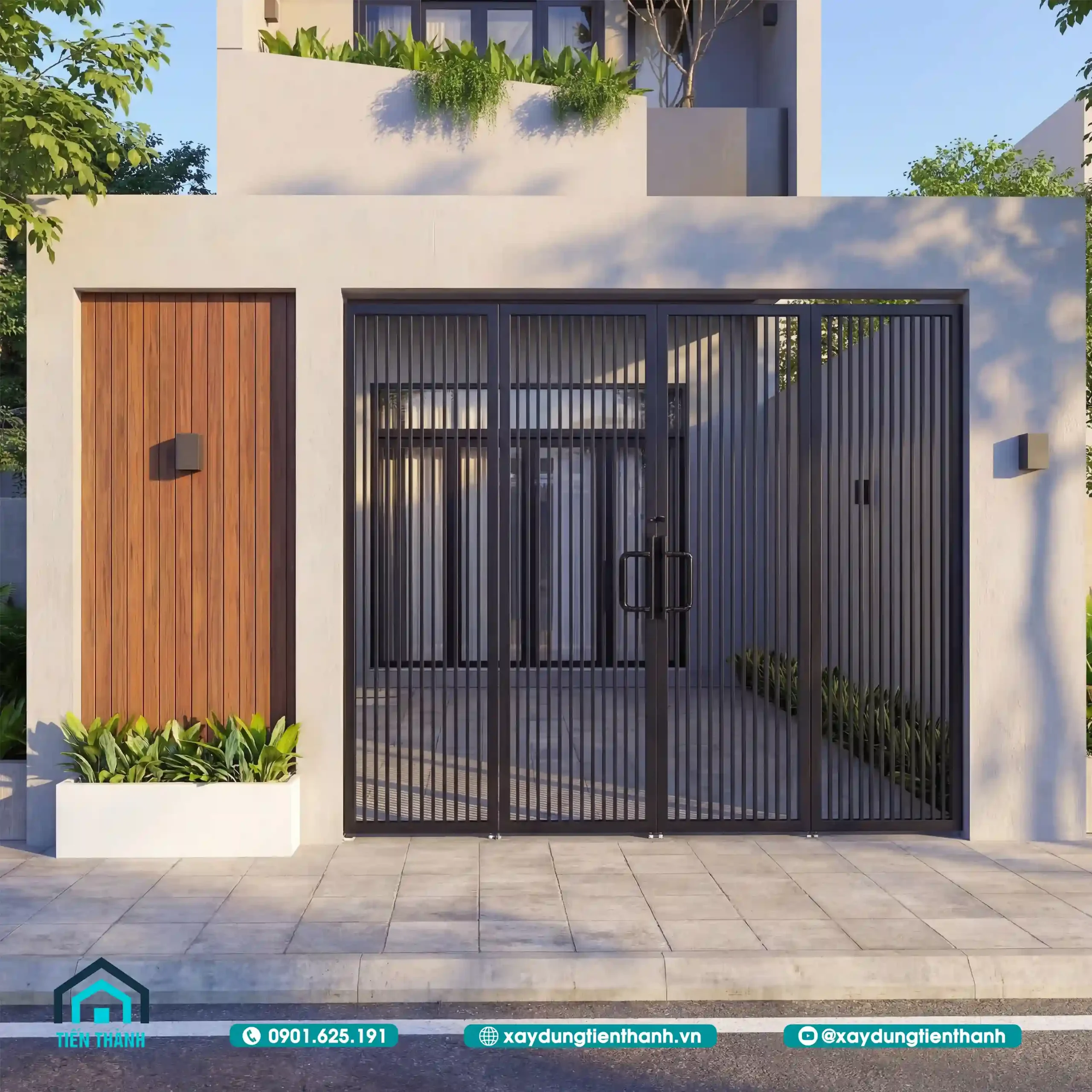 Cận cảnh cổng sắt hiện đại phối cùng mảng tường trang trí giả gỗ vô cùng sang trọng.