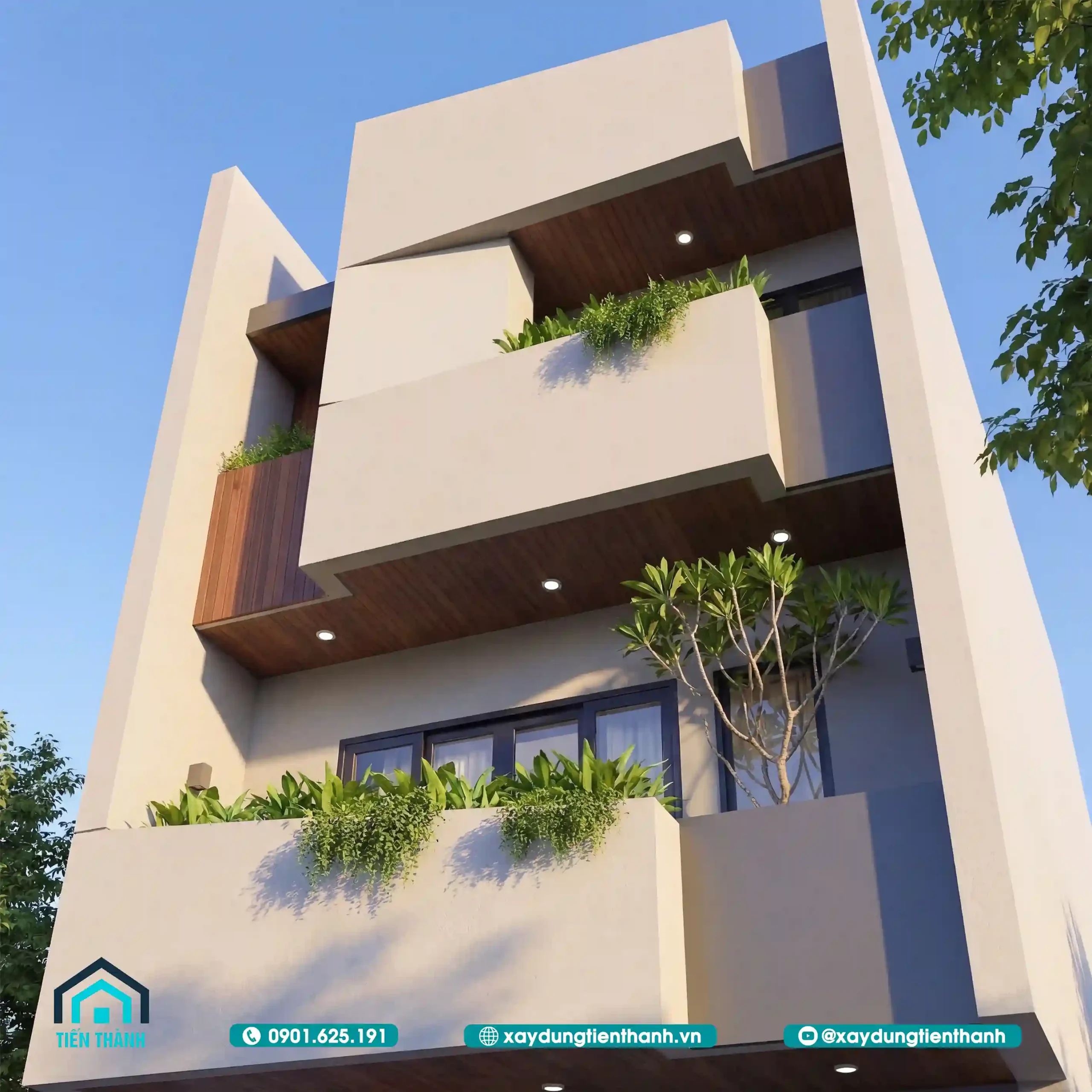 Sự sáng tạo trong thiết kế nhà 5×20 3 phòng ngủ này nằm ở cách sắp đặt các mảng đặc và rỗng. Những mảng tường lớn nhô ra không chỉ tạo bóng đổ tự nhiên cho cửa sổ mà còn là nơi che chắn mưa gió hiệu quả cho ban công phía dưới.