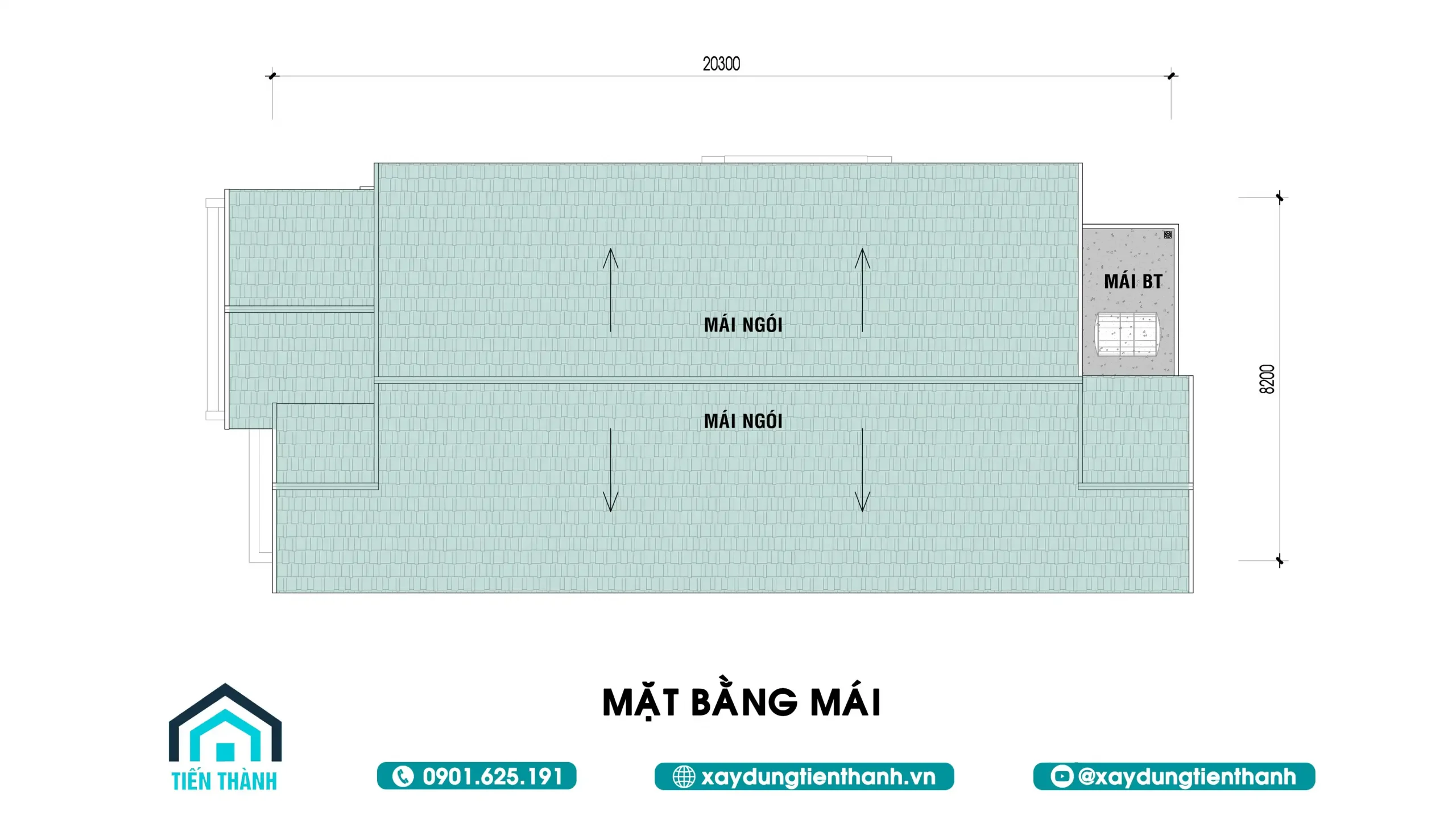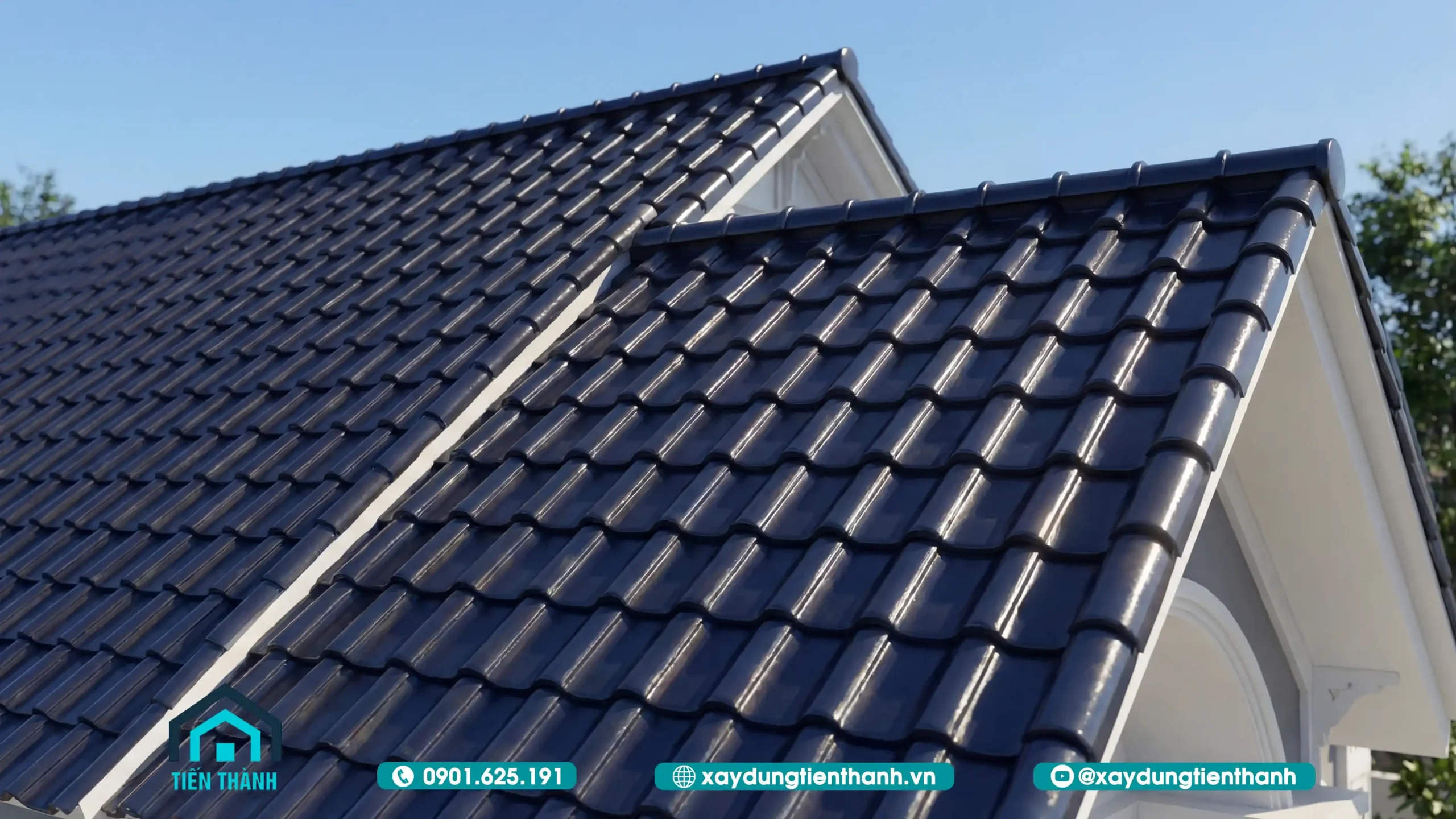 Hệ mái được thi công bằng phương pháp lợp ngói trên khung kèo thép nhẹ, giúp giảm tải trọng cho móng nhà nhưng vẫn đảm bảo độ bền tuyệt đối. Màu ngói xanh đen (blue-black) là sự lựa chọn hoàn hảo để tôn lên vẻ sang trọng của sơn tường trắng, đồng thời ít hấp thụ nhiệt, giúp ngôi nhà luôn mát mẻ.