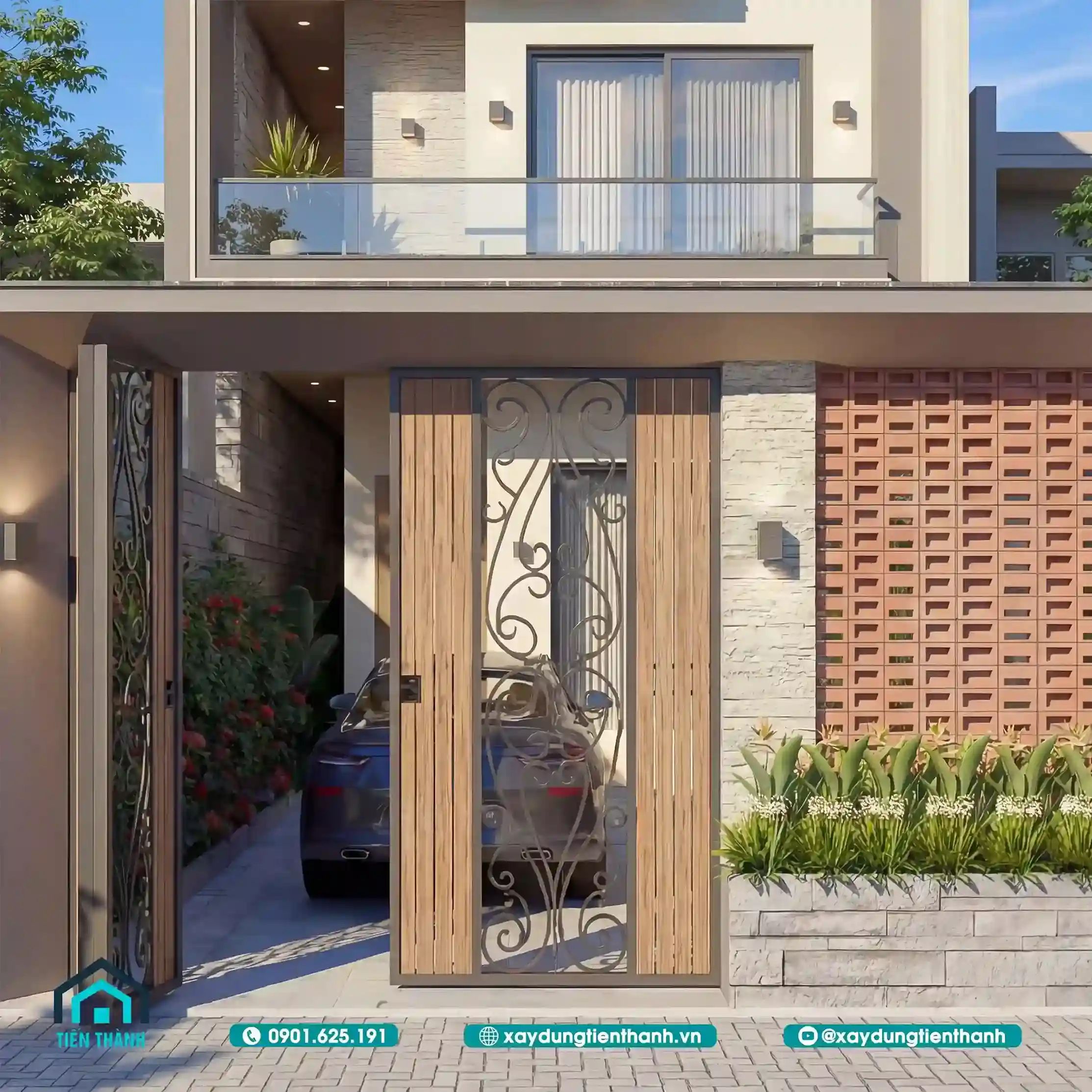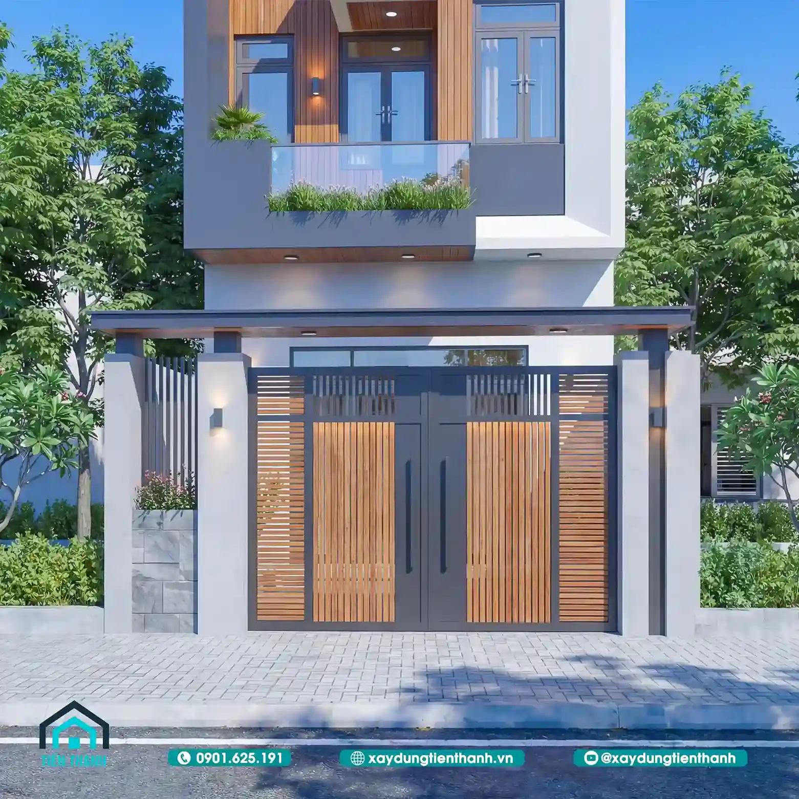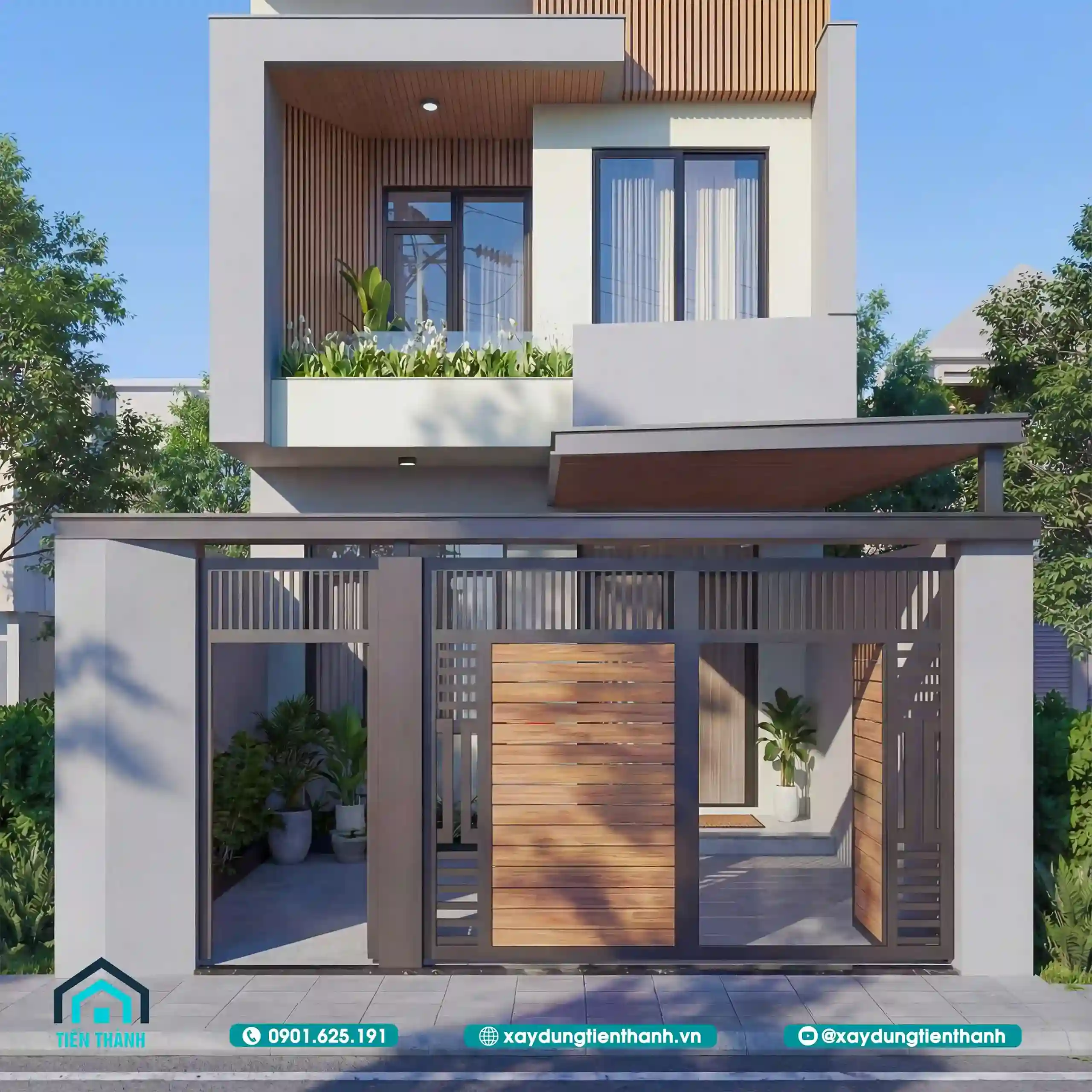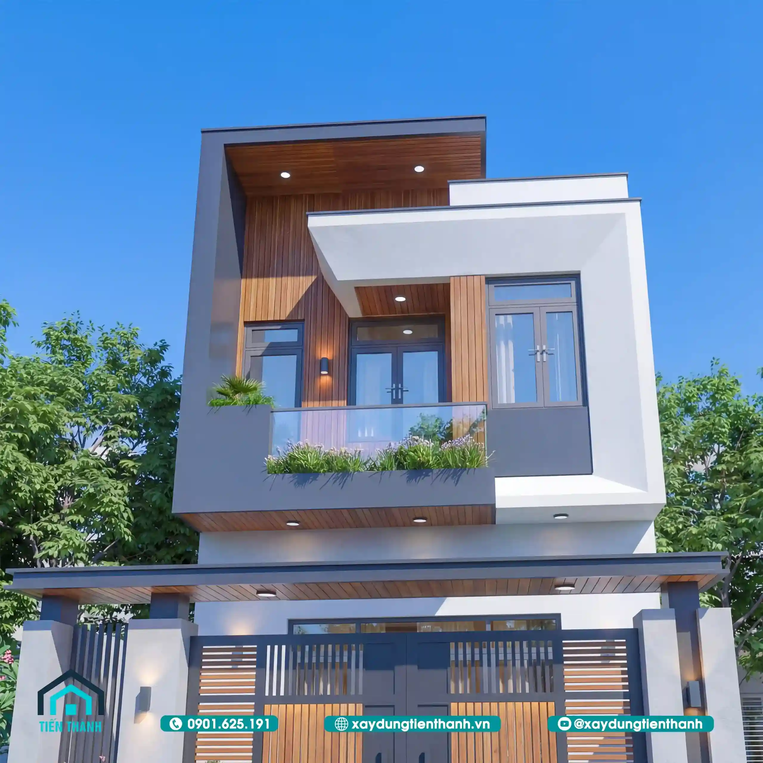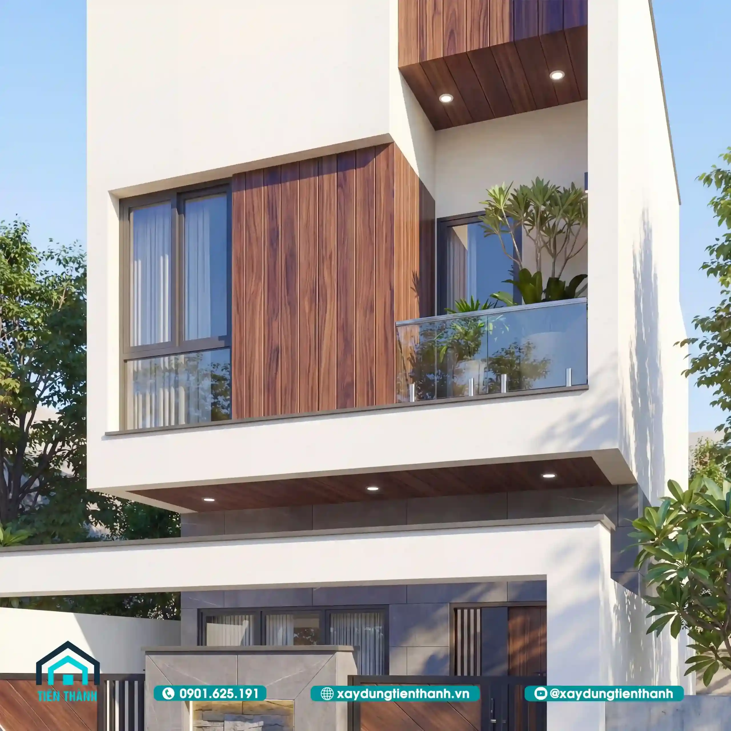 Mẫu nhà đầu tiên gây ấn tượng bởi sự sang trọng và ấm cúng. Tầng hai được tạo điểm nhấn bằng các mảng ốp gỗ công nghiệp. Sự đối lập giữa tông trắng và nâu gỗ tạo nên sức hút. Lan can kính cường lực giúp mở rộng tầm nhìn cho ban công. Hệ thống cổng sắt nghệ thuật bảo vệ an toàn tuyệt đối cho nhà.