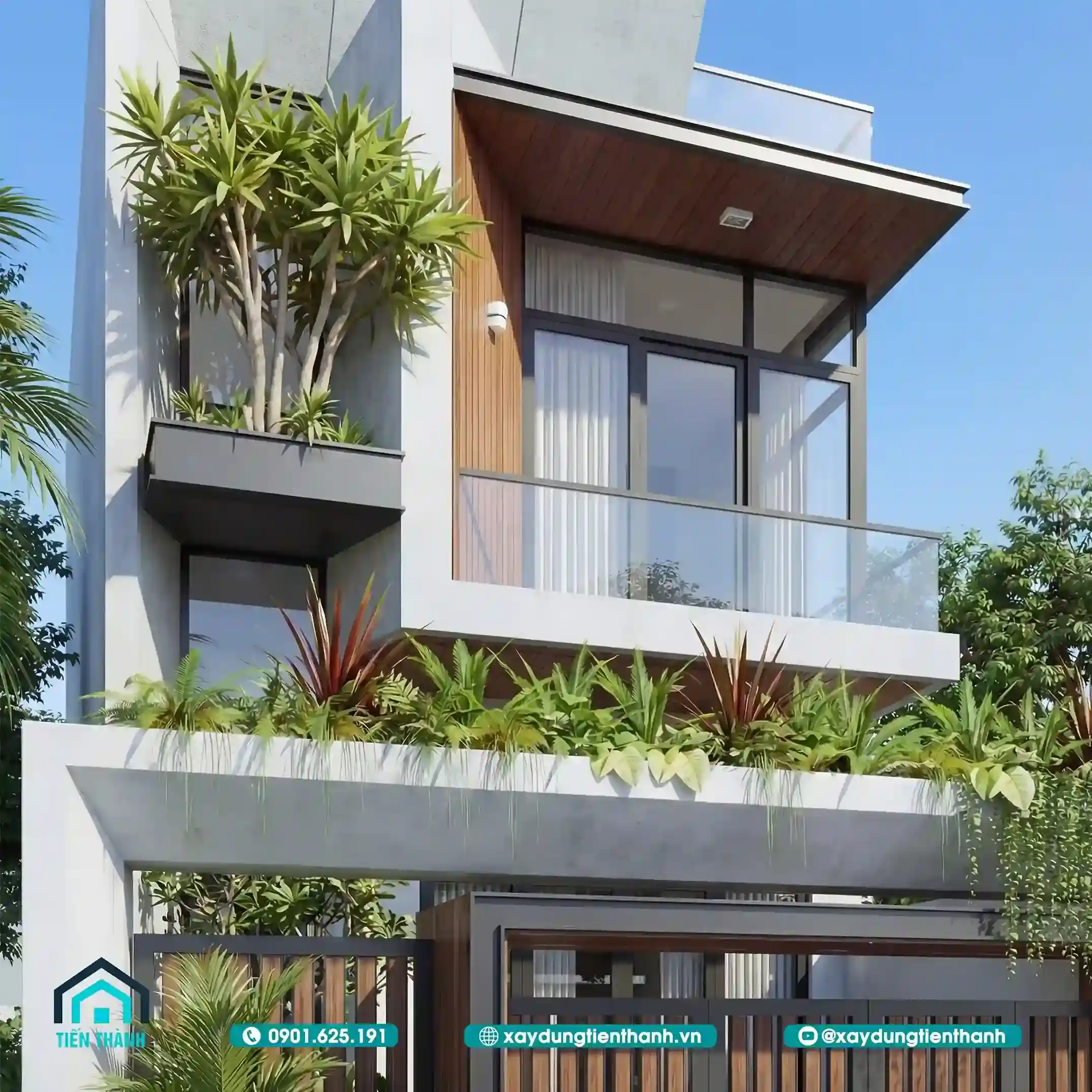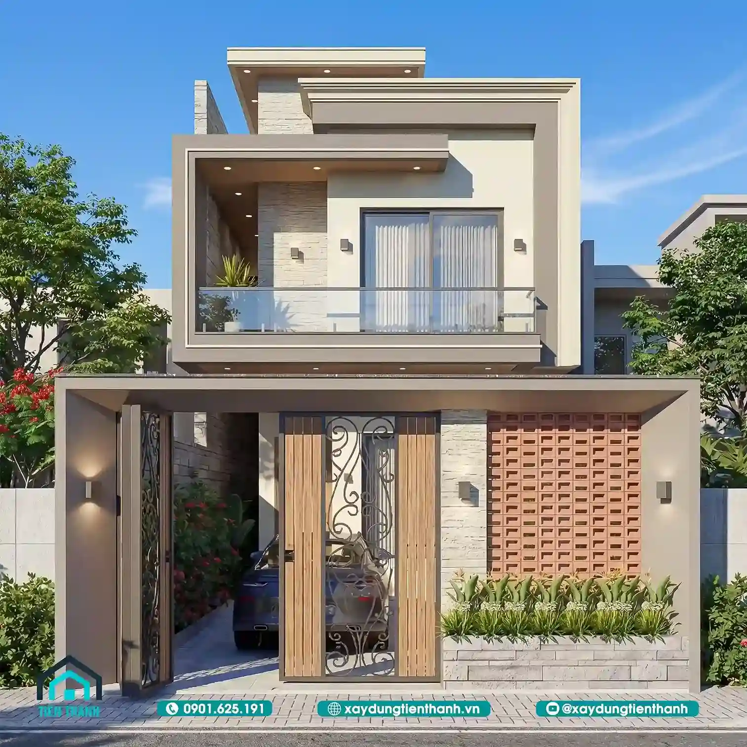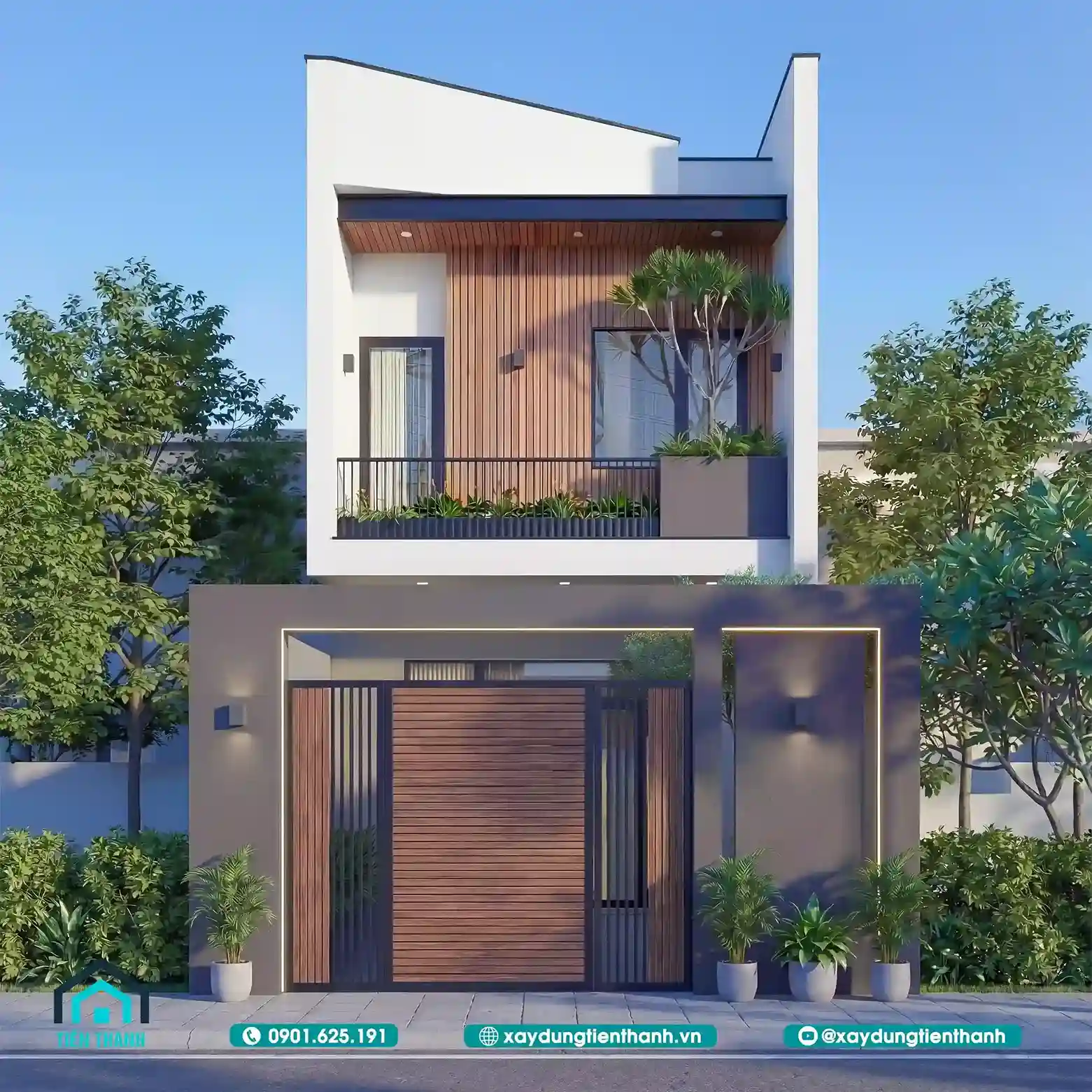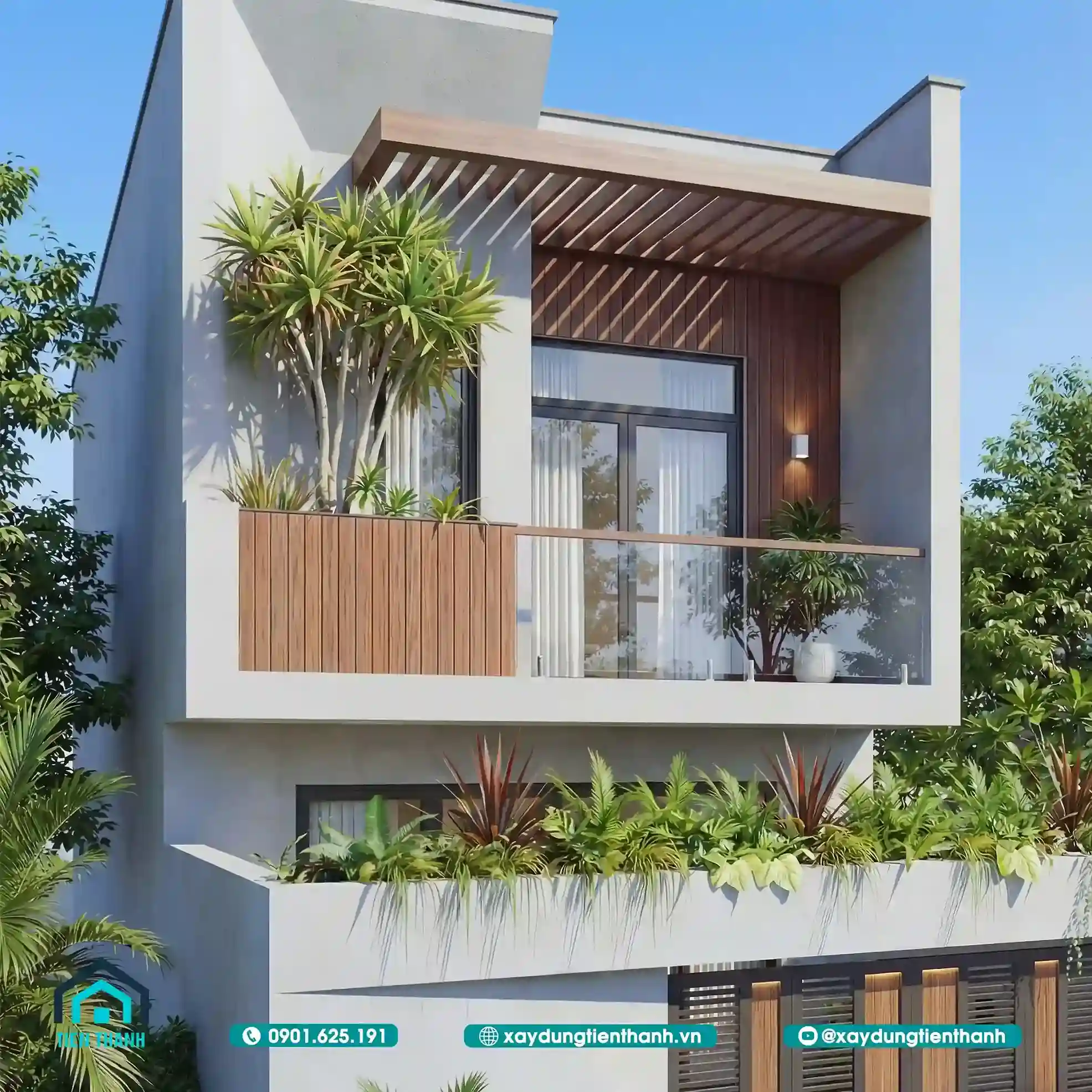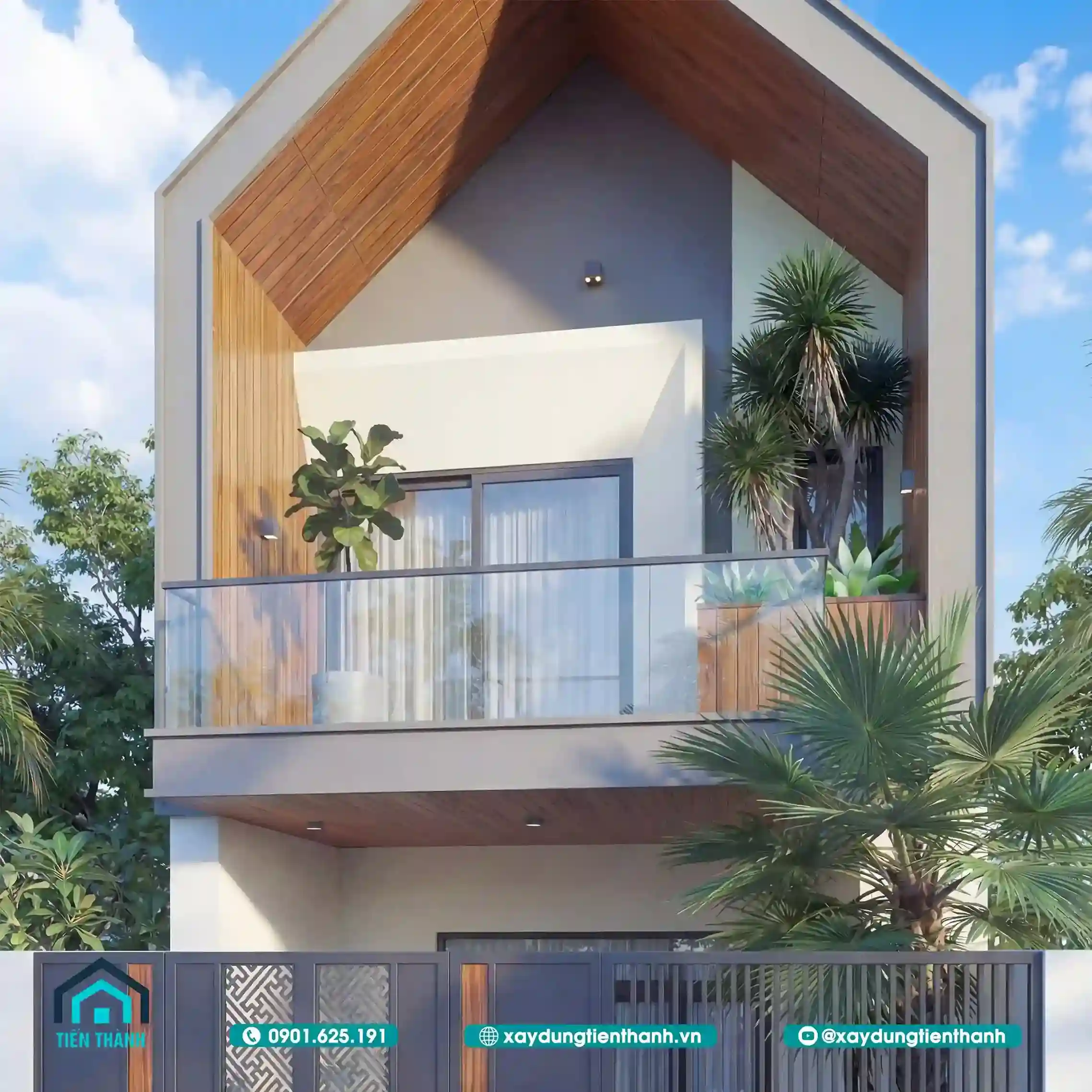 Mẫu nhà đầu tiên gây ấn tượng bởi sự sang trọng và ấm cúng. Tầng hai được tạo điểm nhấn bằng các mảng ốp gỗ công nghiệp. Sự đối lập giữa tông trắng và nâu gỗ tạo nên sức hút. Lan can kính cường lực giúp mở rộng tầm nhìn cho ban công. Hệ thống cổng sắt nghệ thuật bảo vệ an toàn tuyệt đối cho nhà.