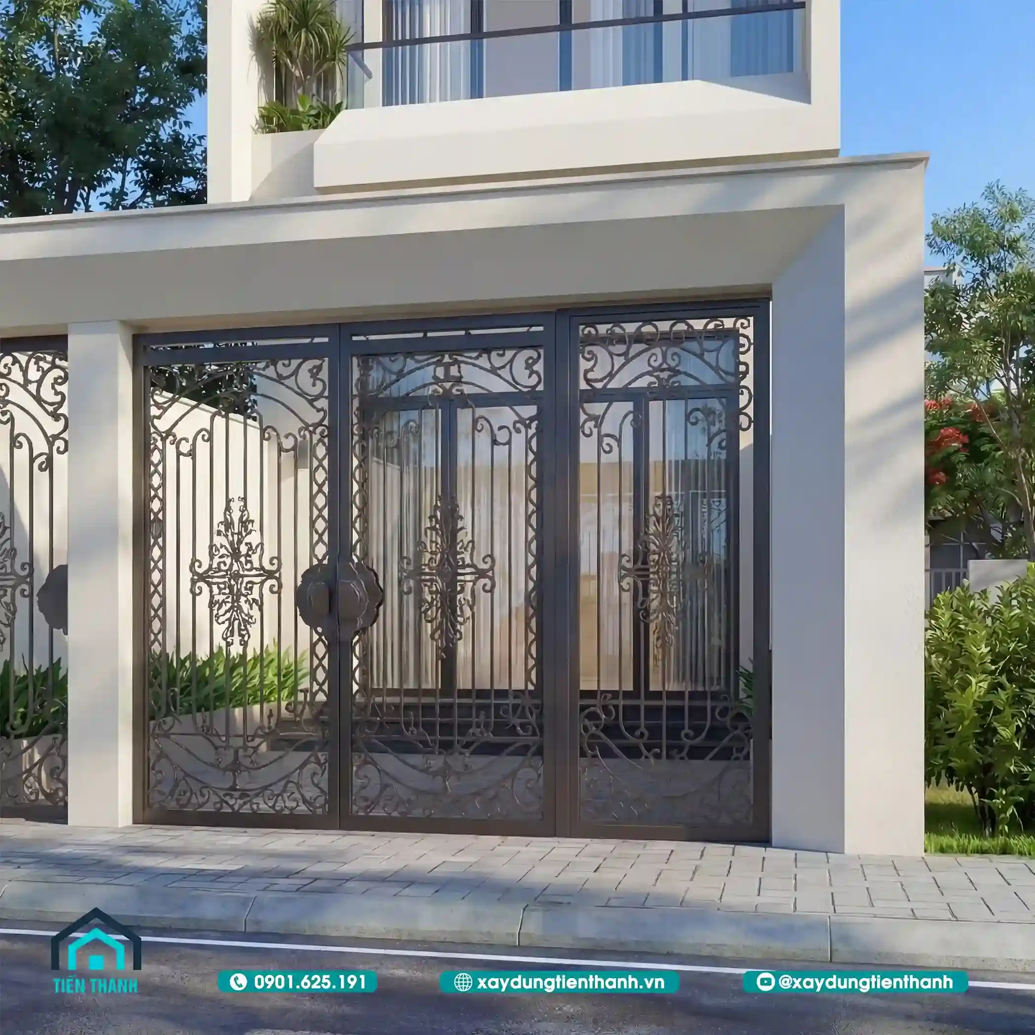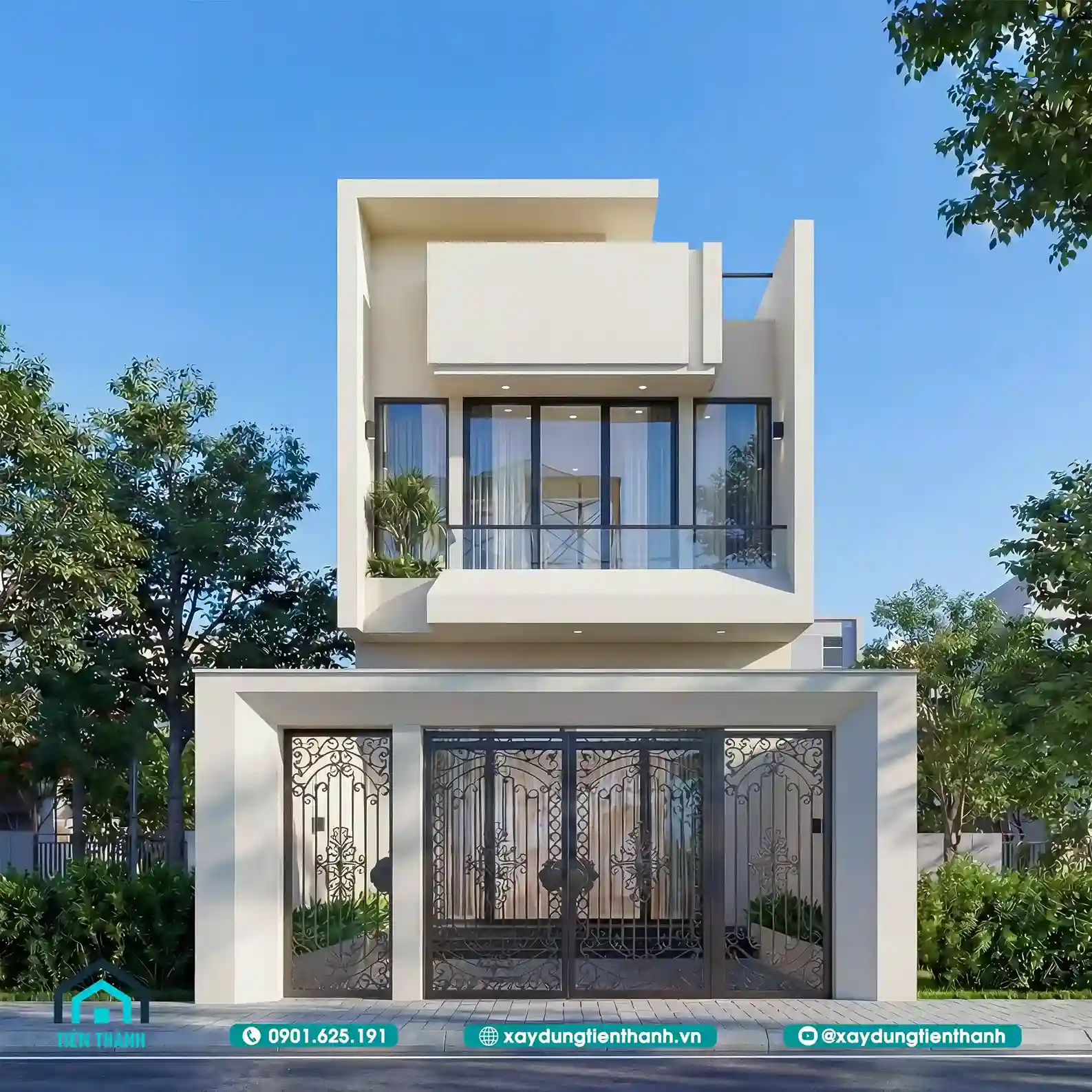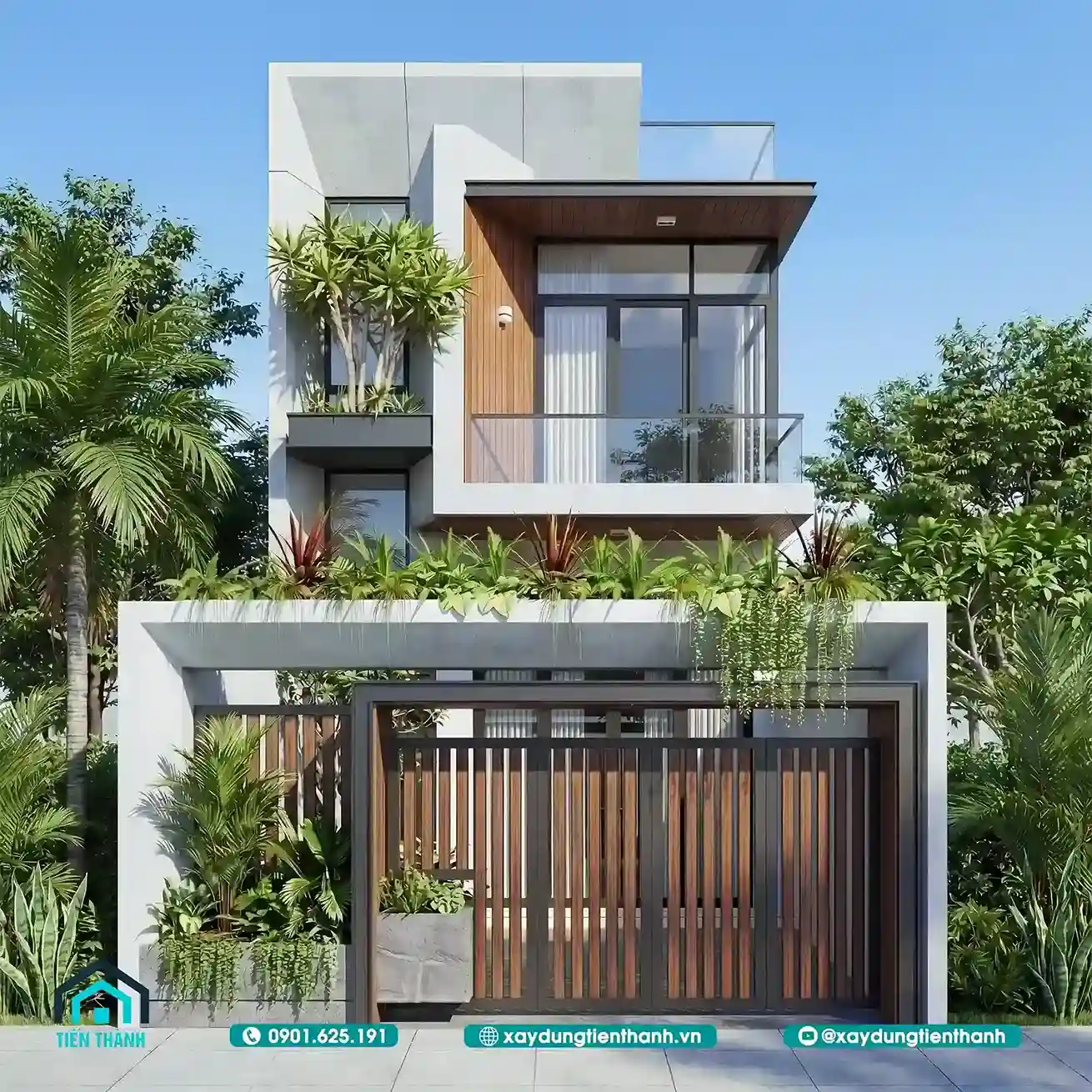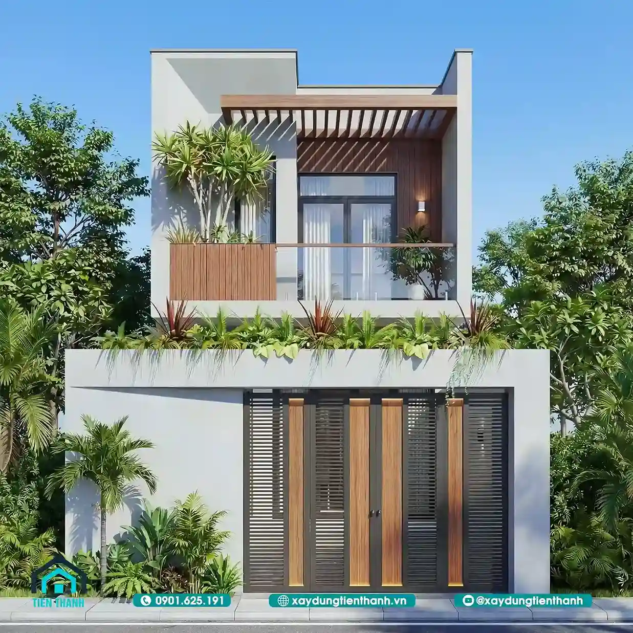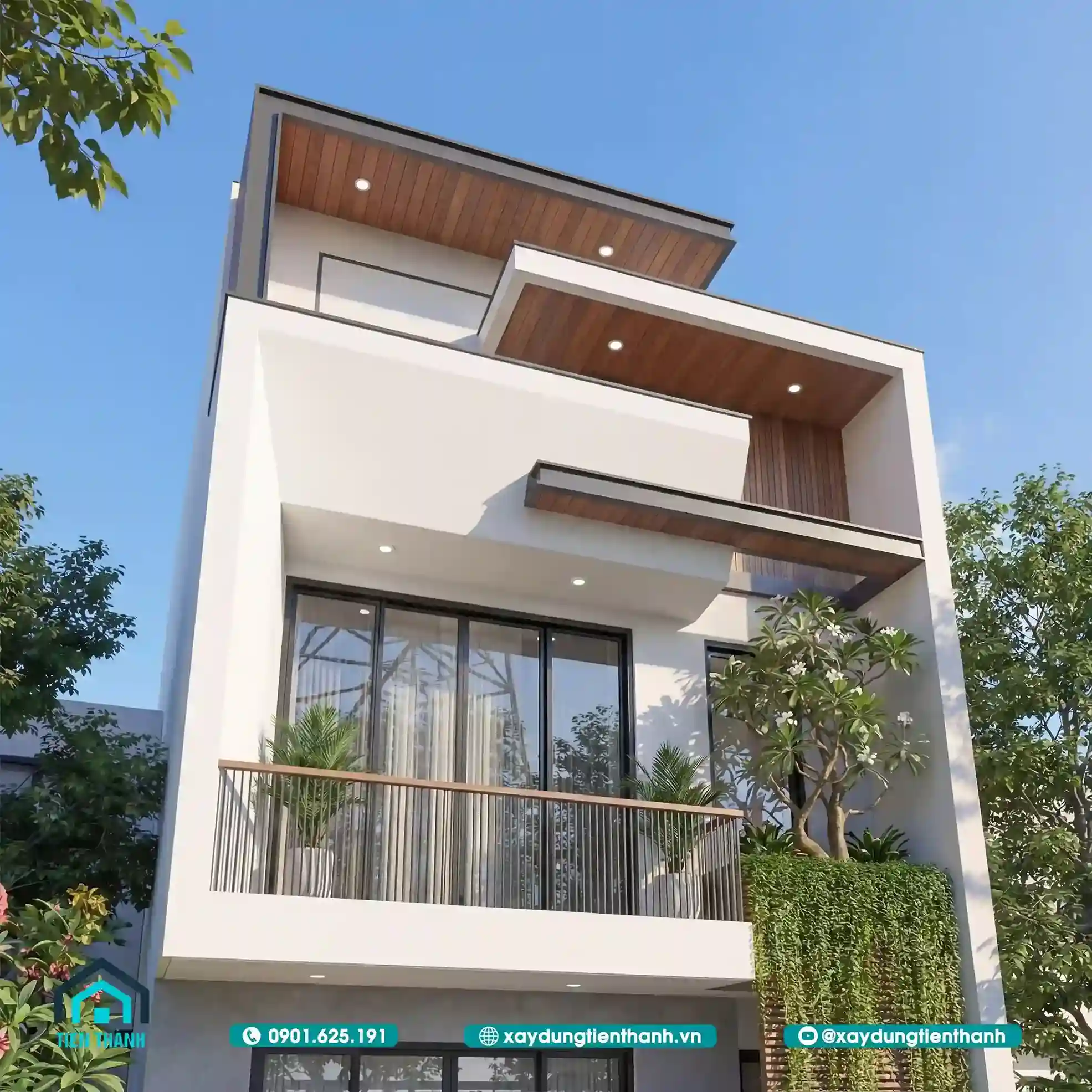 Mẫu nhà đầu tiên gây ấn tượng bởi sự sang trọng và ấm cúng. Tầng hai được tạo điểm nhấn bằng các mảng ốp gỗ công nghiệp. Sự đối lập giữa tông trắng và nâu gỗ tạo nên sức hút. Lan can kính cường lực giúp mở rộng tầm nhìn cho ban công. Hệ thống cổng sắt nghệ thuật bảo vệ an toàn tuyệt đối cho nhà.