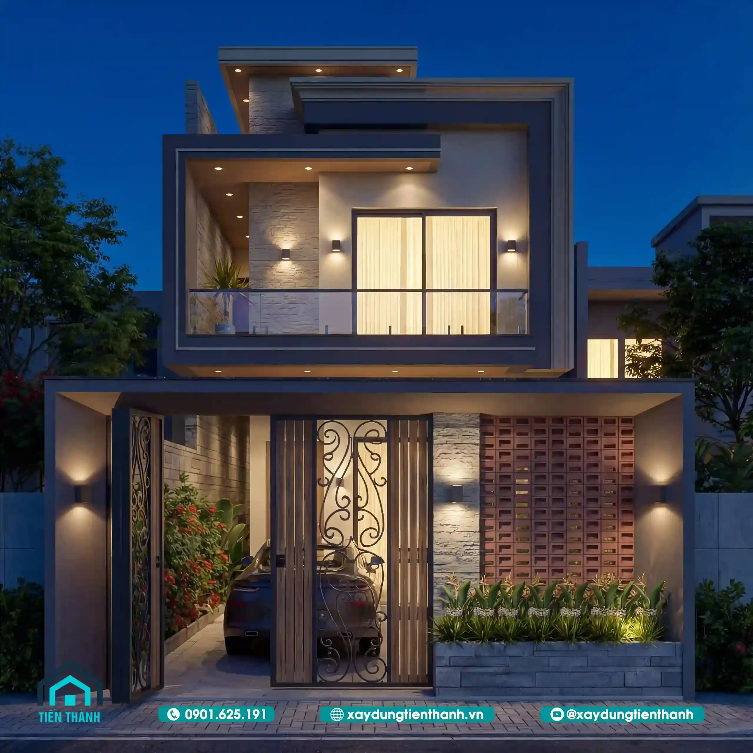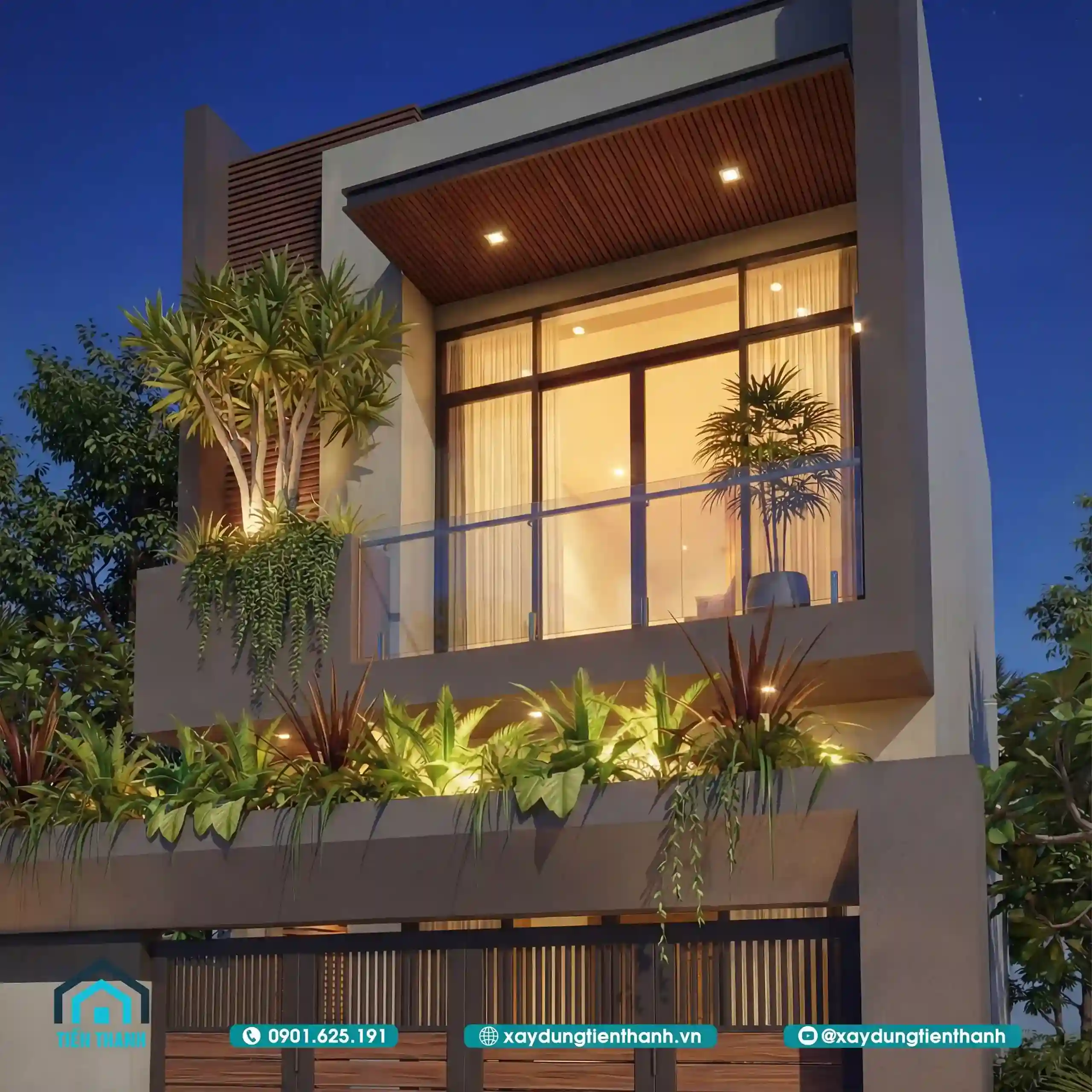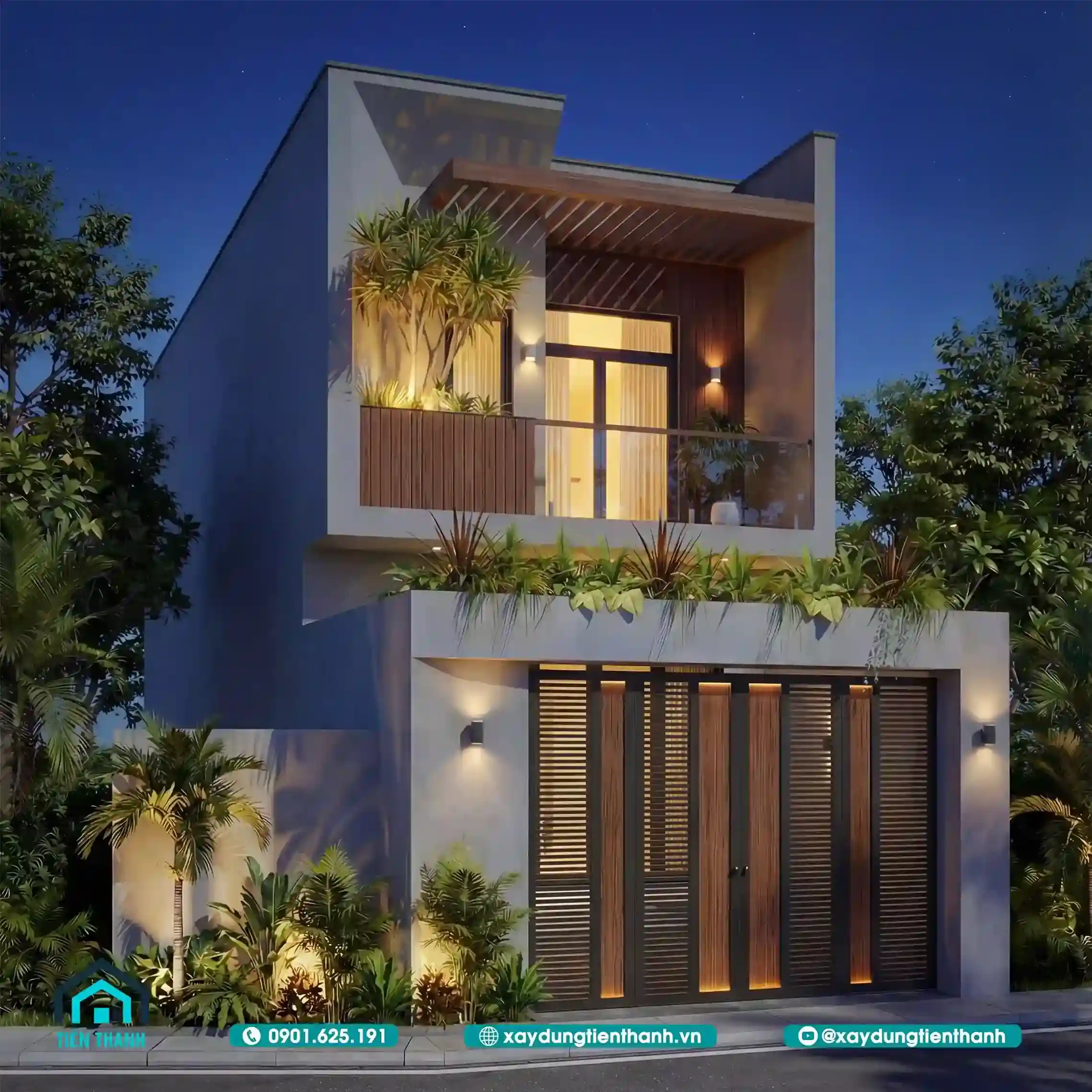 Phối cảnh mặt tiền nhà hai tầng lung linh dưới ánh đèn vàng ấm áp ban đêm.