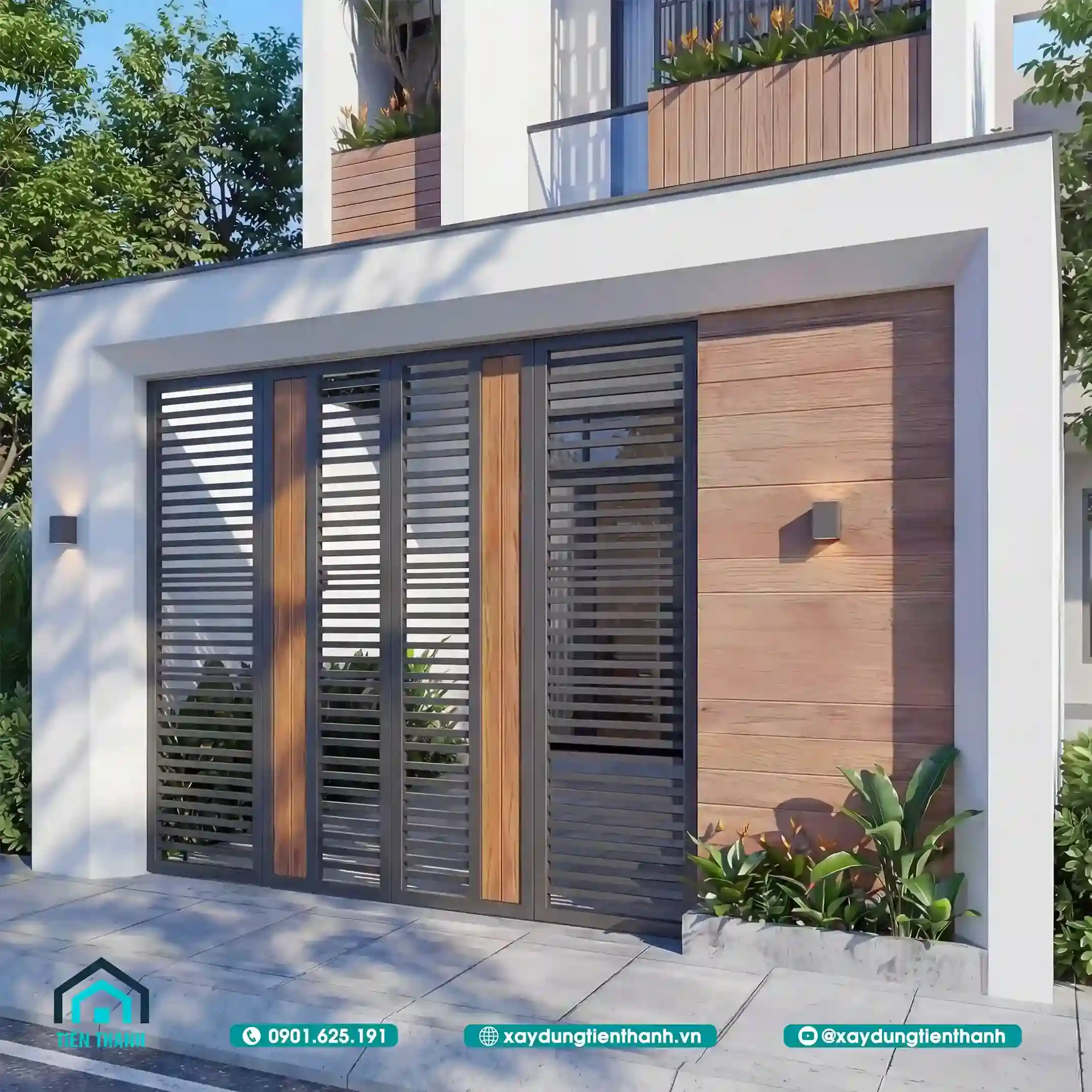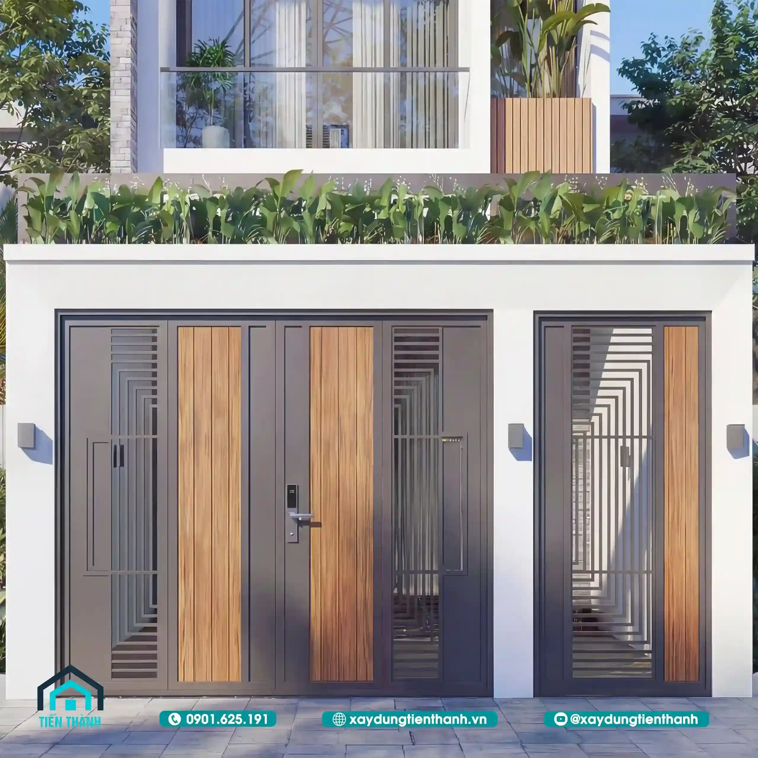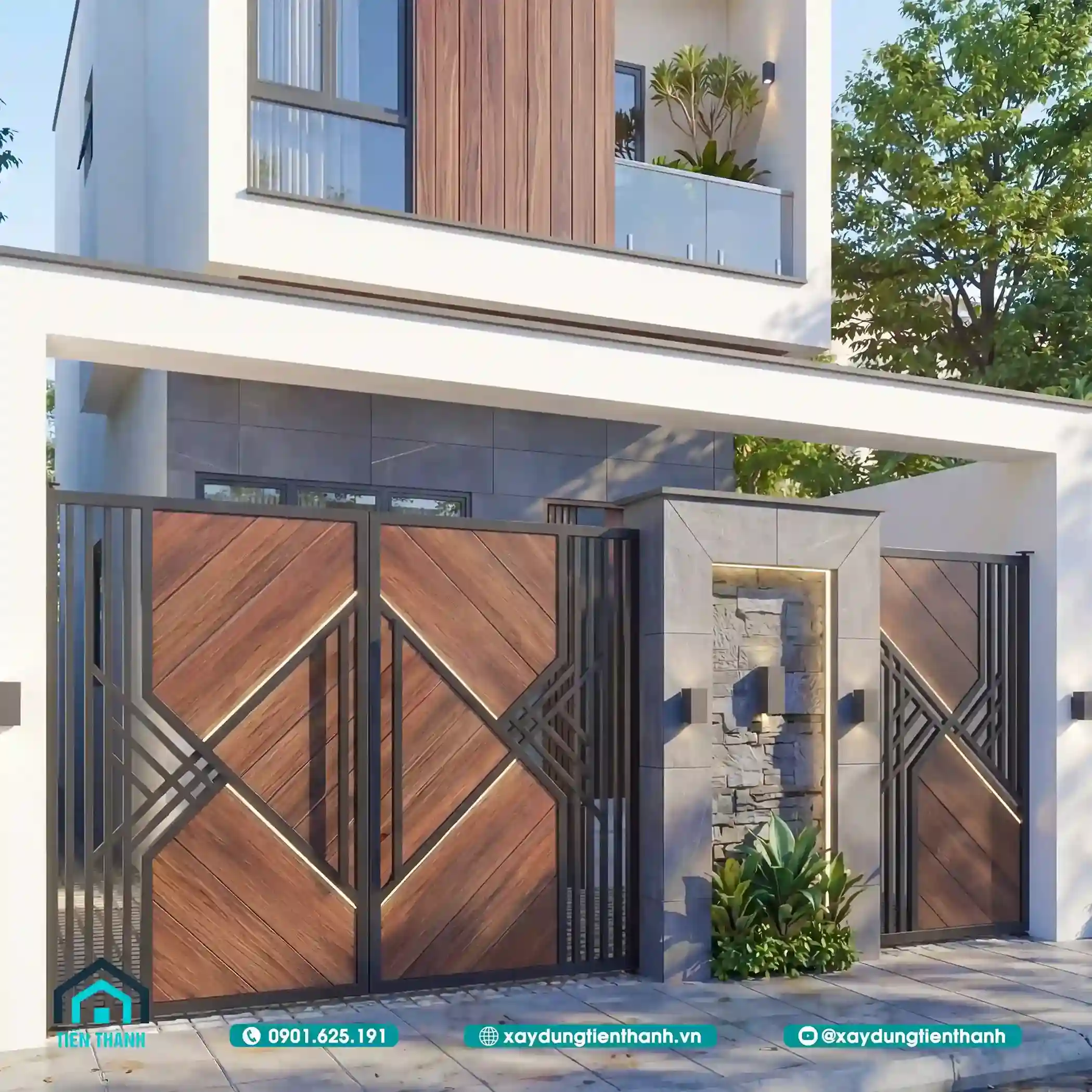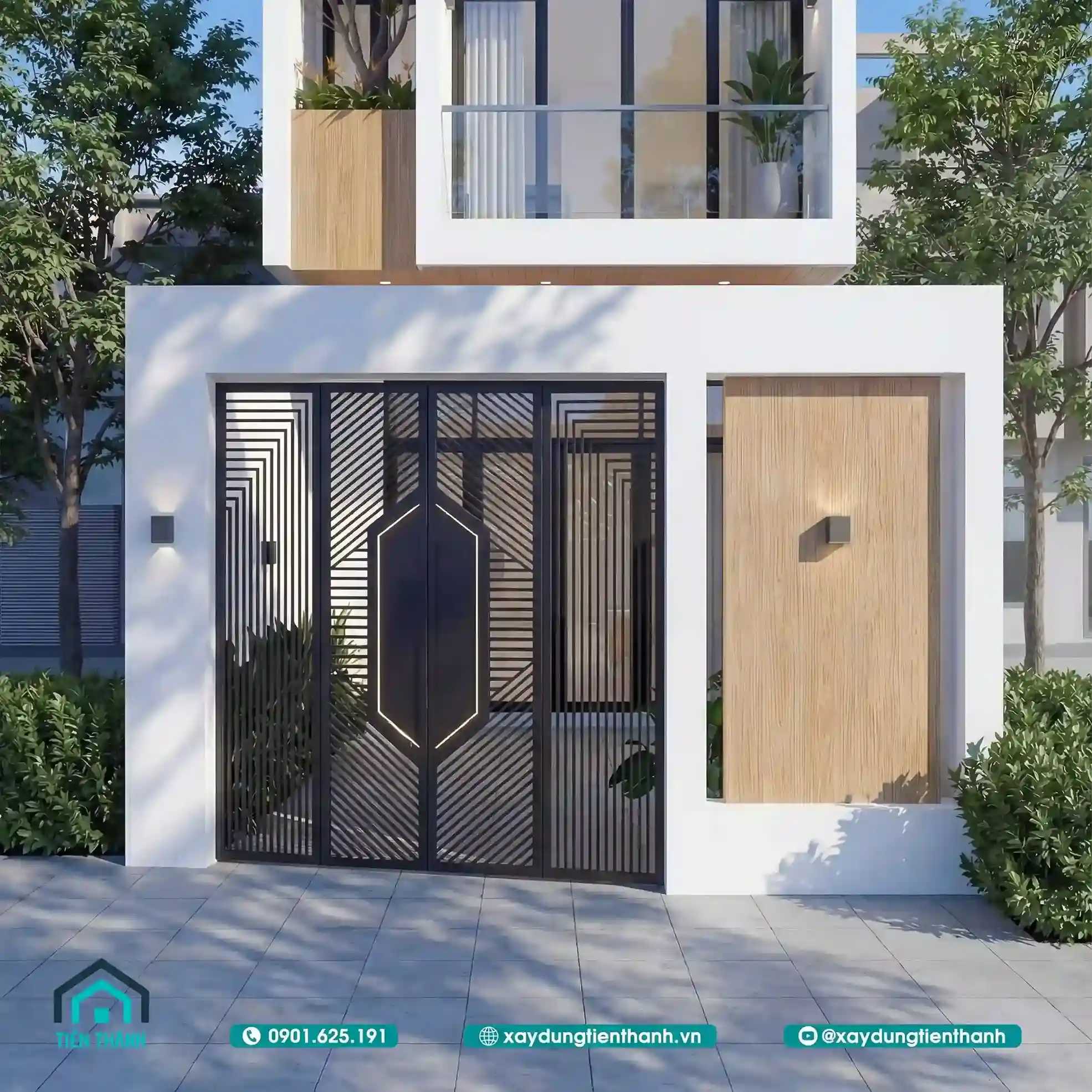Cổng sắt phối gỗ hiện đại với họa tiết hình học và mặt tiền nhà phố hai tầng.