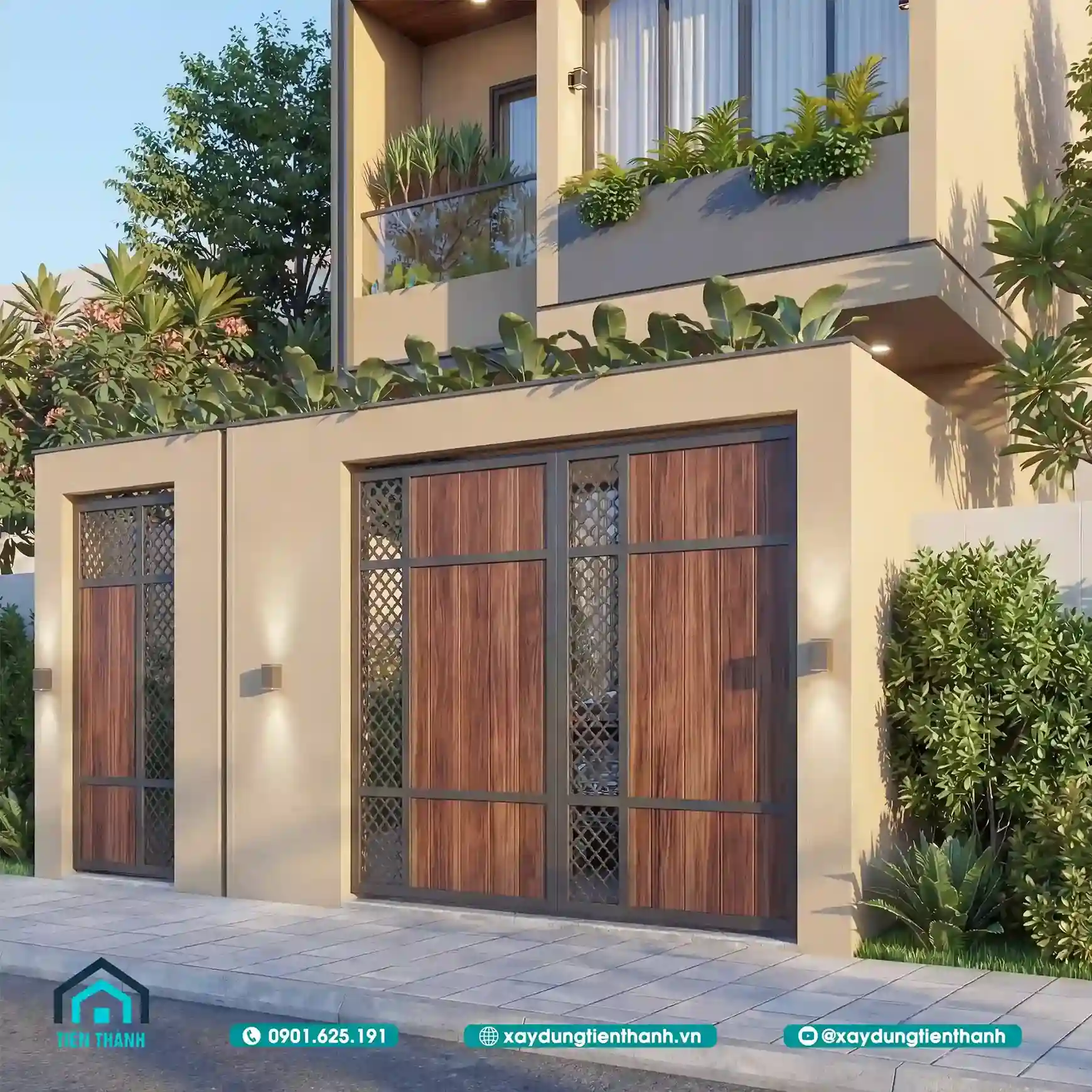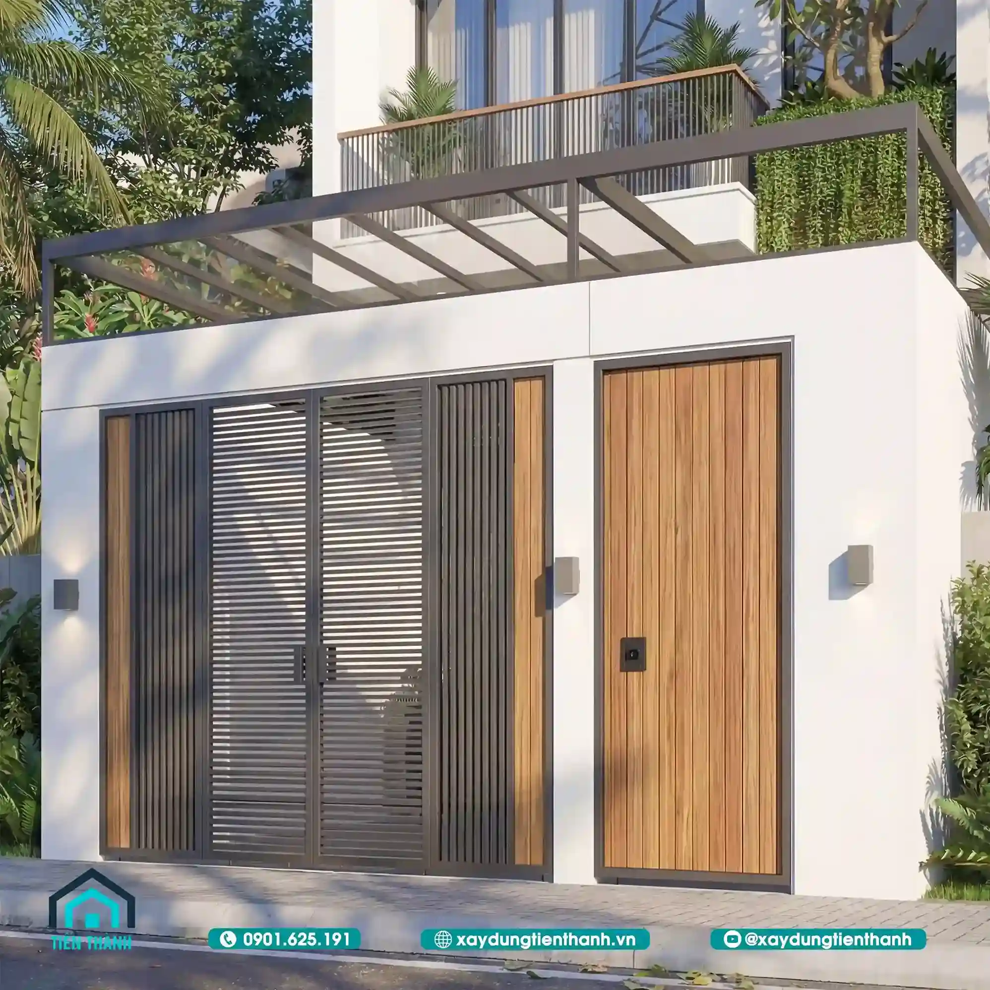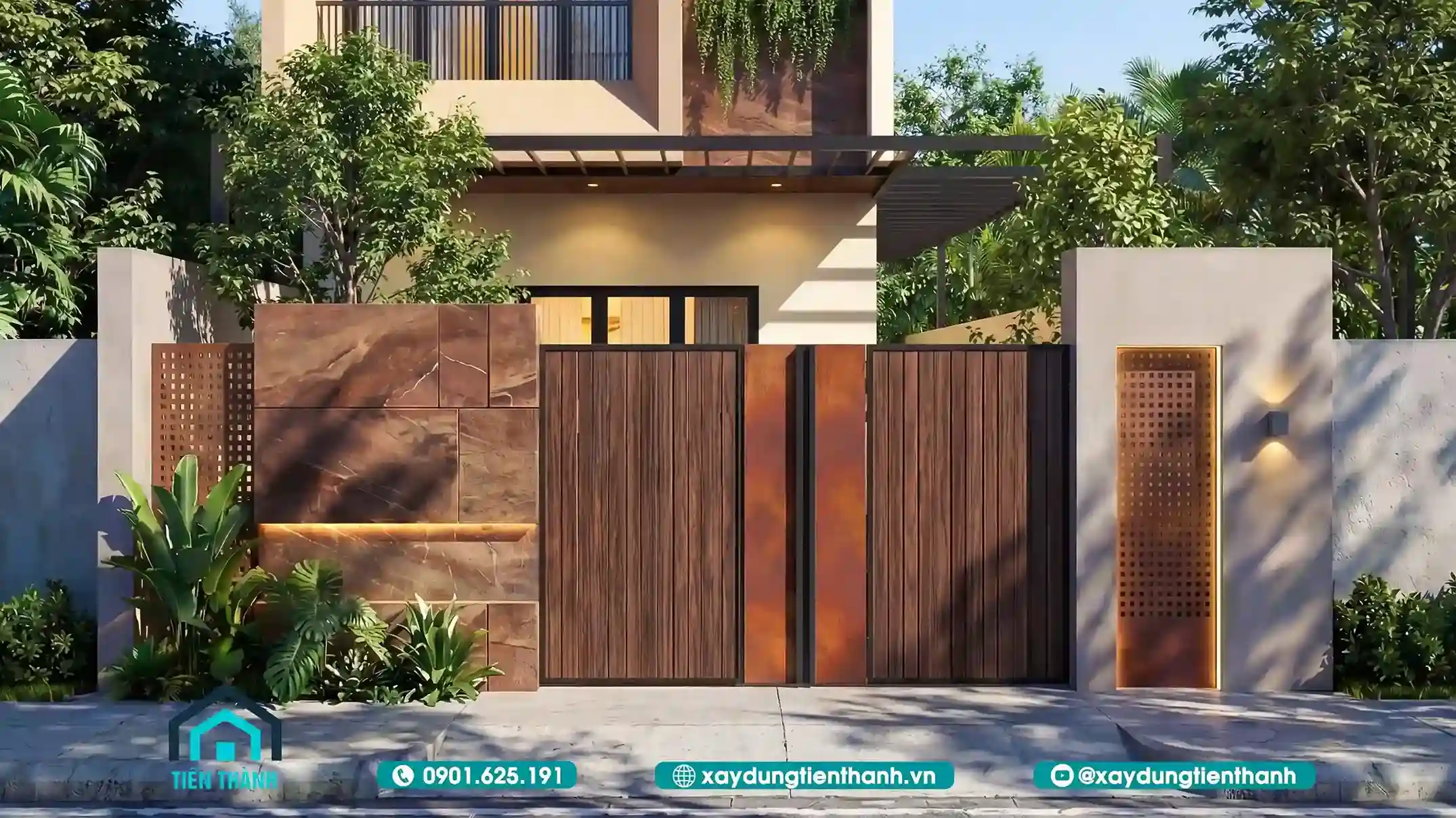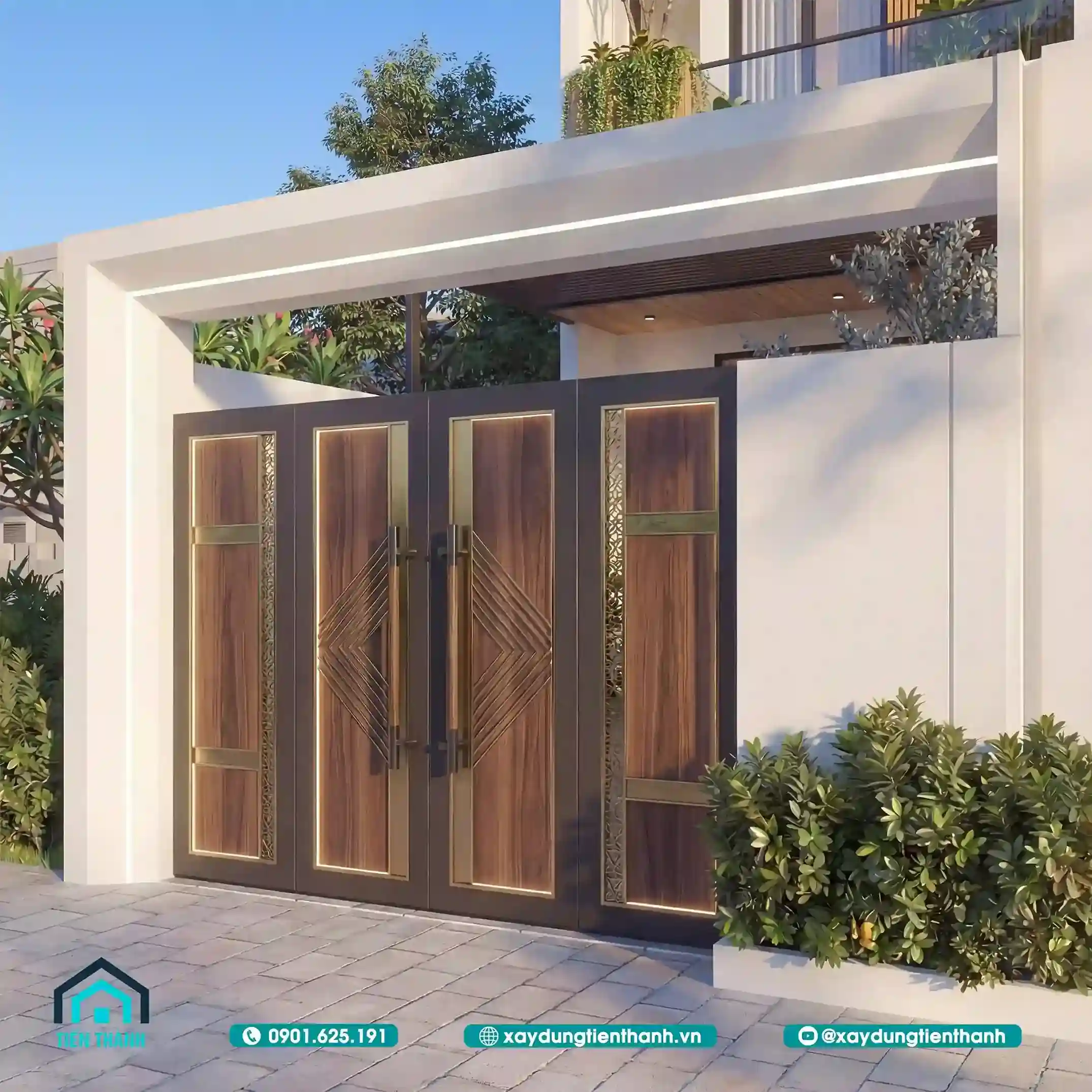 Cổng sắt phối gỗ hiện đại với họa tiết hình học và mặt tiền nhà phố hai tầng.