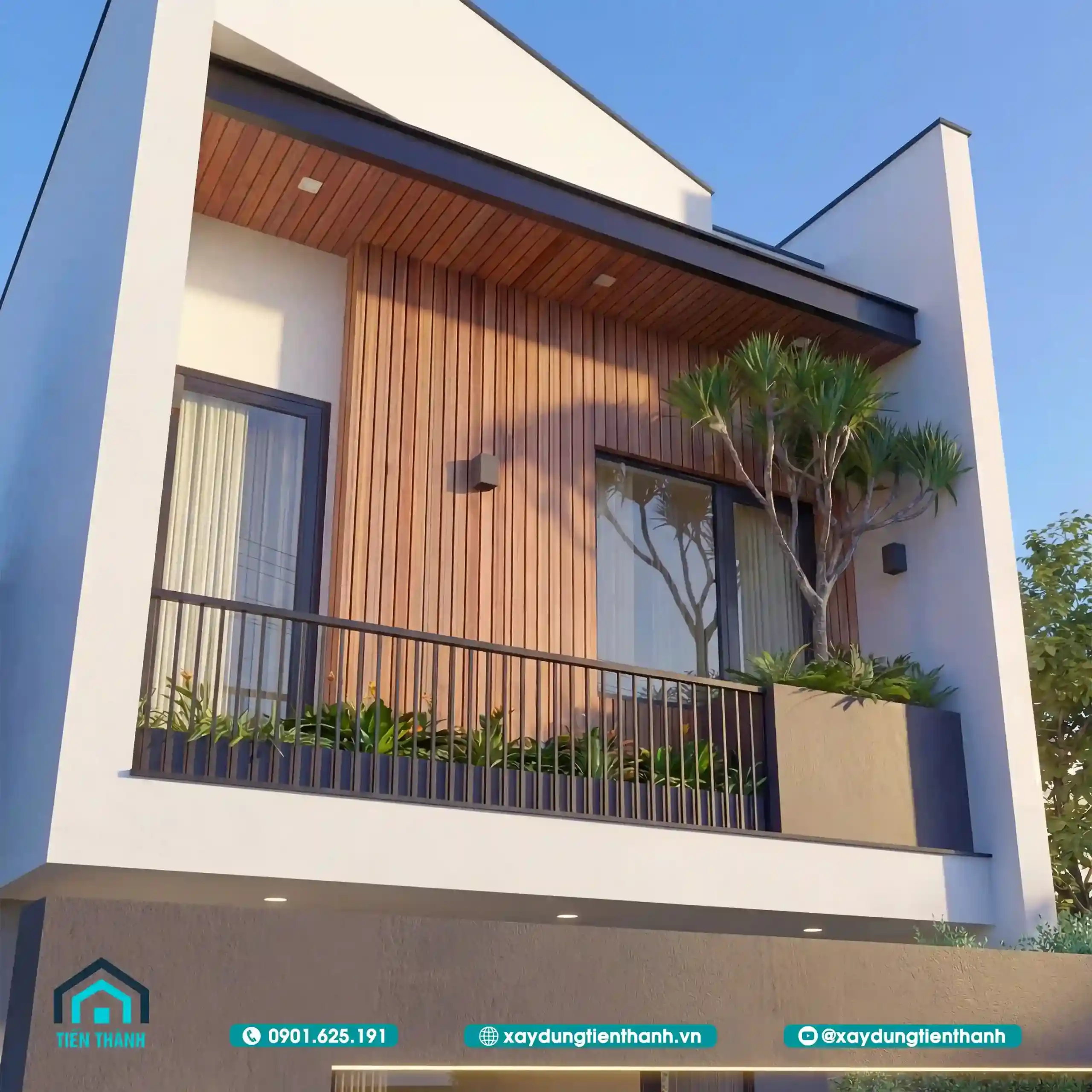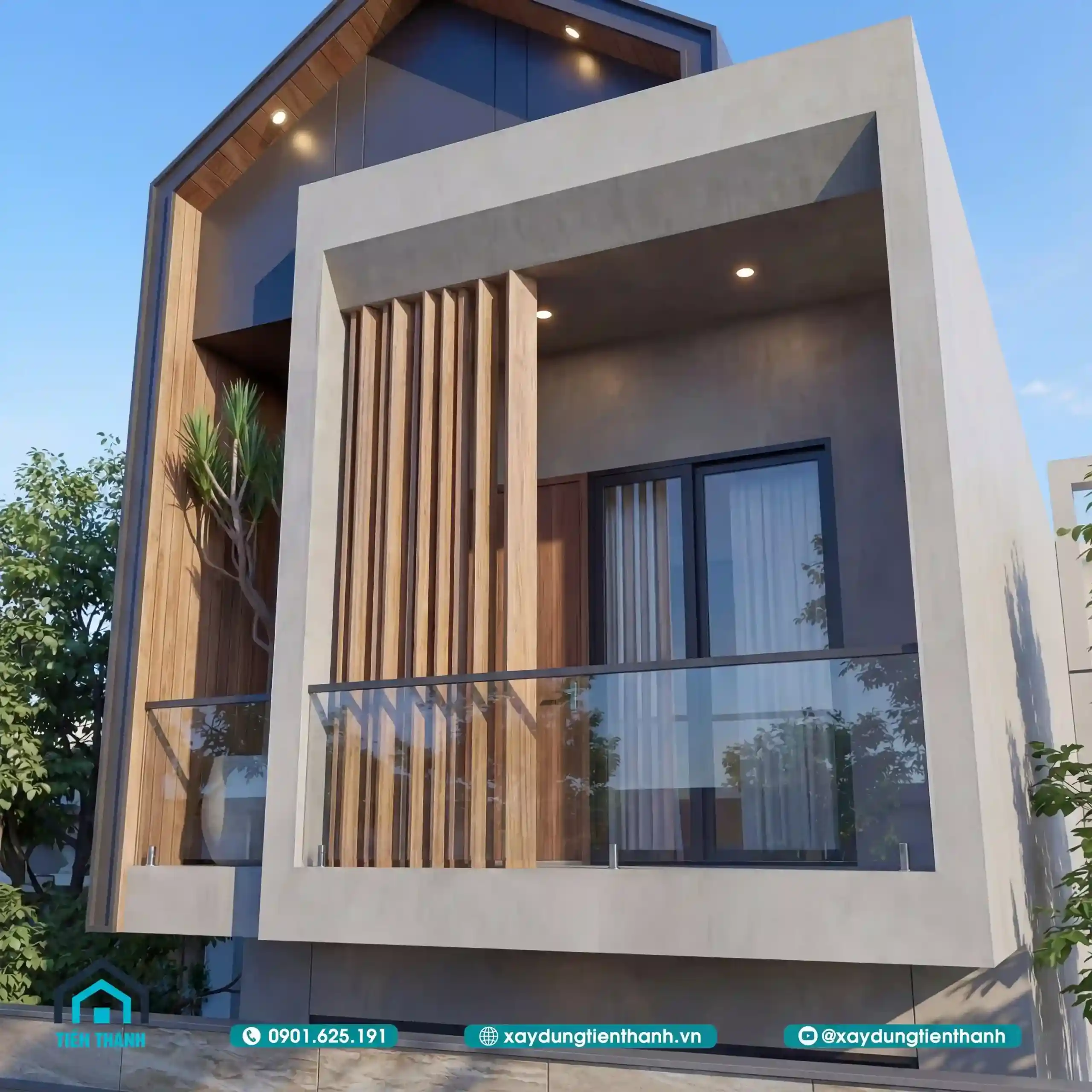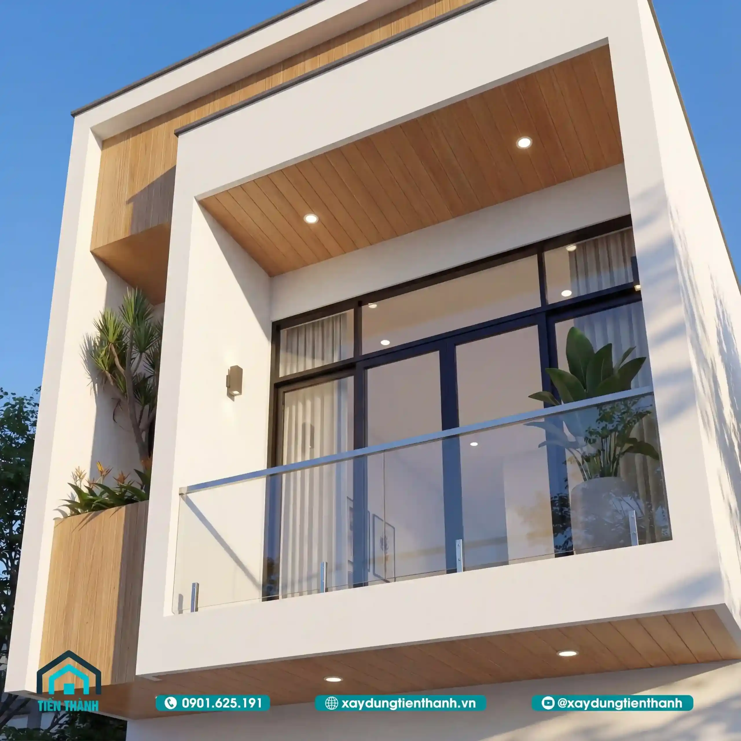 Mẫu thiết kế nhà đẹp 2 tầng hiện đại với ban công kính và ốp gỗ mặt tiền.