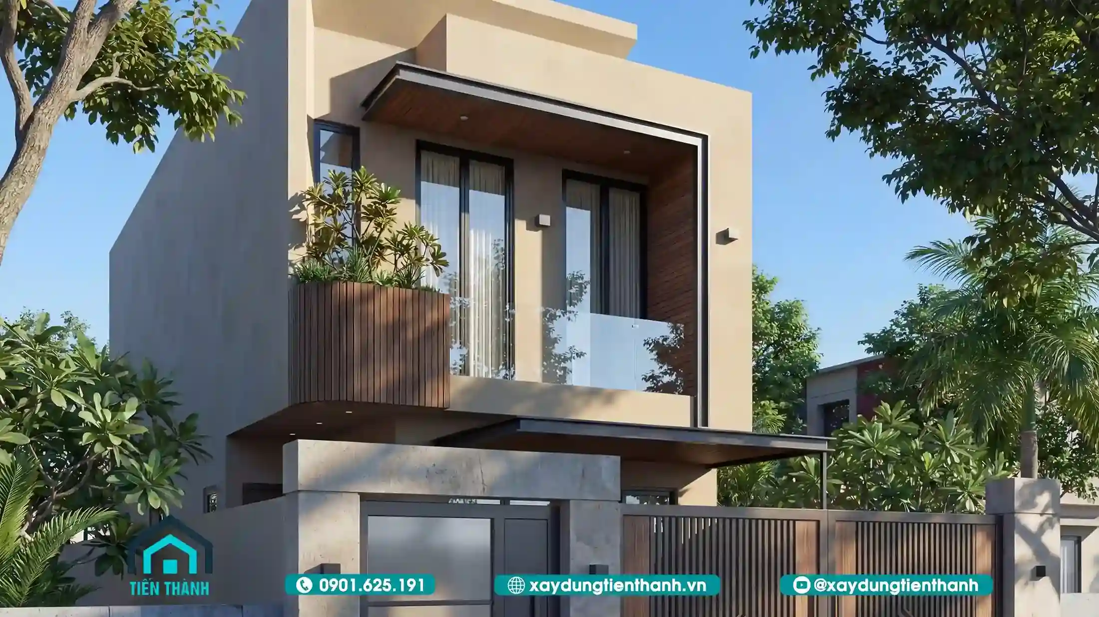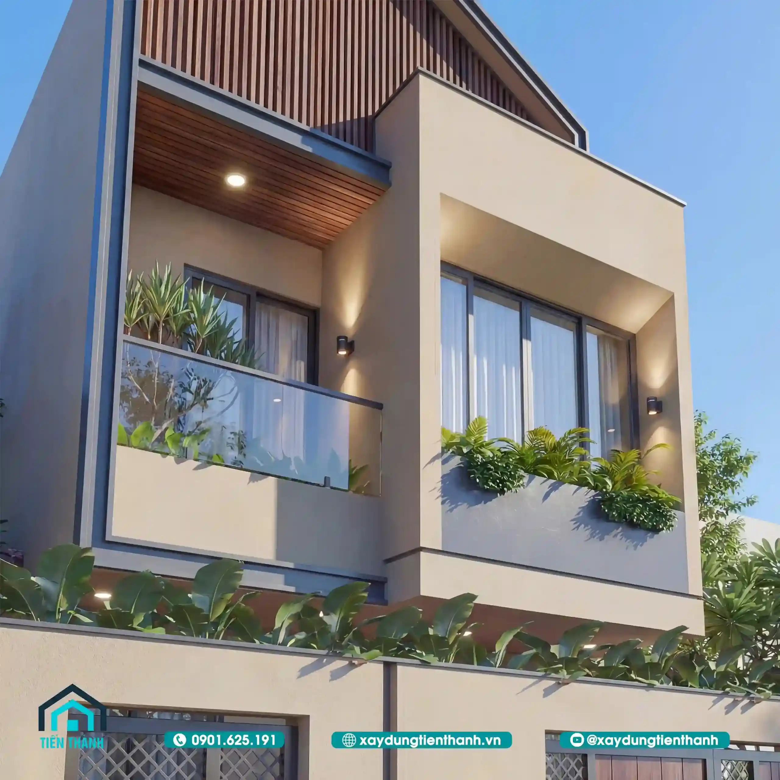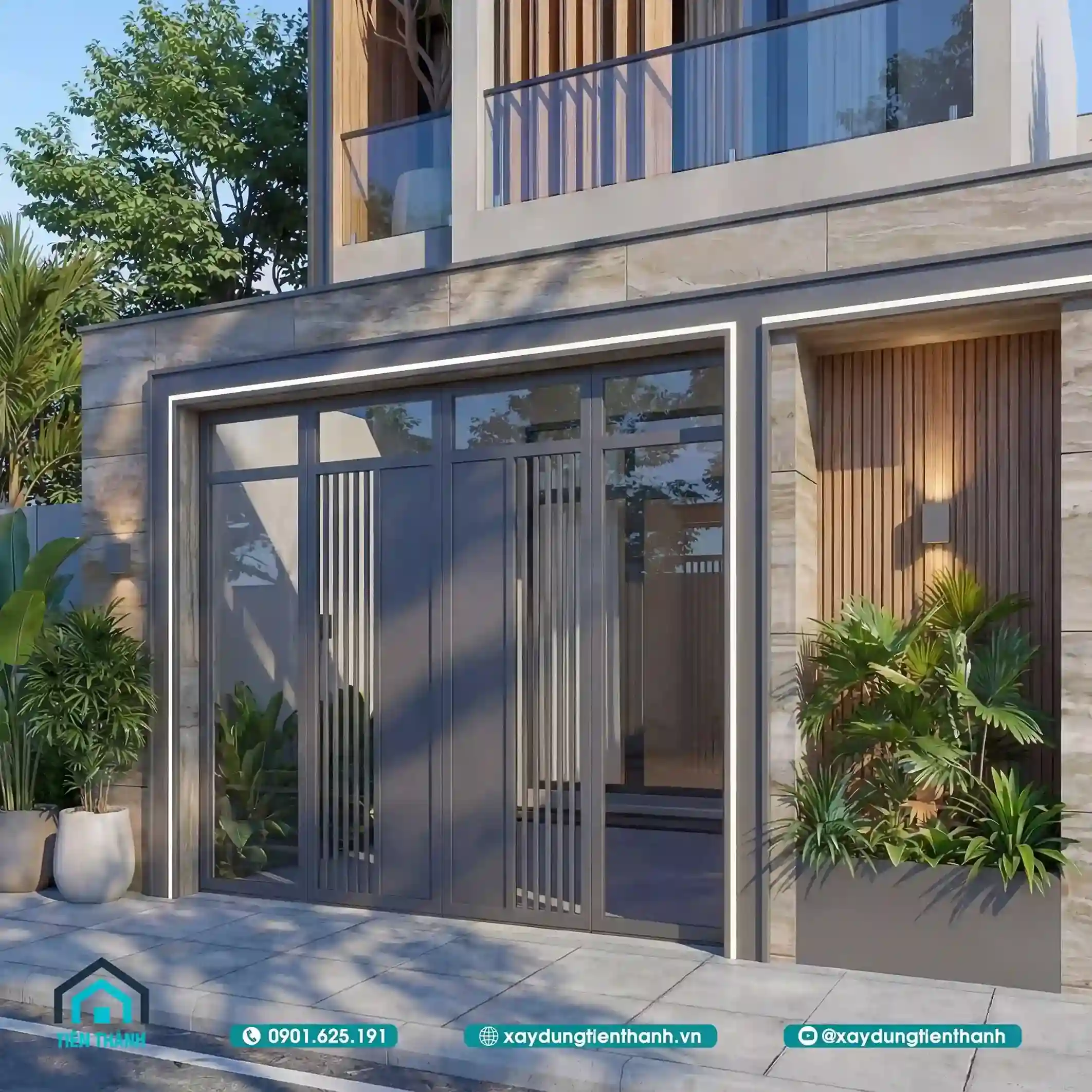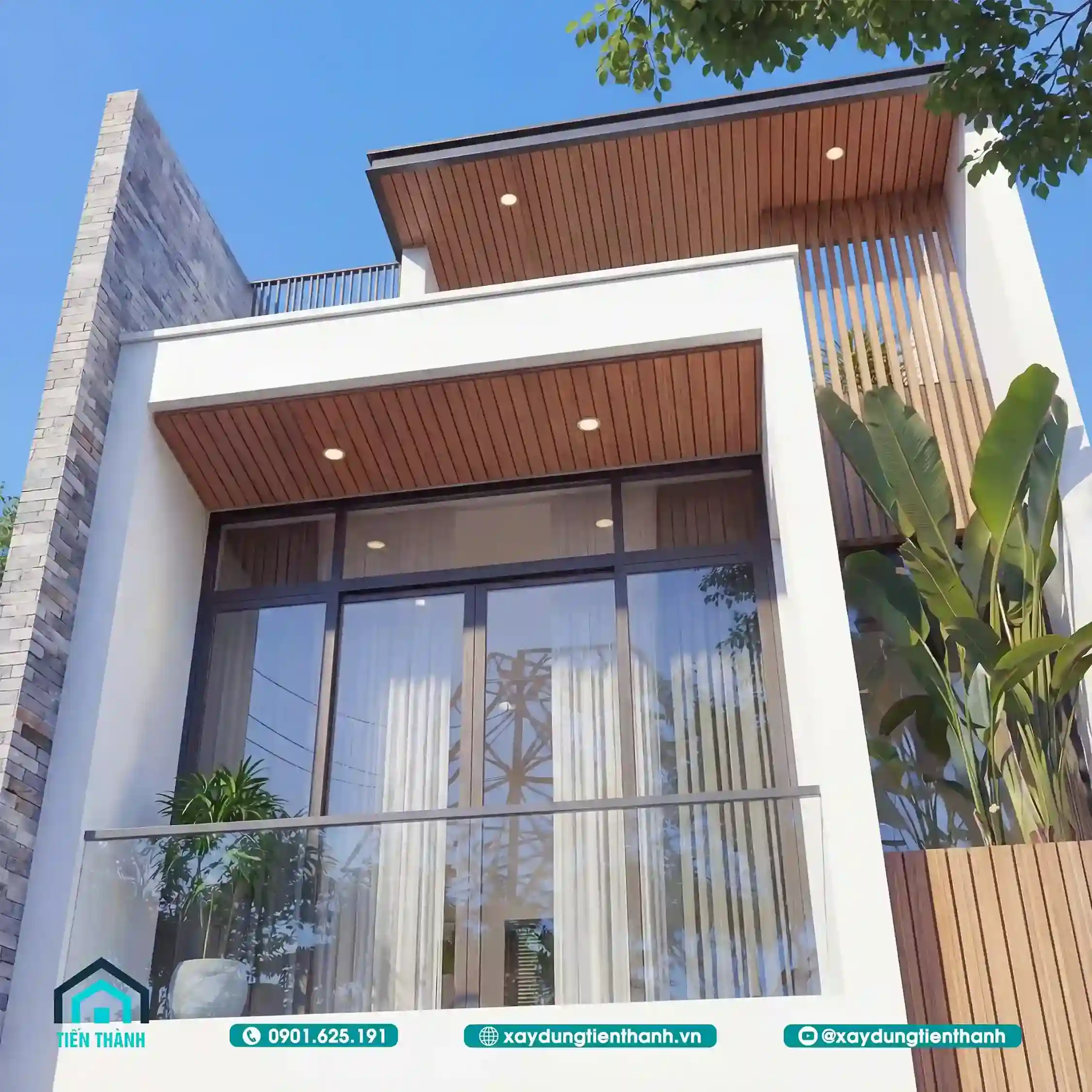 Mẫu thiết kế nhà đẹp 2 tầng hiện đại với ban công kính và ốp gỗ mặt tiền.