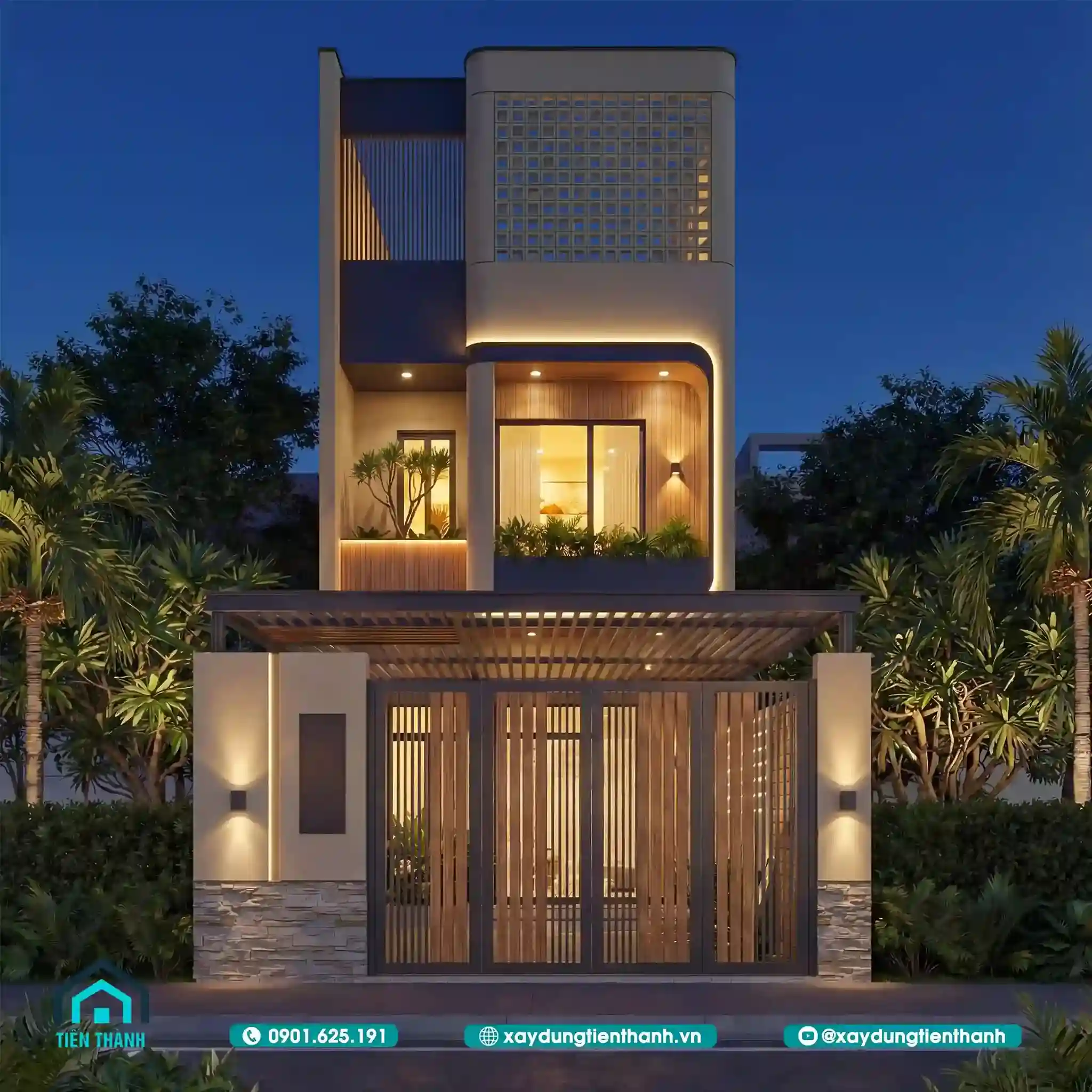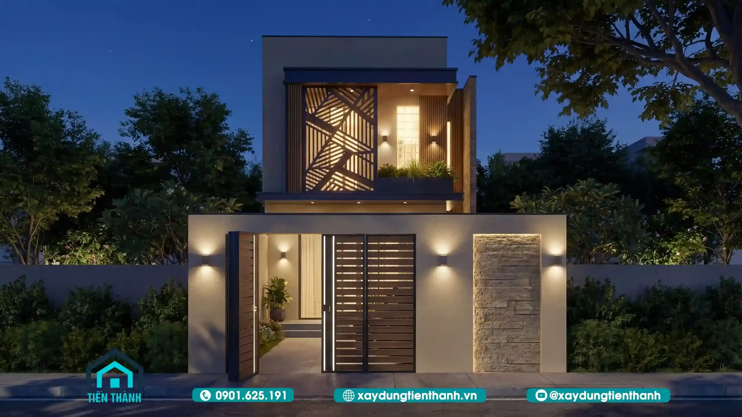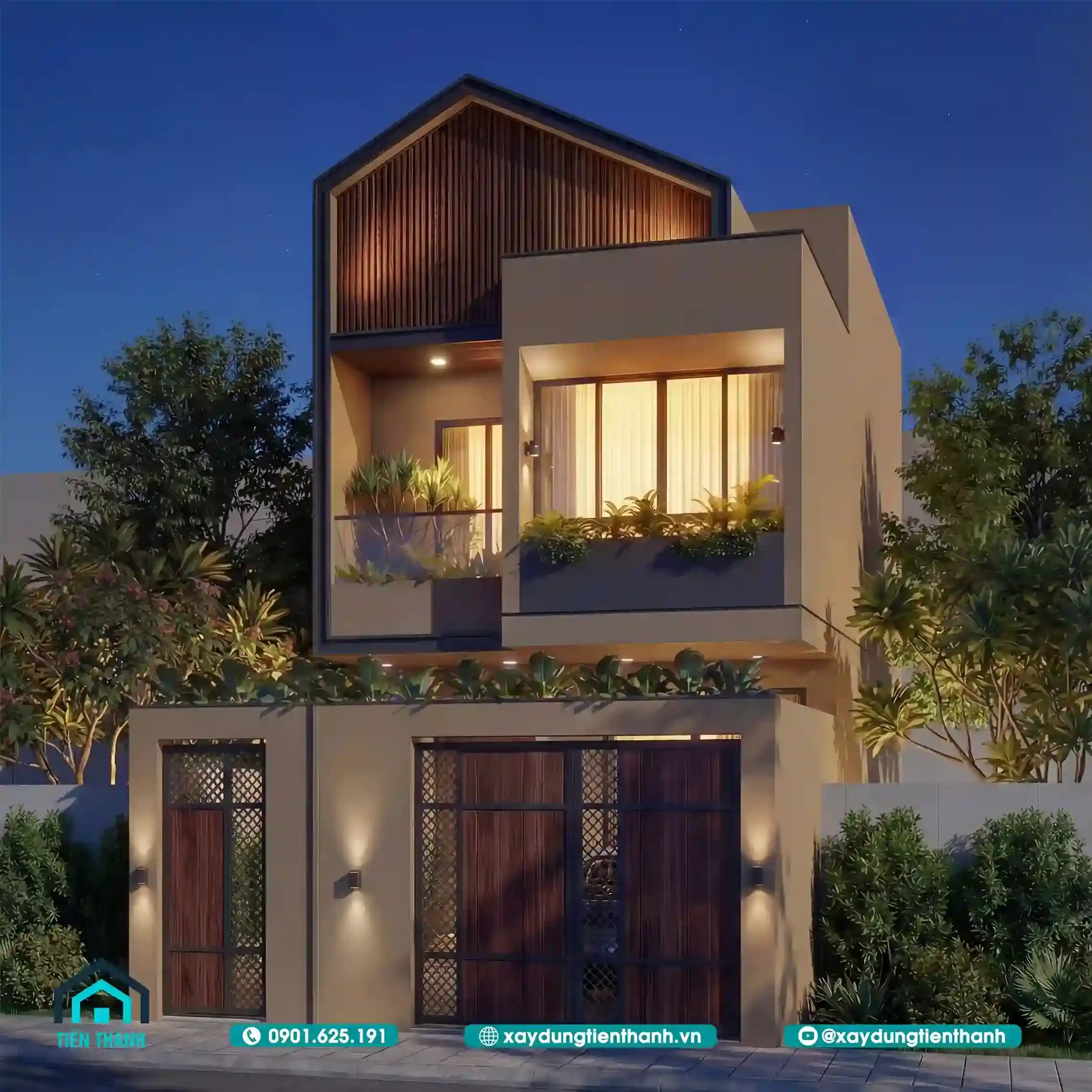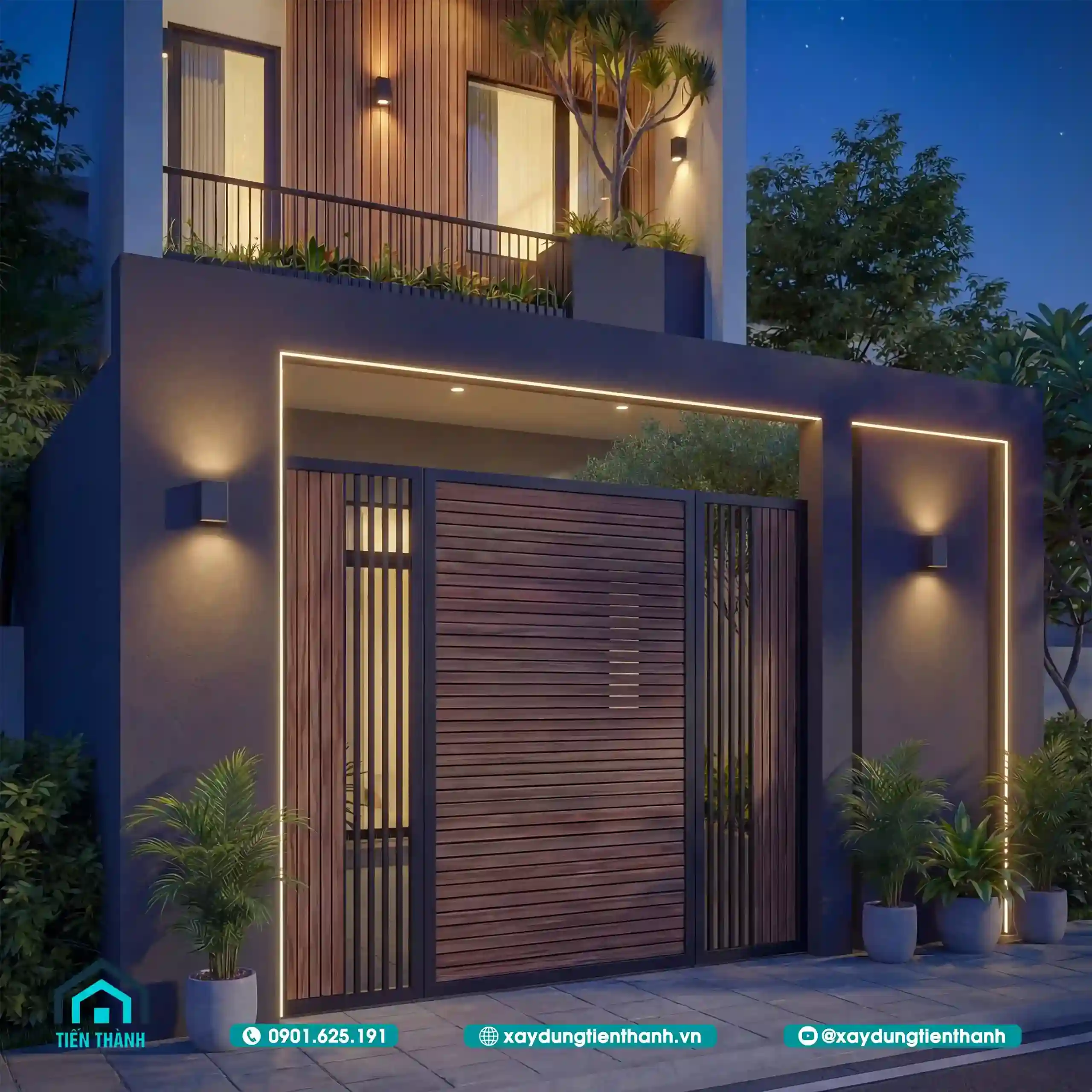 Ngôi nhà phố hai tầng hiện đại lung linh dưới ánh đèn đêm với hệ cổng gỗ sang trọng.