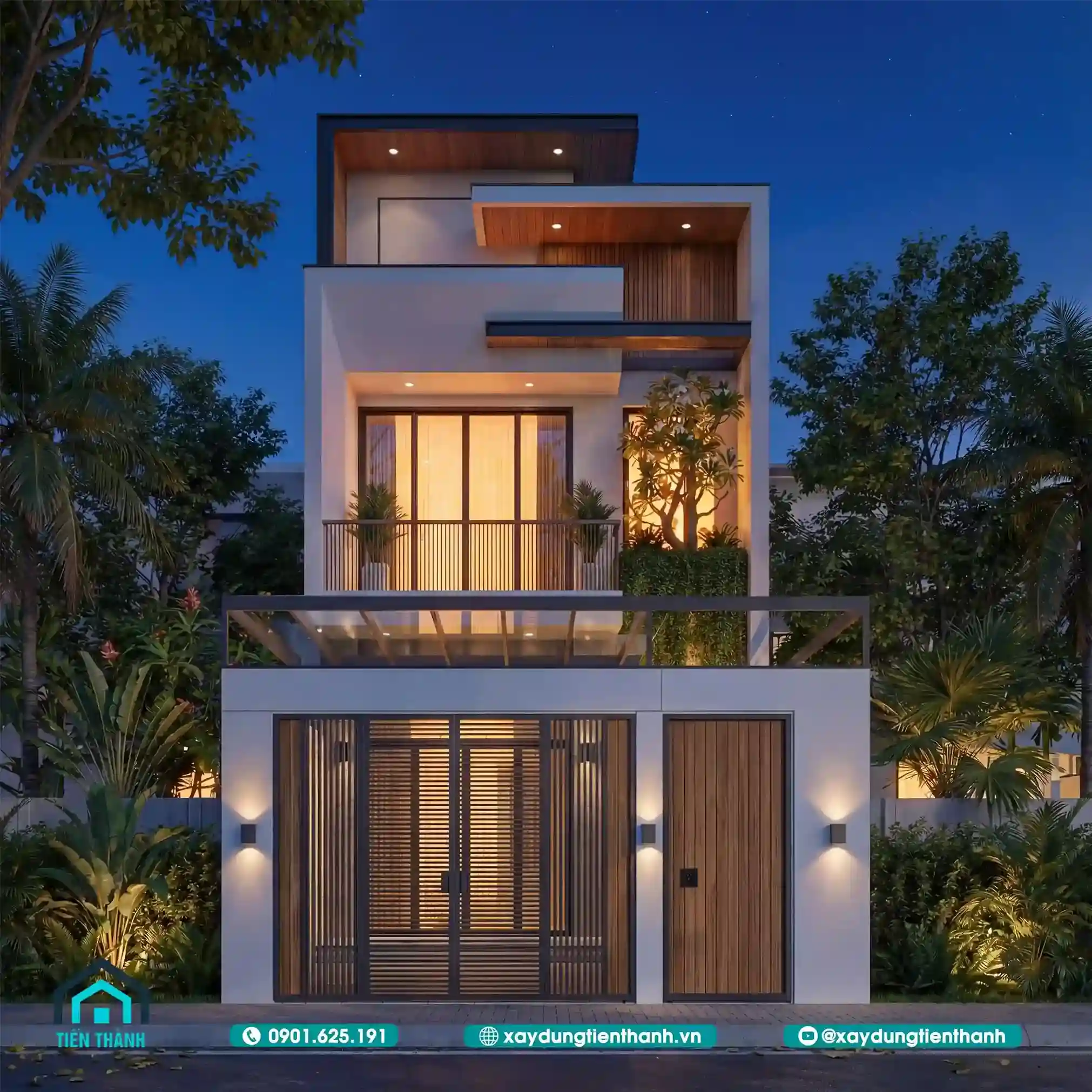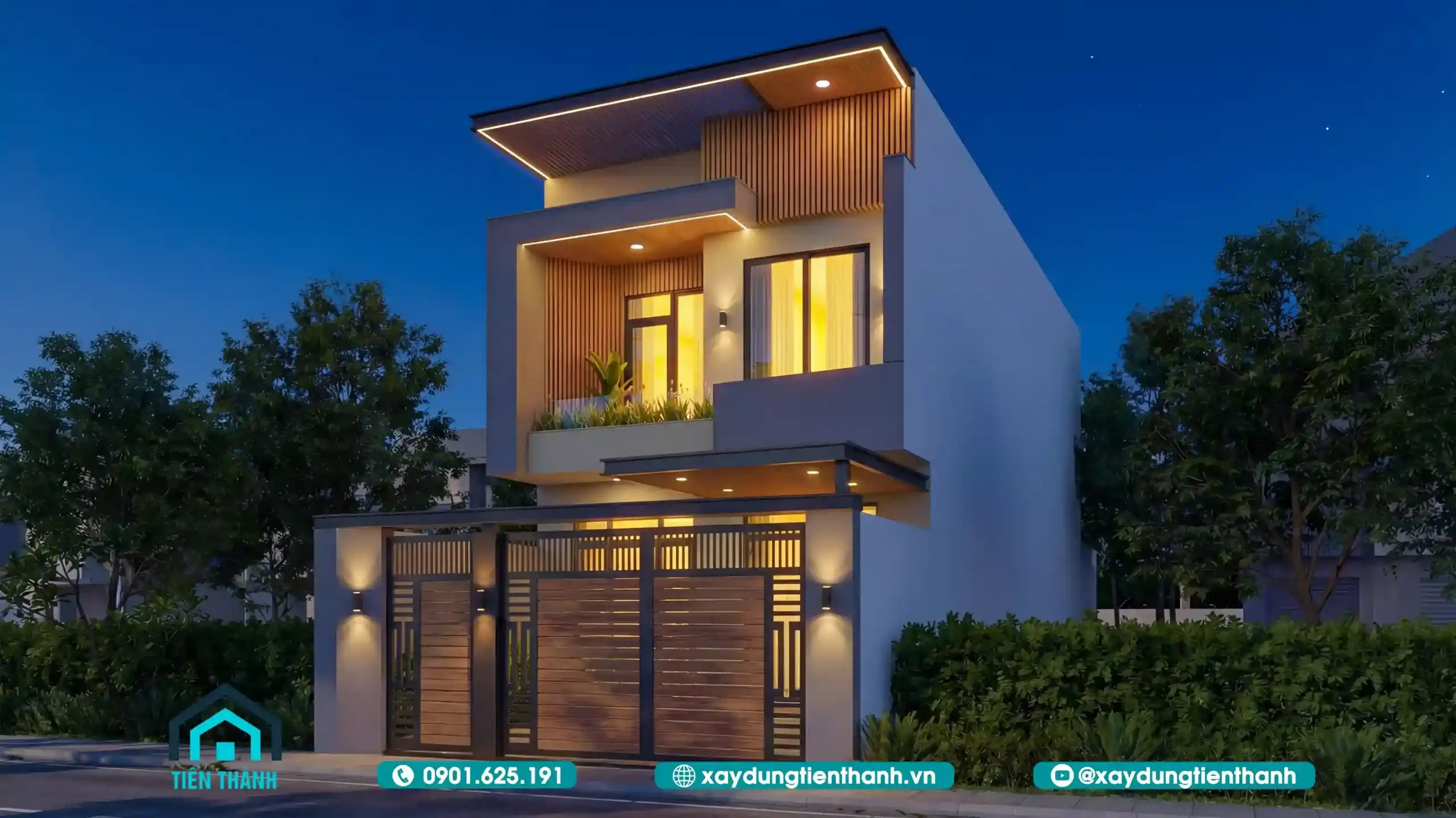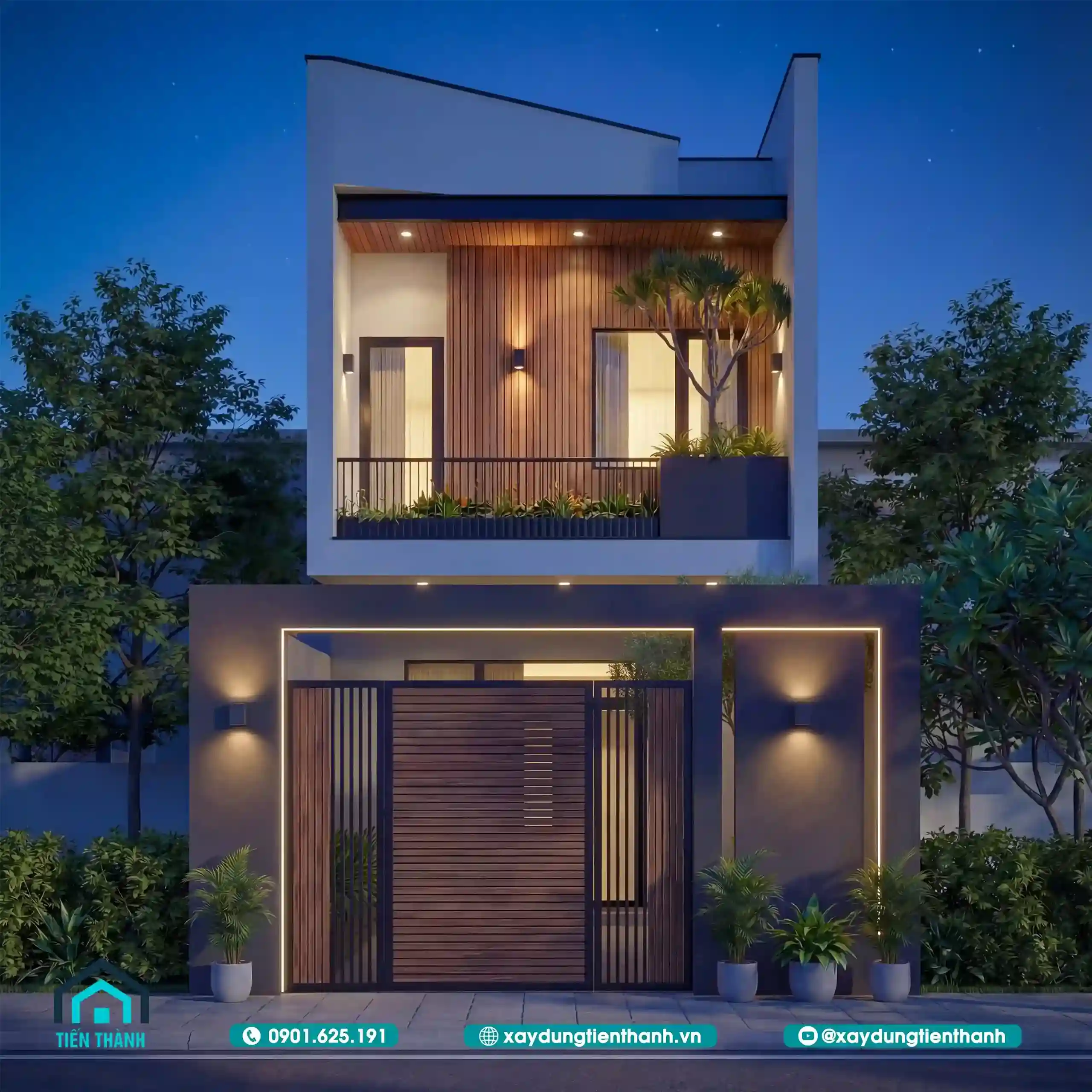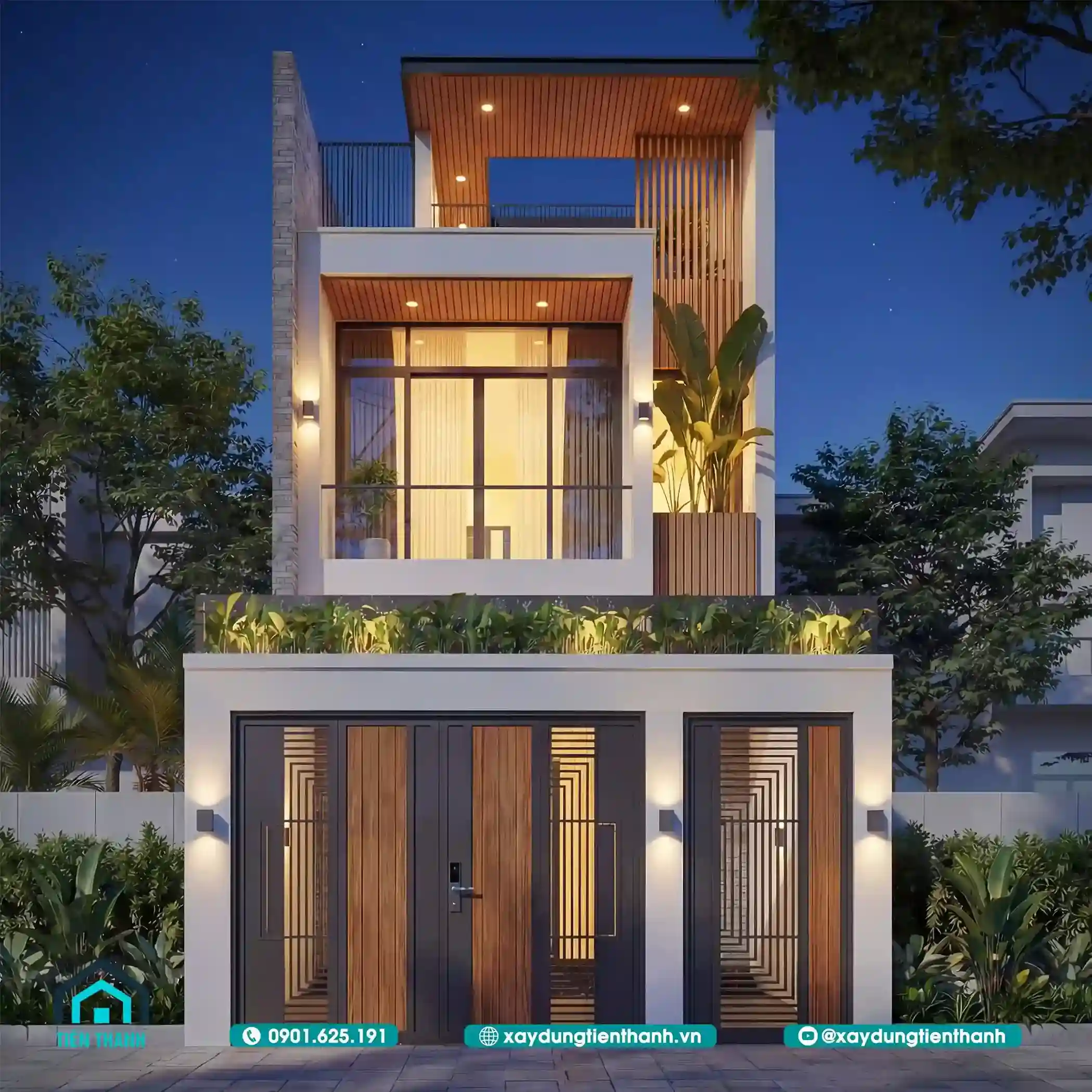 Ngôi nhà phố hai tầng hiện đại lung linh dưới ánh đèn đêm với hệ cổng gỗ sang trọng.