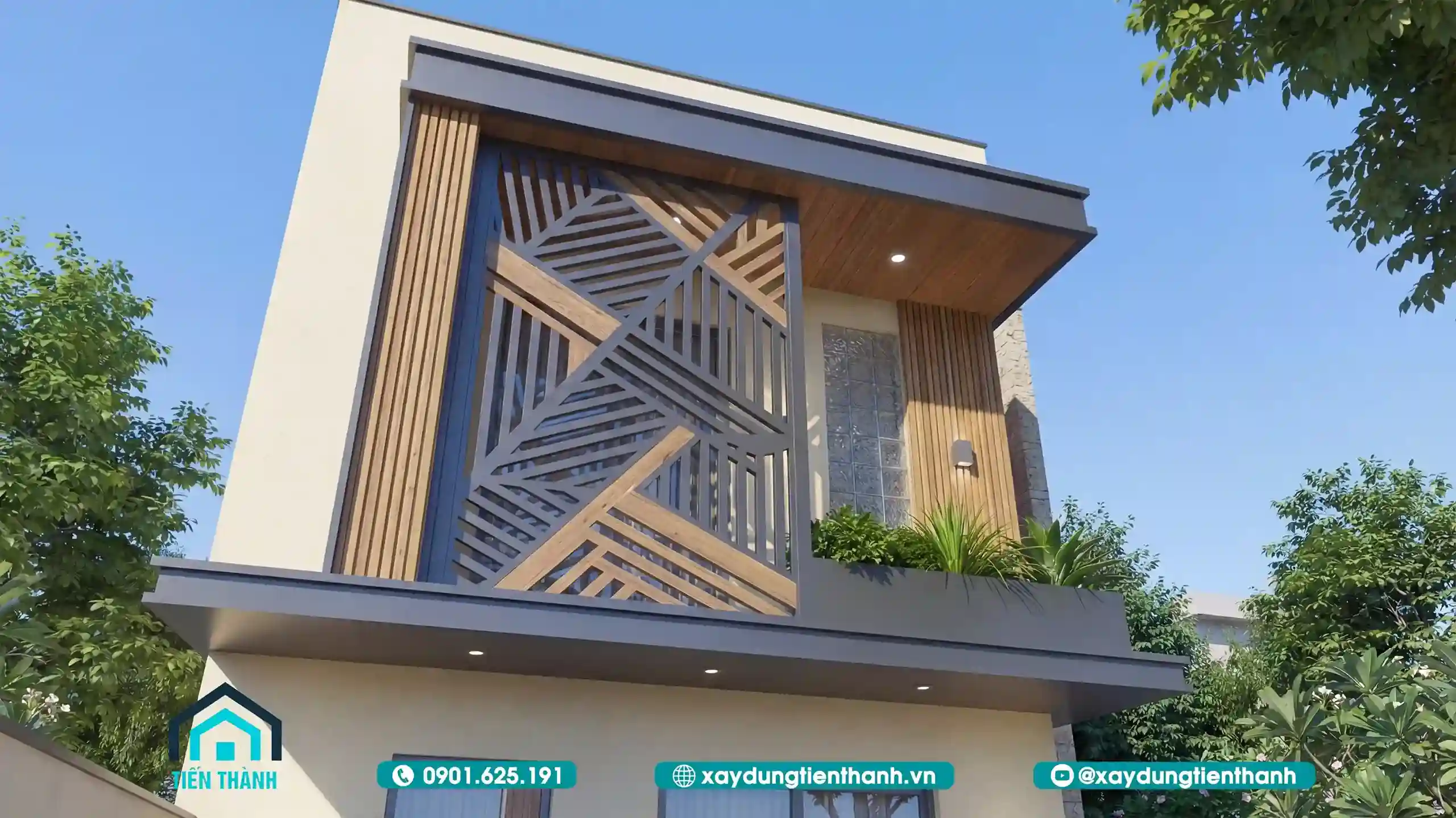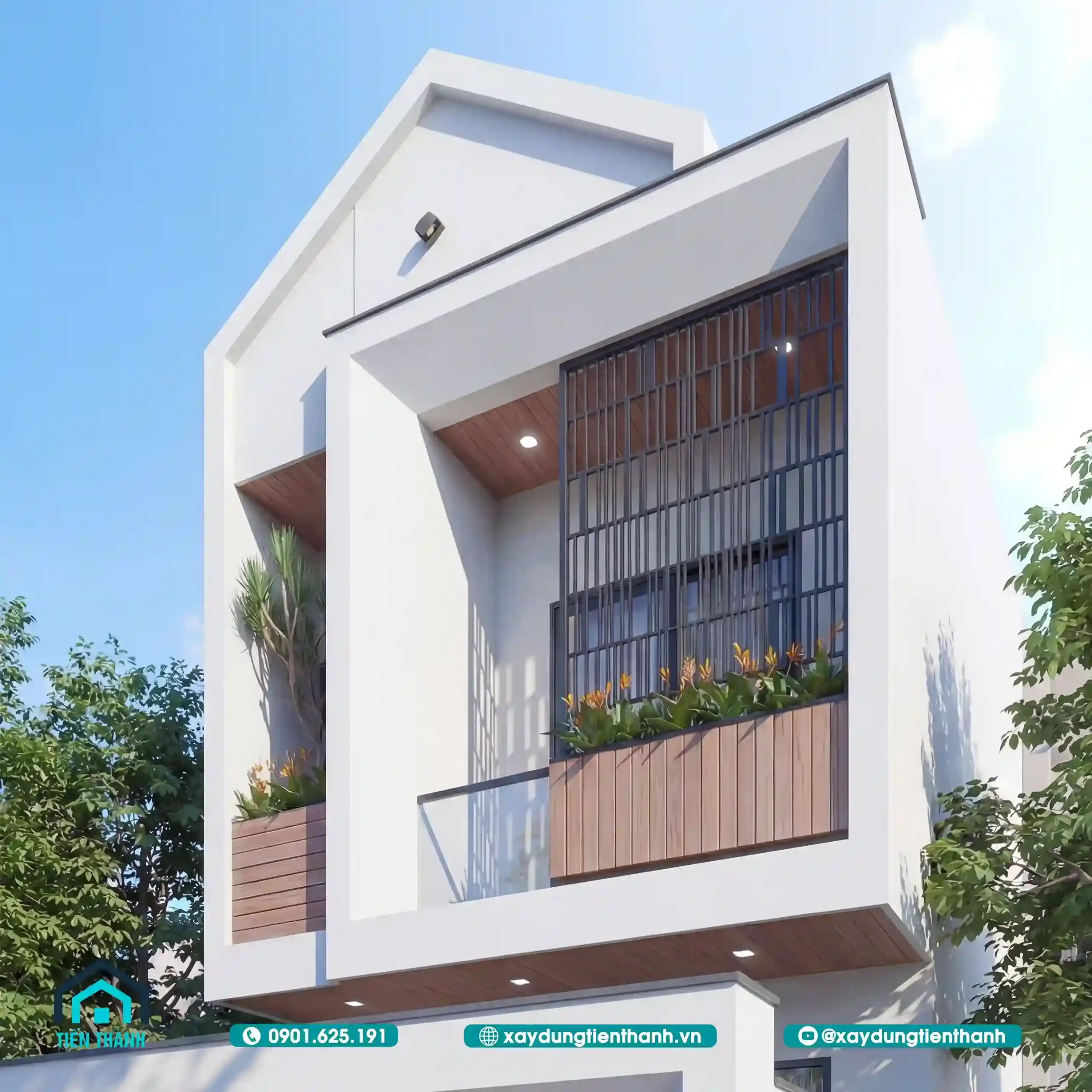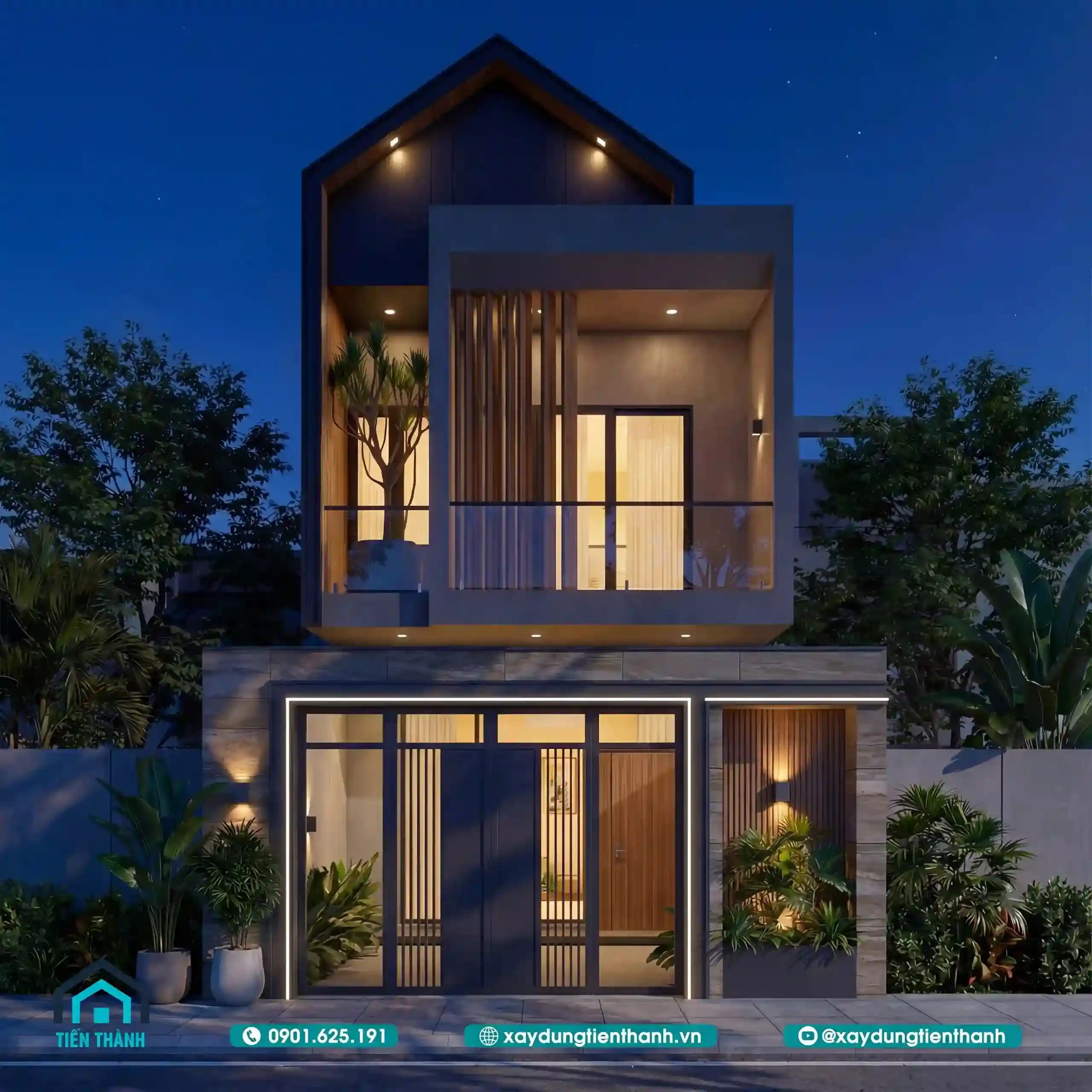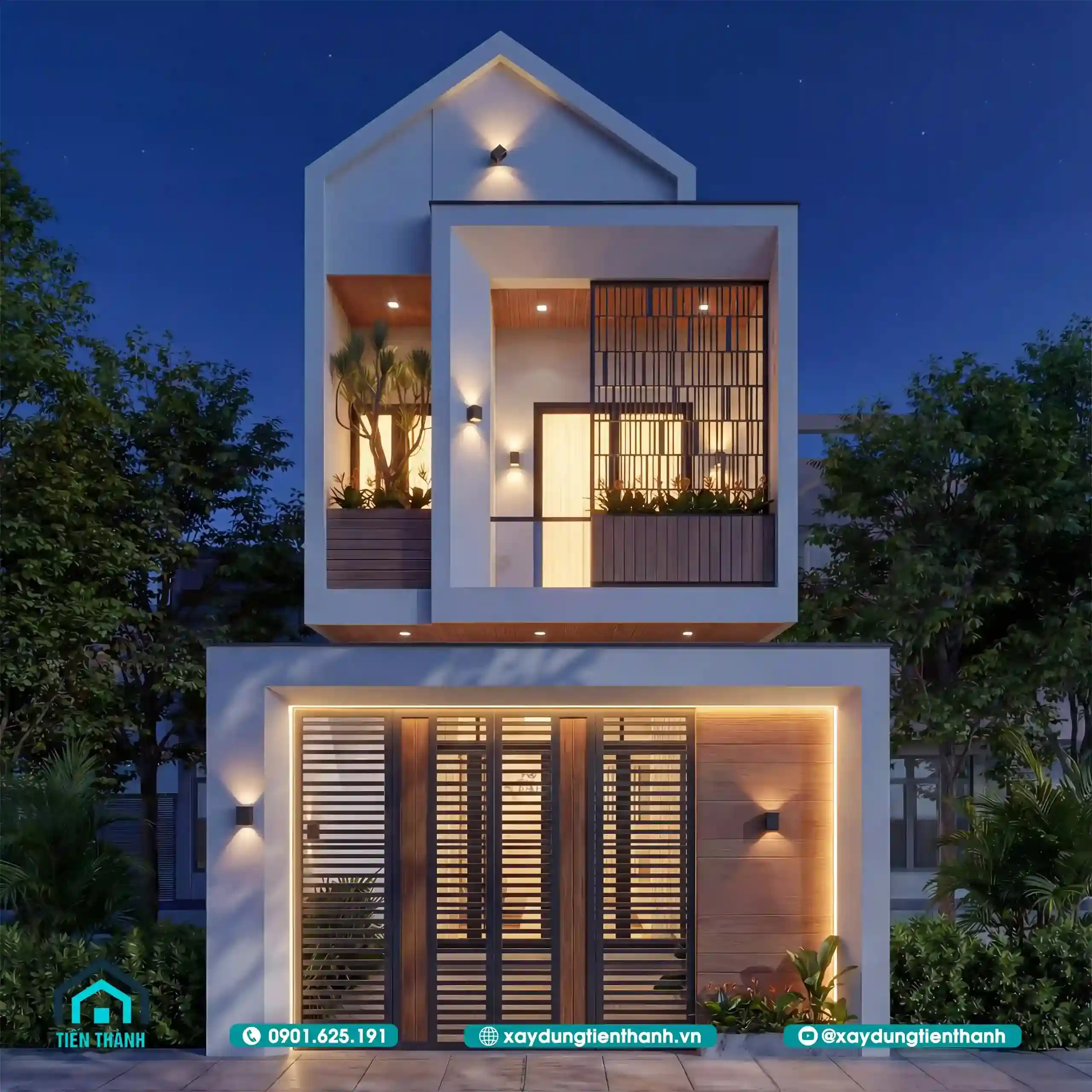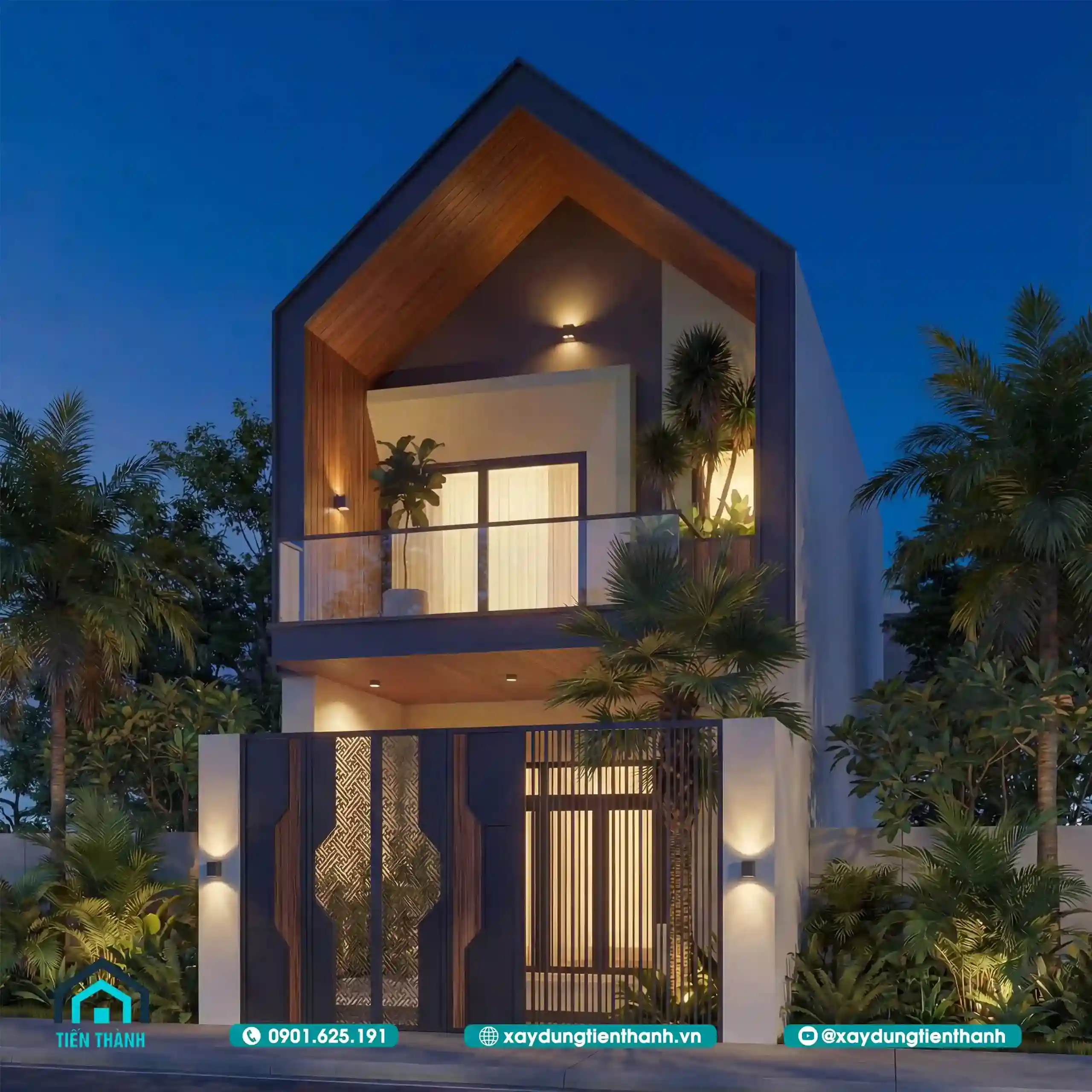 Kiến trúc nhà đẹp 2 tầng mái nhọn cách điệu kết hợp hệ lam sắt tinh tế.