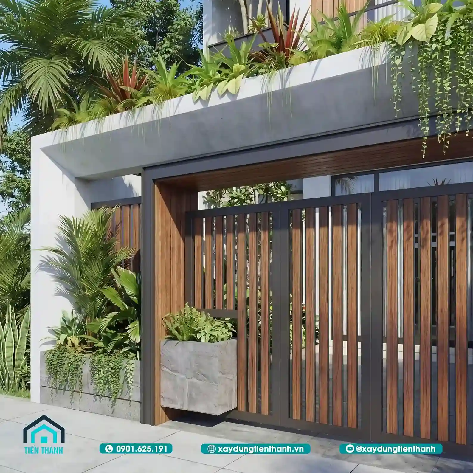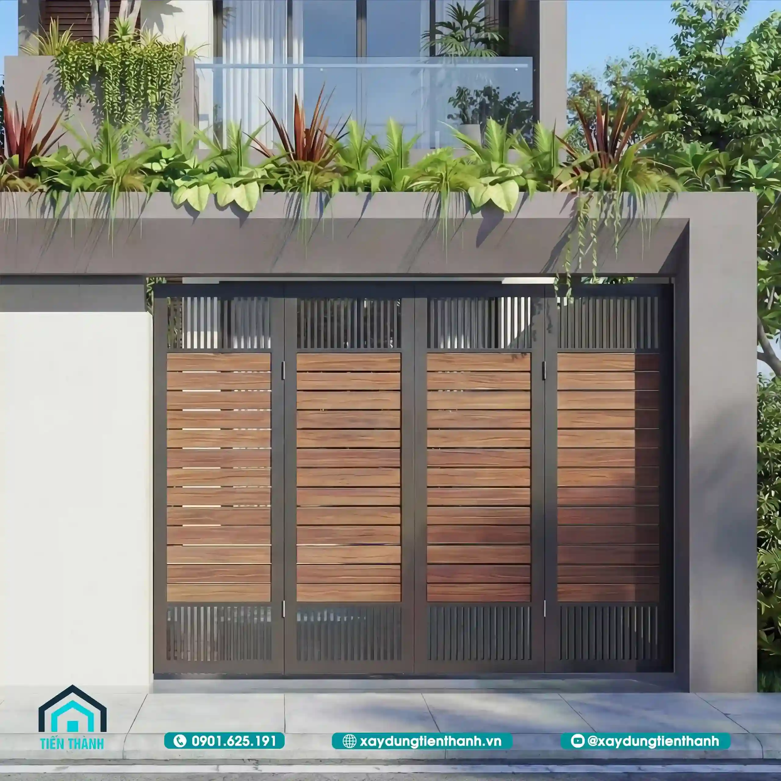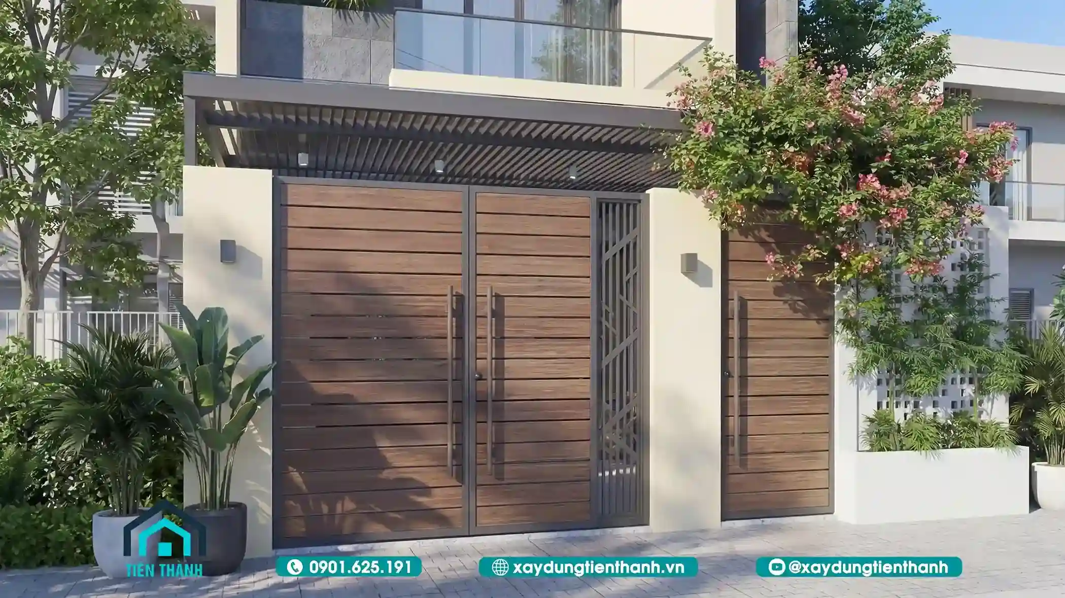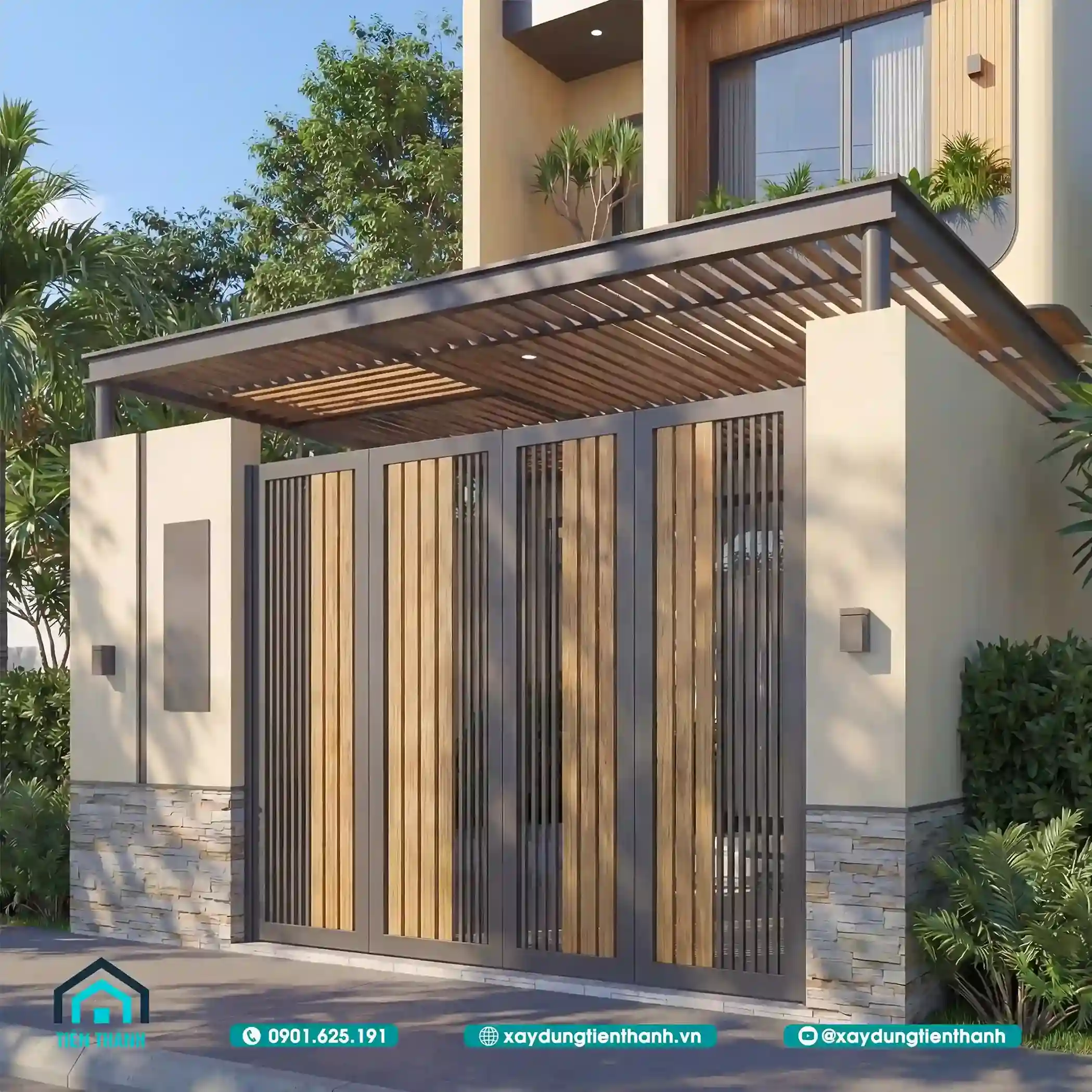 Cổng gỗ nan ngang sang trọng kết hợp mái che lam sắt và cây xanh trang trí.