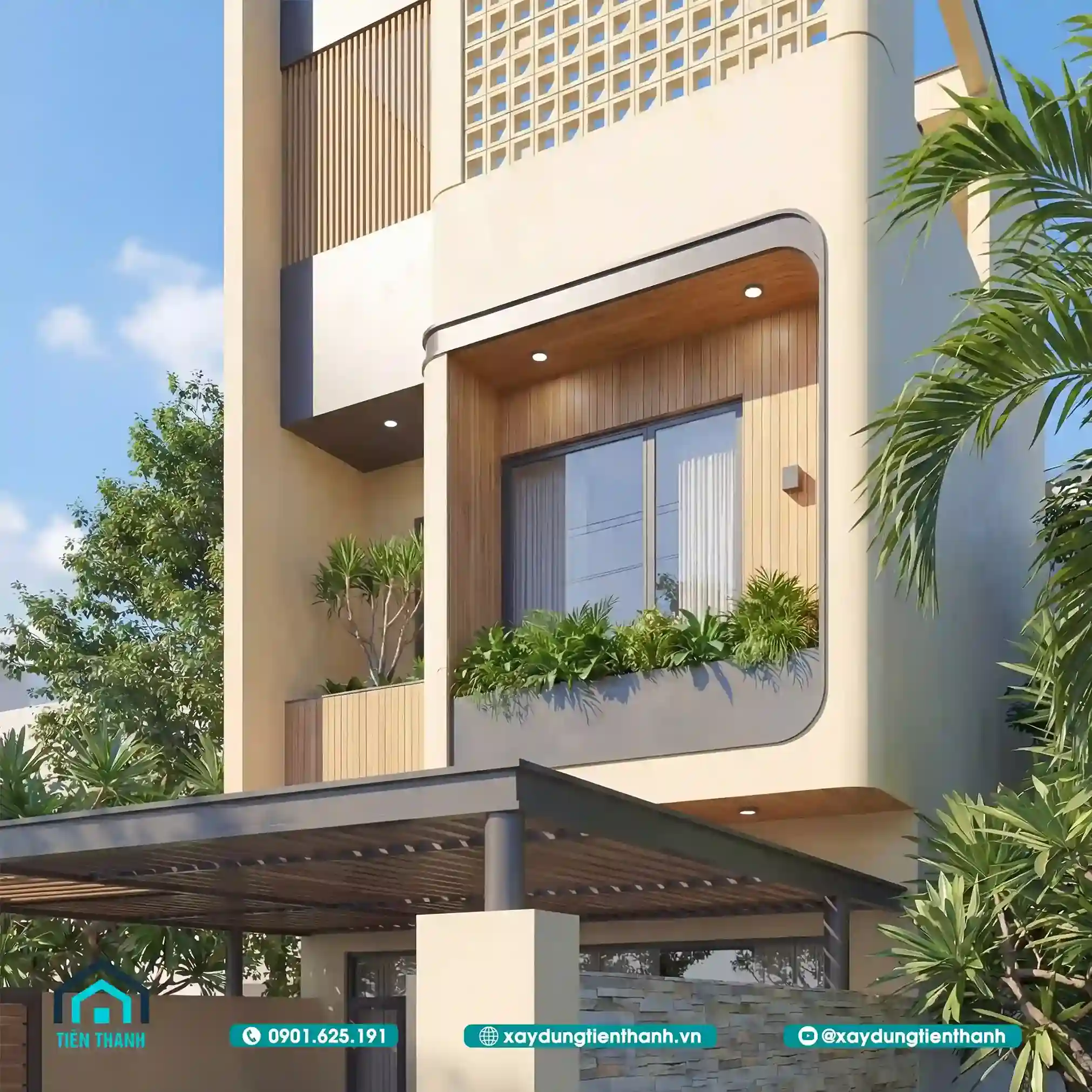 Cây xanh được bố trí tại các bồn hoa nhỏ trên ban công. Không gian tầng trệt được bảo vệ bởi bức tường rào chắc chắn. Đèn LED âm trần giúp mặt tiền lung linh hơn vào buổi tối. Đây là mẫu nhà lý tưởng cho các gia đình trẻ năng động.
