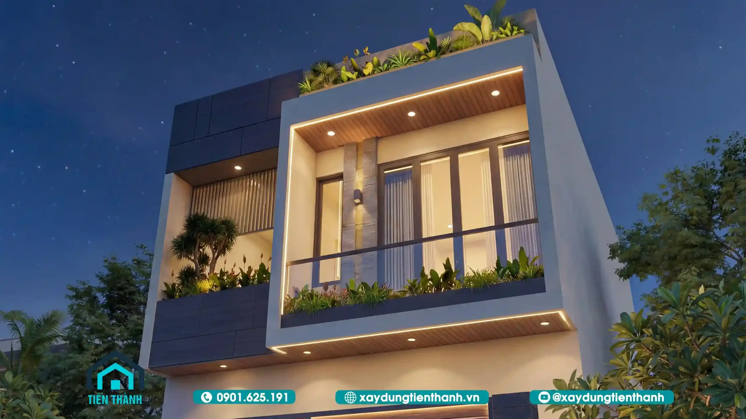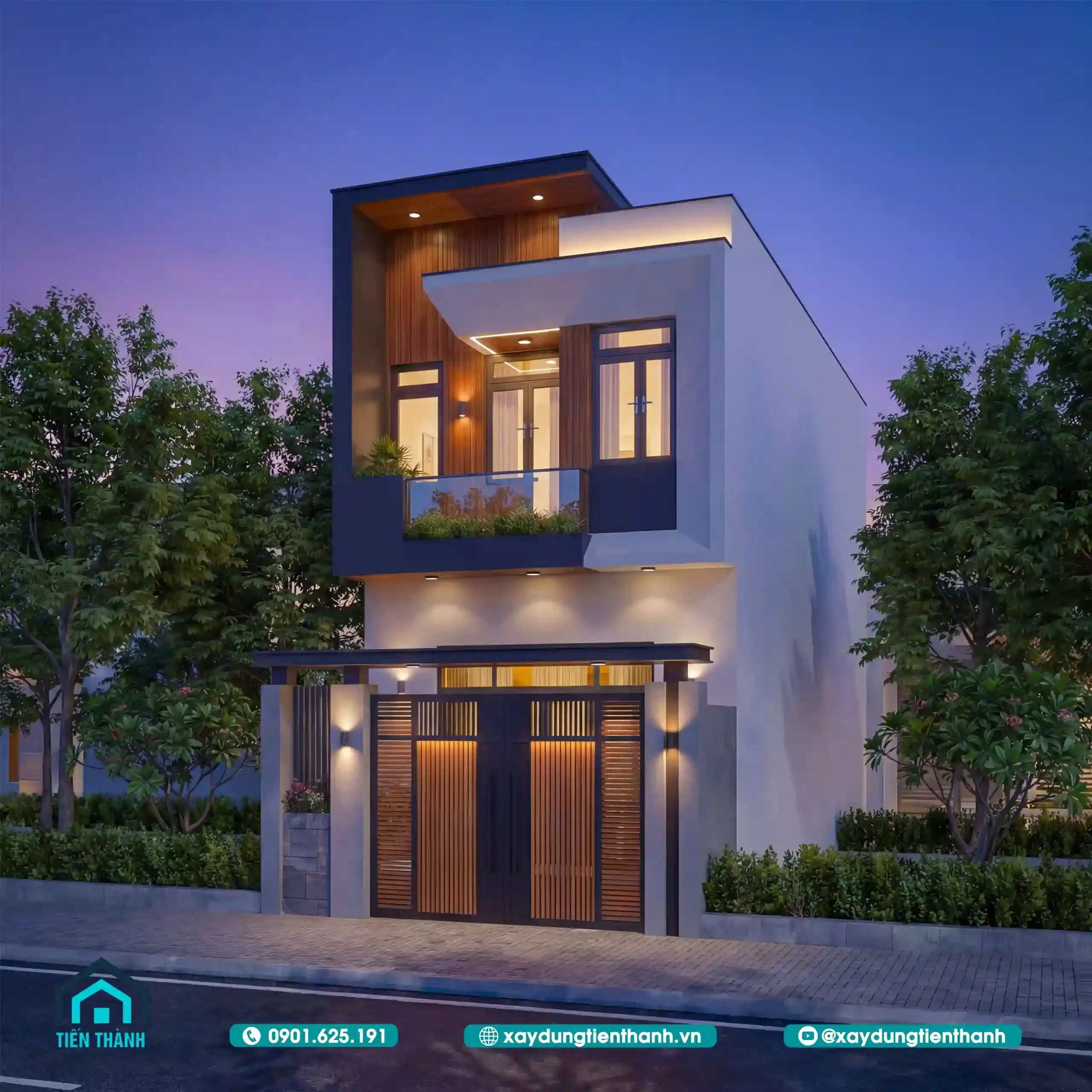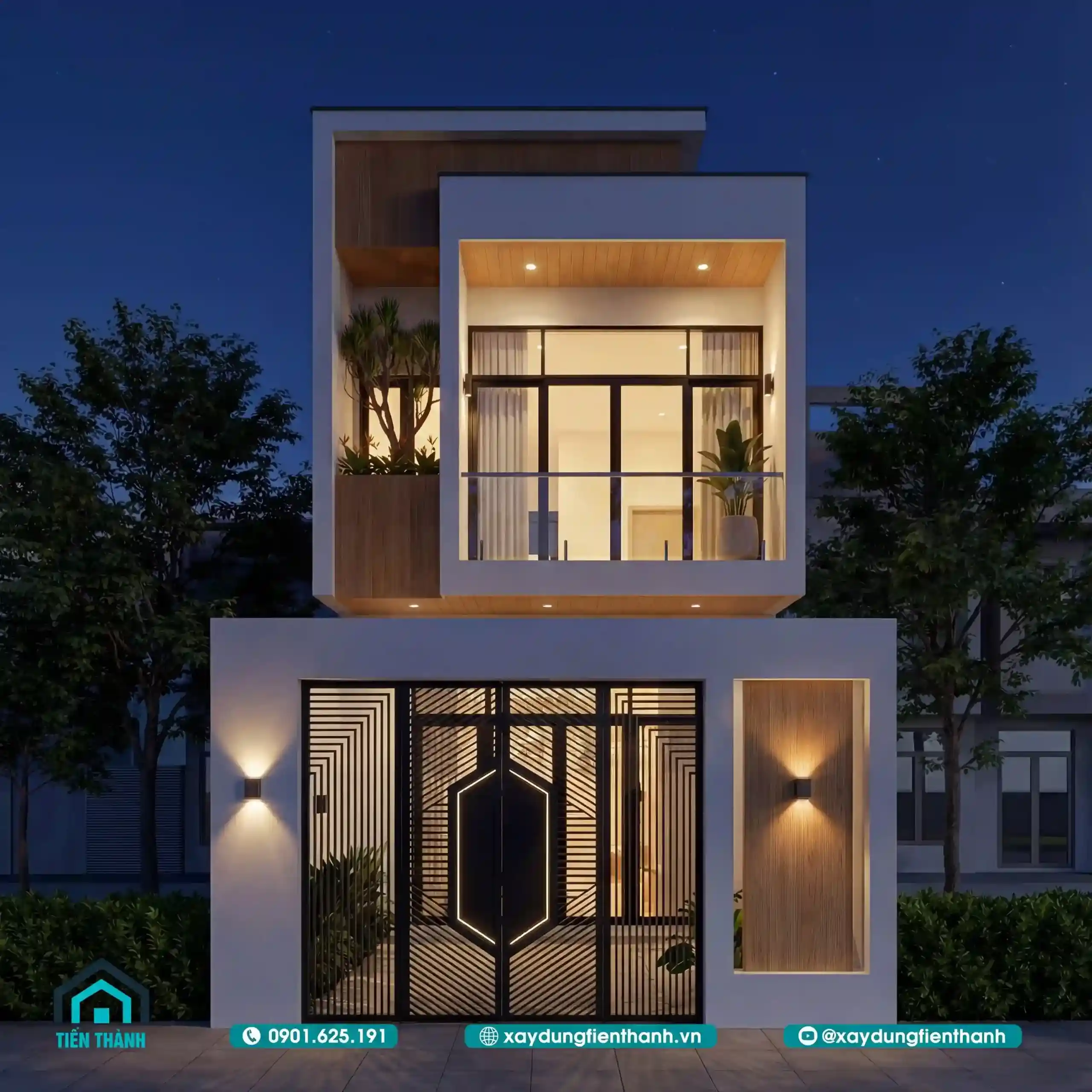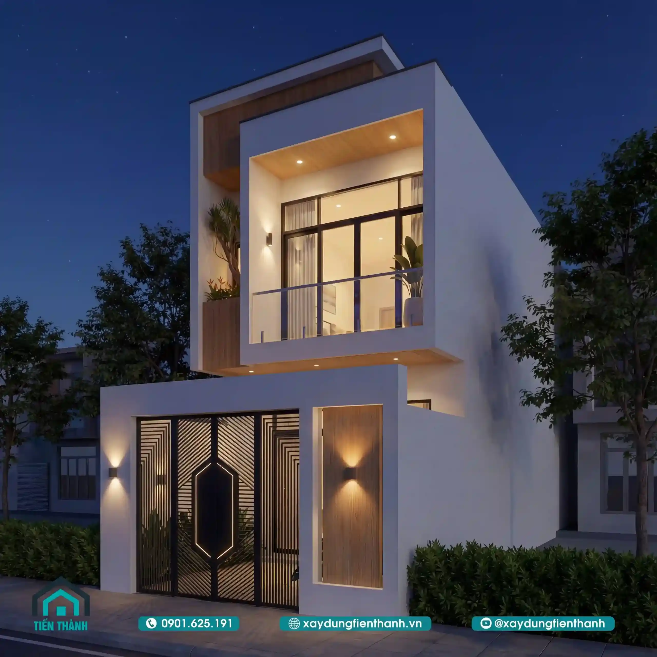 Vẻ đẹp hiện đại của ngôi nhà phố hai tầng nổi bật giữa không gian đêm tĩnh lặng.