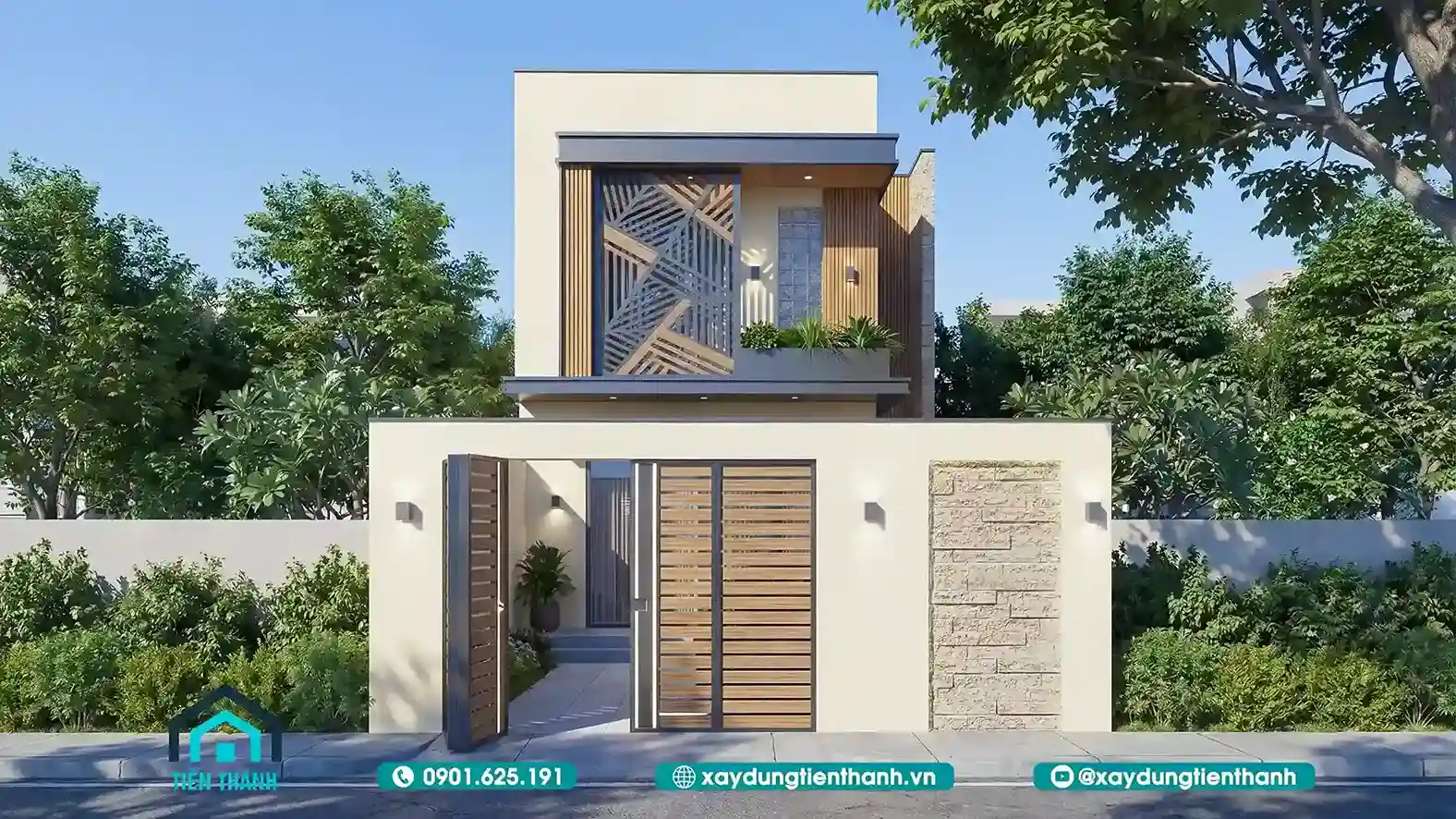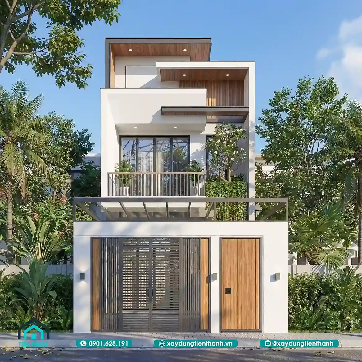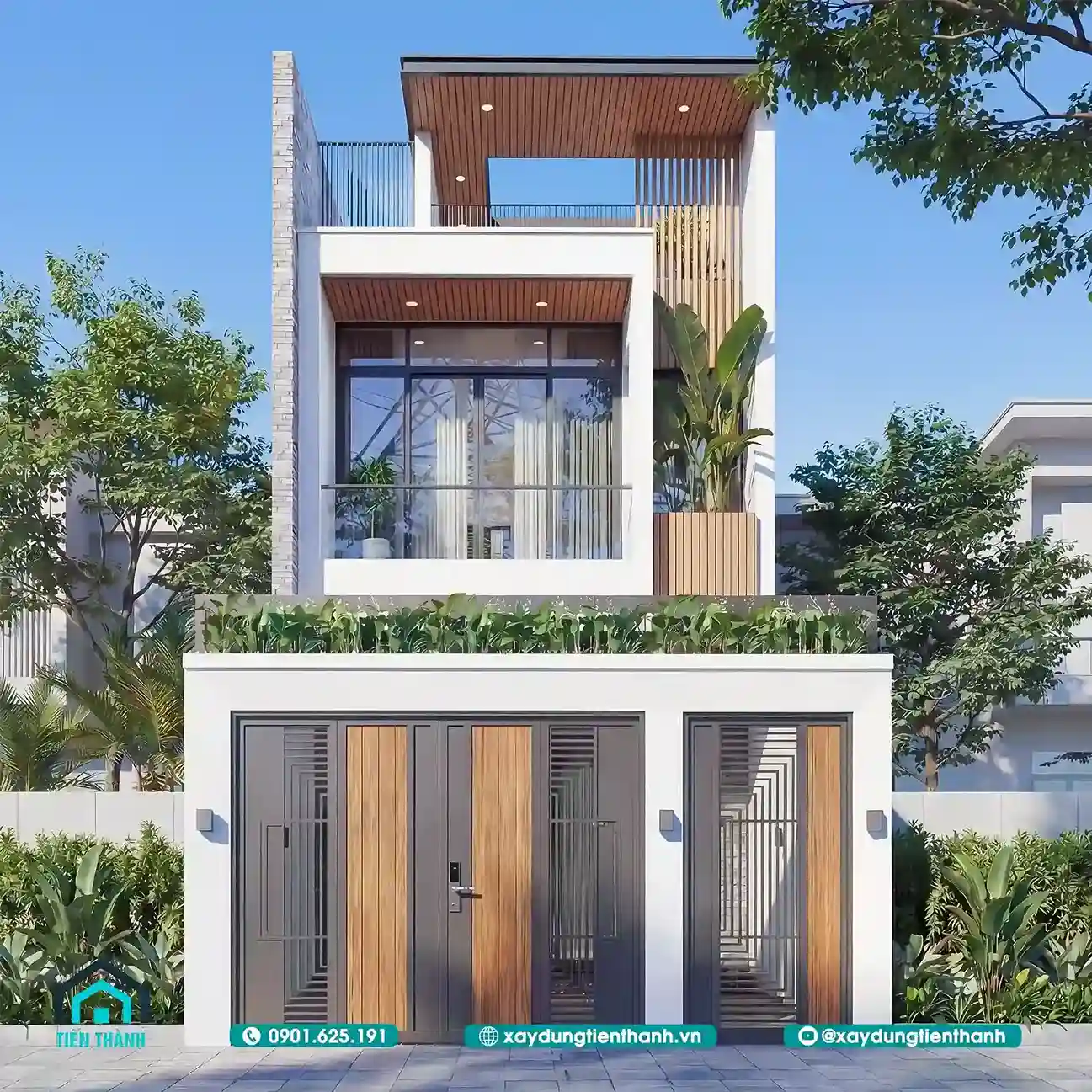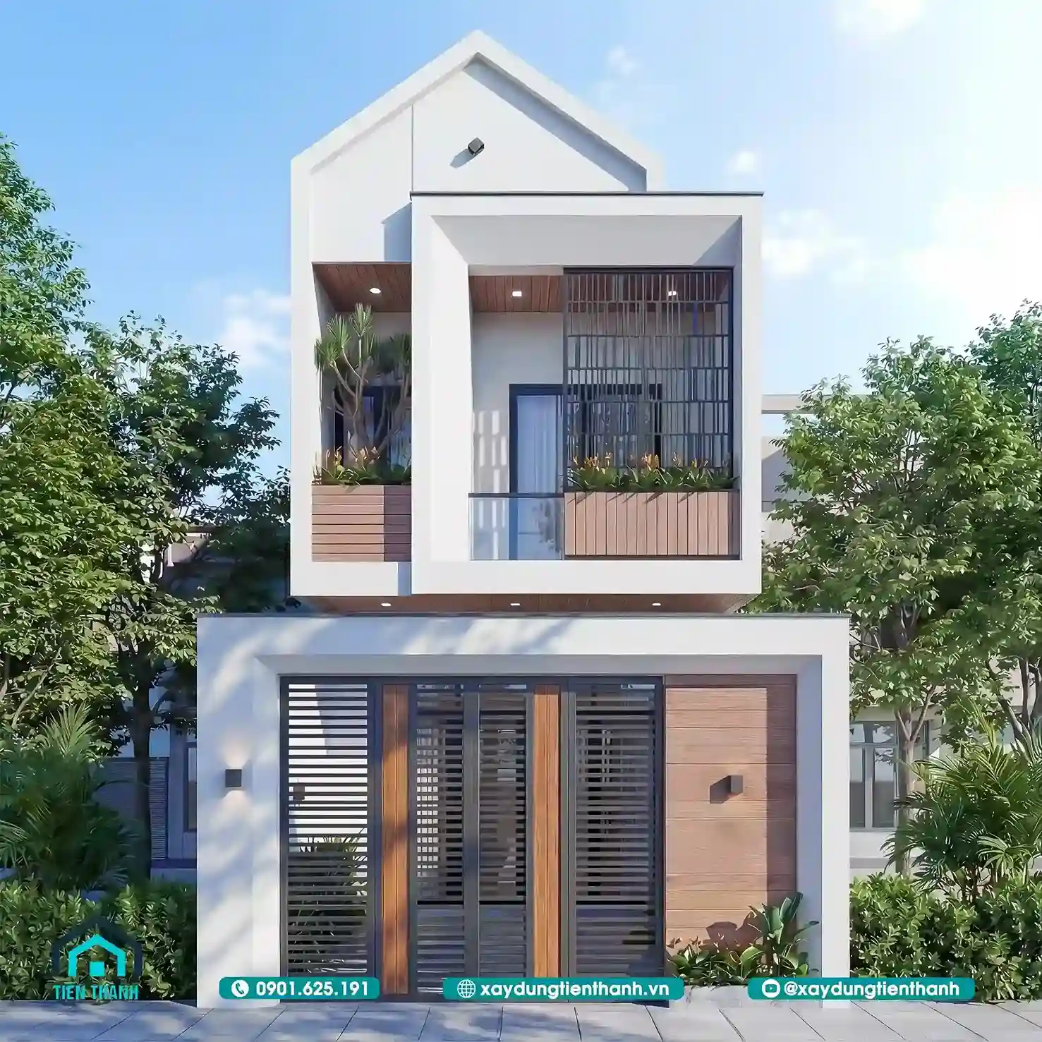 Mẫu nhà này sử dụng các khối hình học xếp chồng lên nhau. Tầng hai có khoảng ban công rộng rãi với lan can kính. Mảng tường ốp gỗ chạy dọc tạo điểm nhấn theo chiều cao. Hệ thống cổng sắt có họa tiết hình học rất hiện đại. Sự kết hợp giữa trắng và nâu gỗ luôn mang lại sự sang trọng.