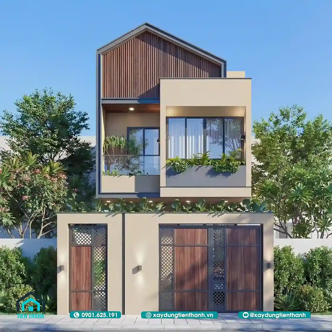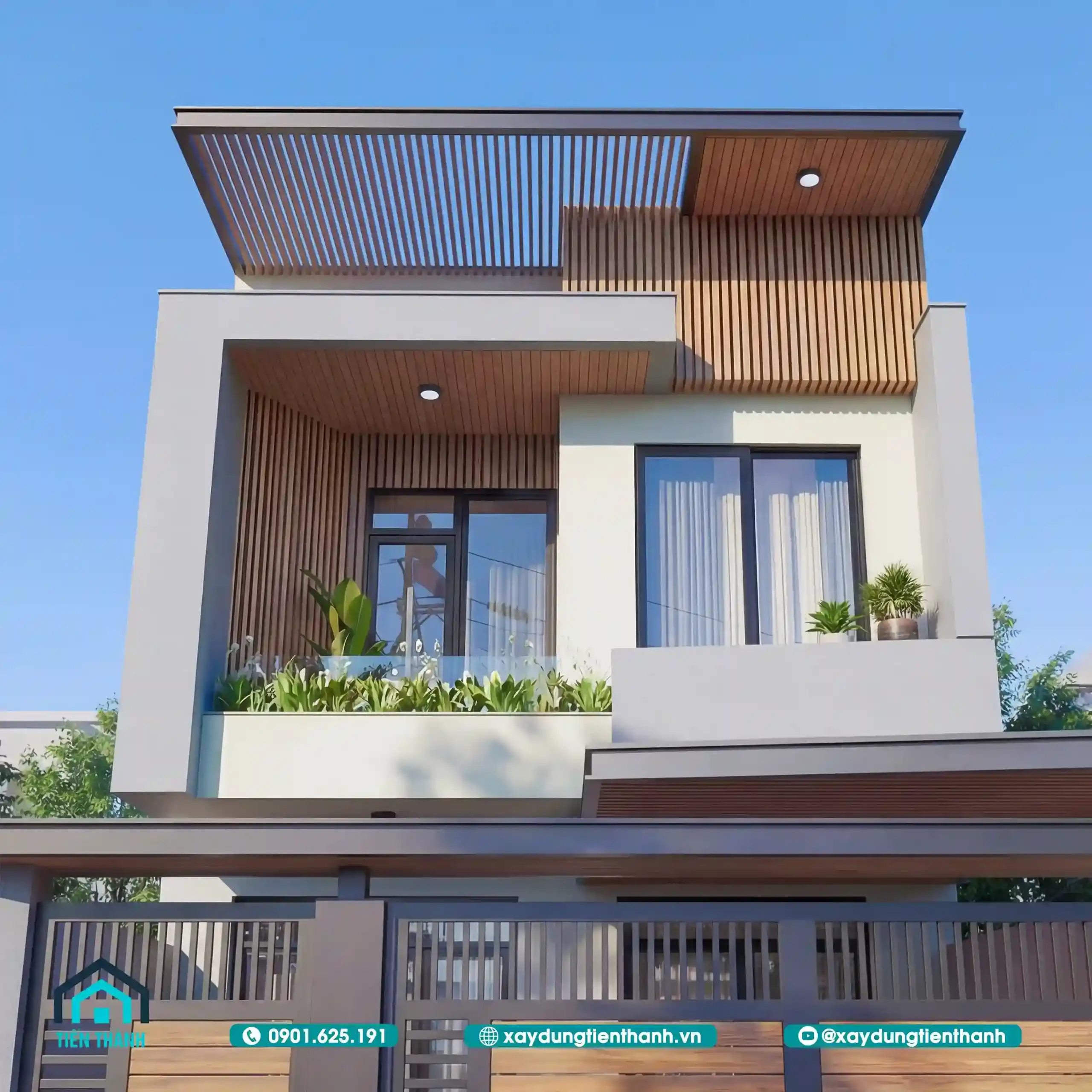 Mẫu thiết kế nhà đẹp 2 tầng hiện đại phối cảnh mặt tiền ốp gỗ sang trọng.