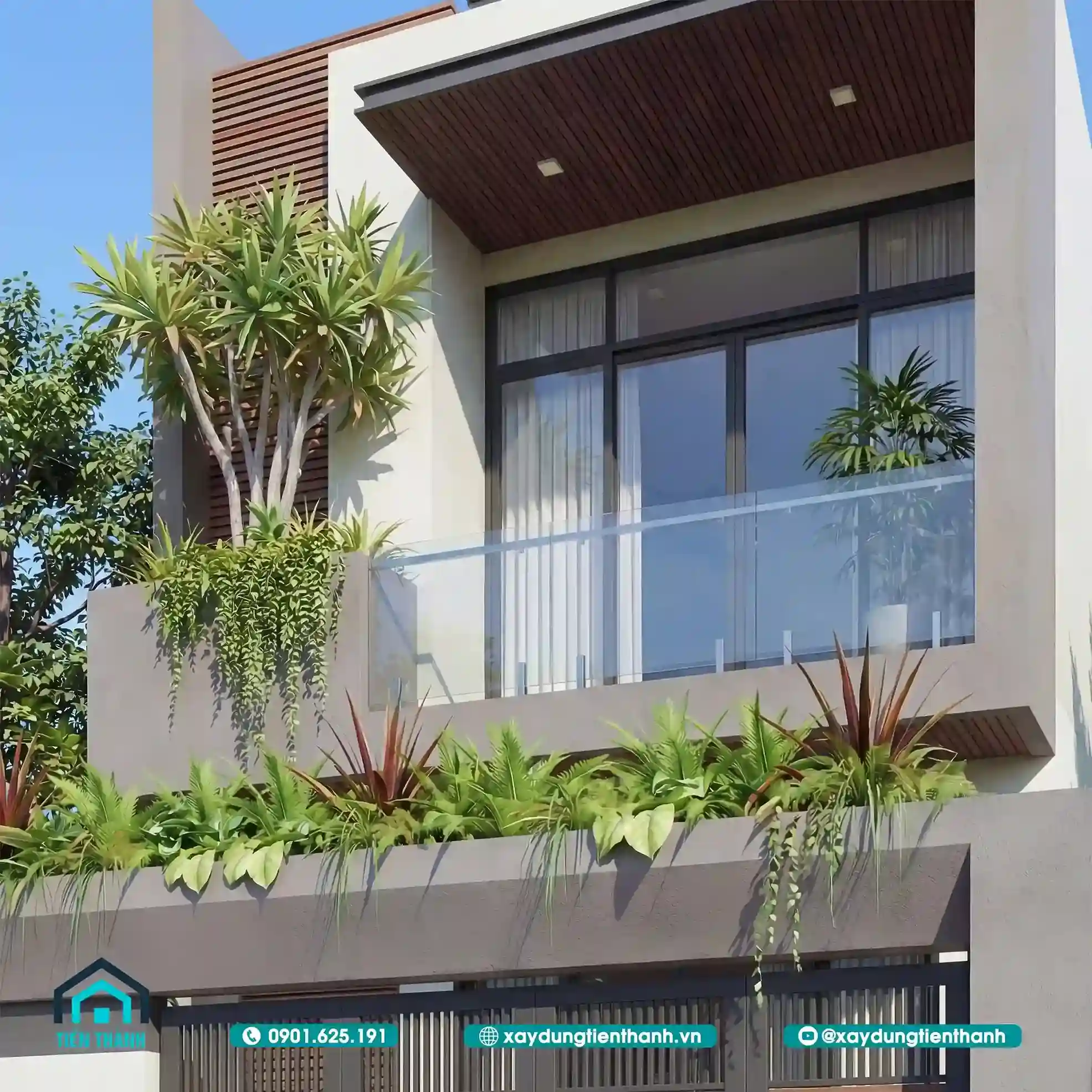 Tầng hai có ban công kính, trần ốp gỗ sang trọng và cây xanh trang trí mặt tiền.
