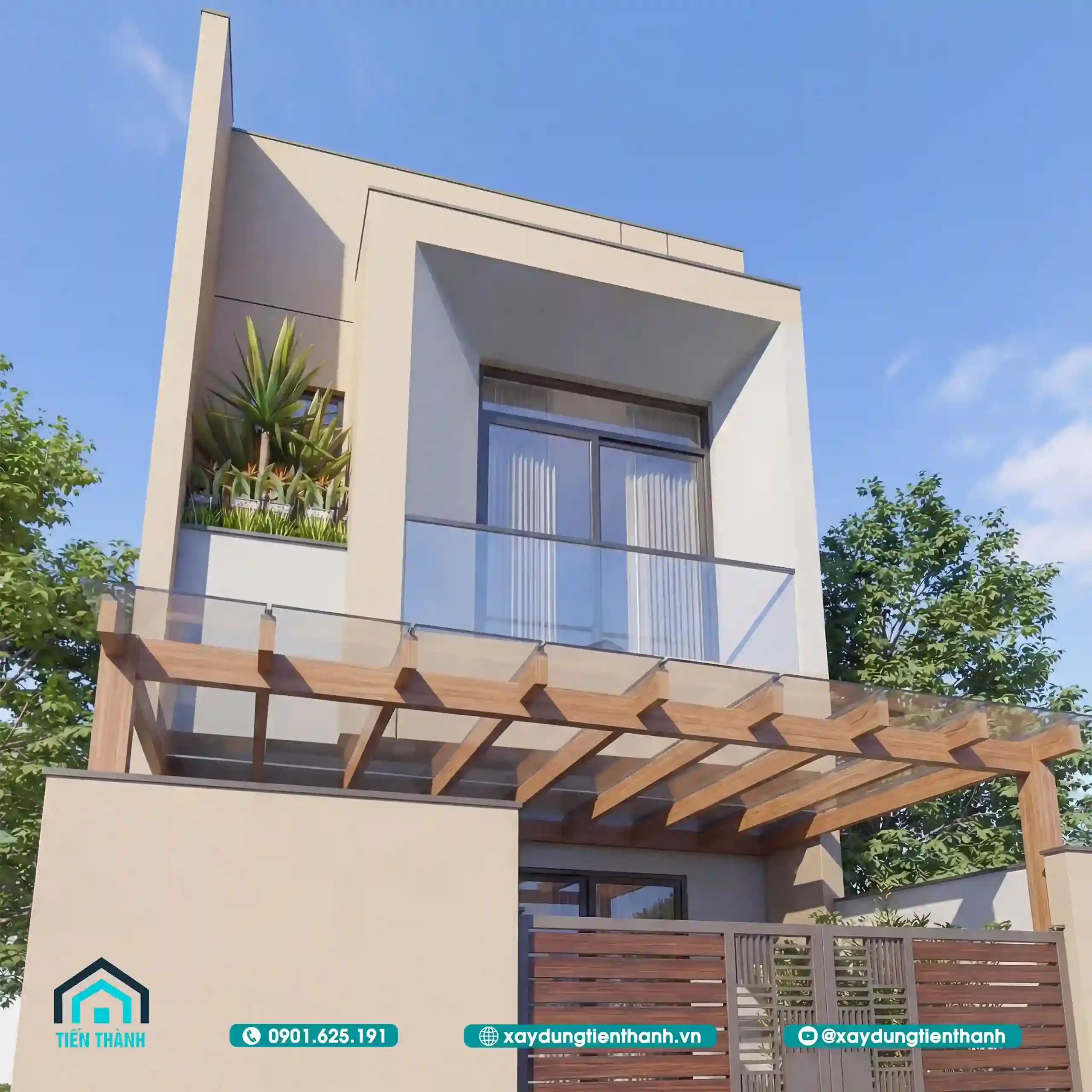 Mặt tiền nhà phố tông màu trung tính có ban công kính và mái che pergola gỗ độc đáo.