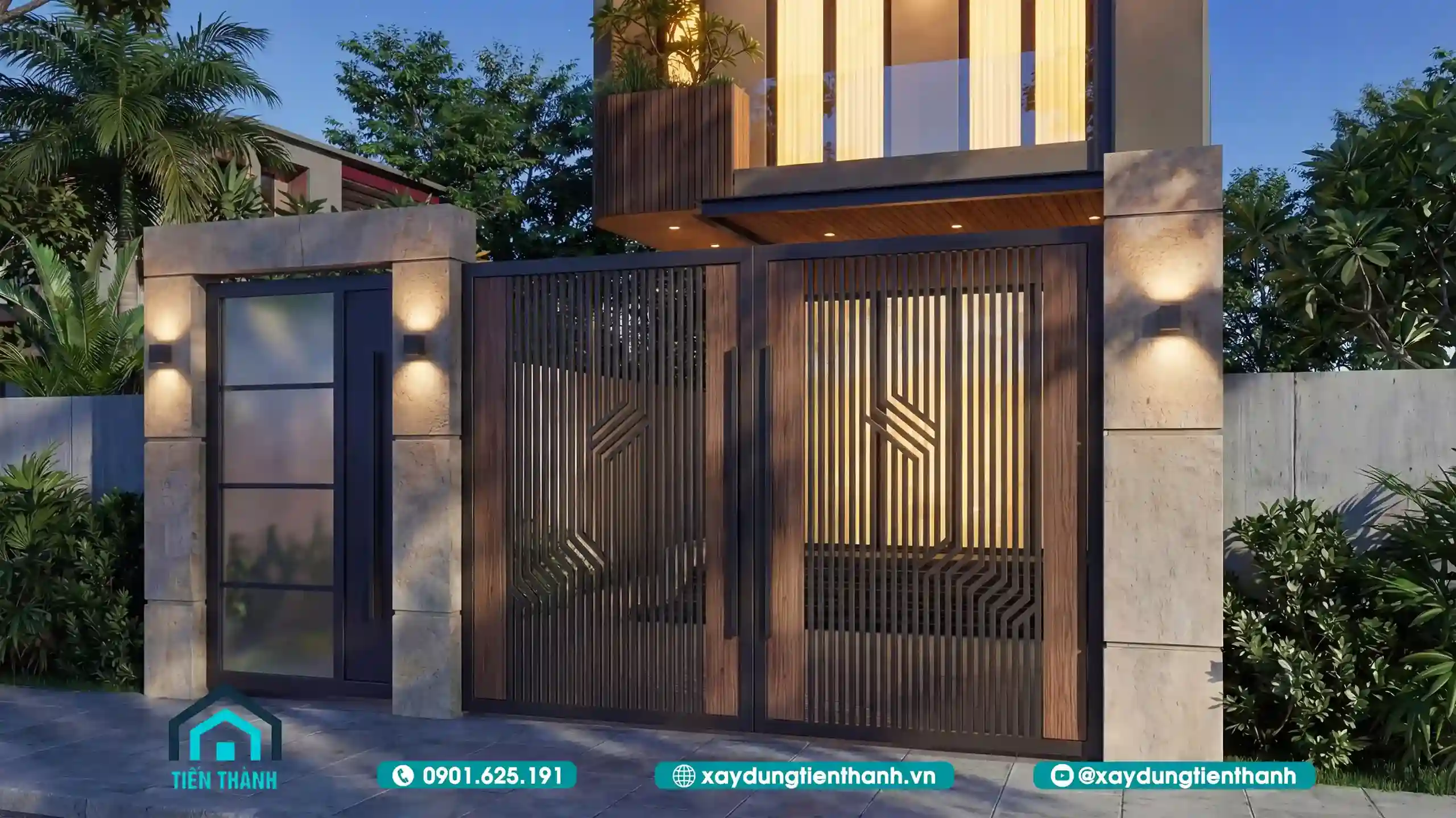 Hệ cổng sắt nan dọc phối gỗ độc đáo dưới ánh đèn vàng ấm cúng lúc chập tối.