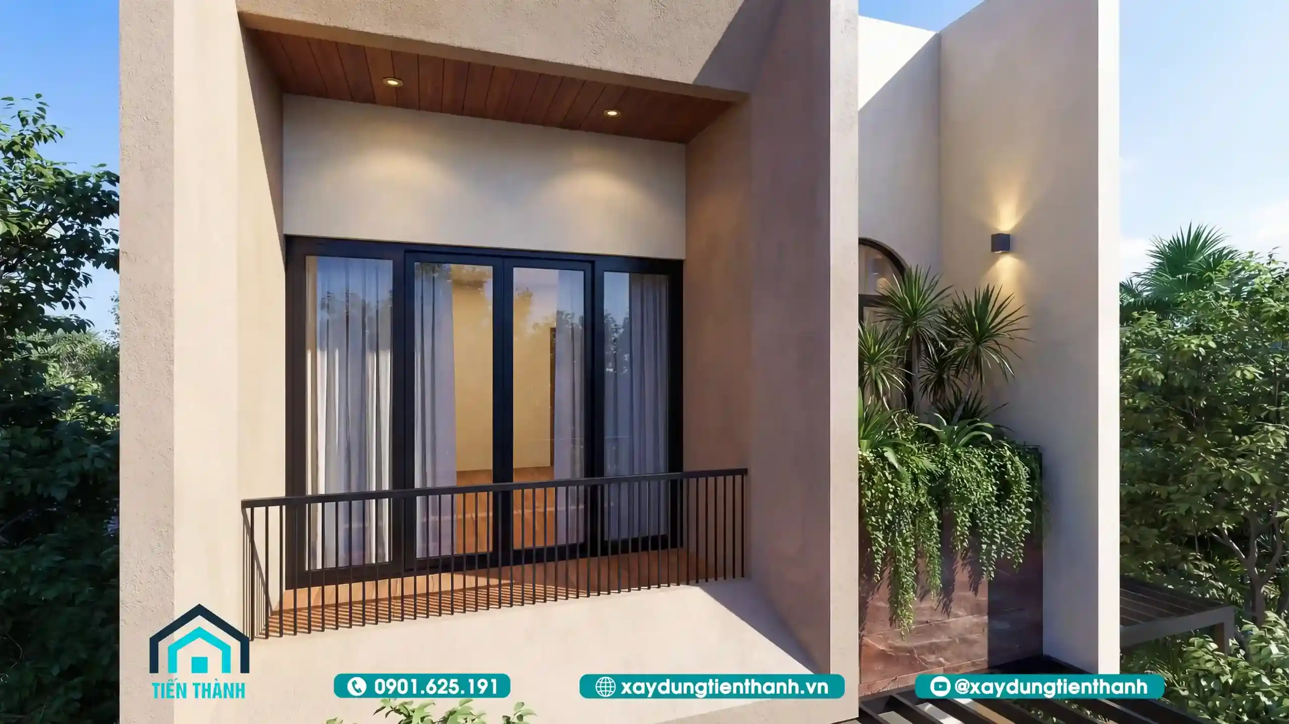 Mặt tiền nhà phố tối giản tông màu trung tính với ban công kính rộng và thoáng.