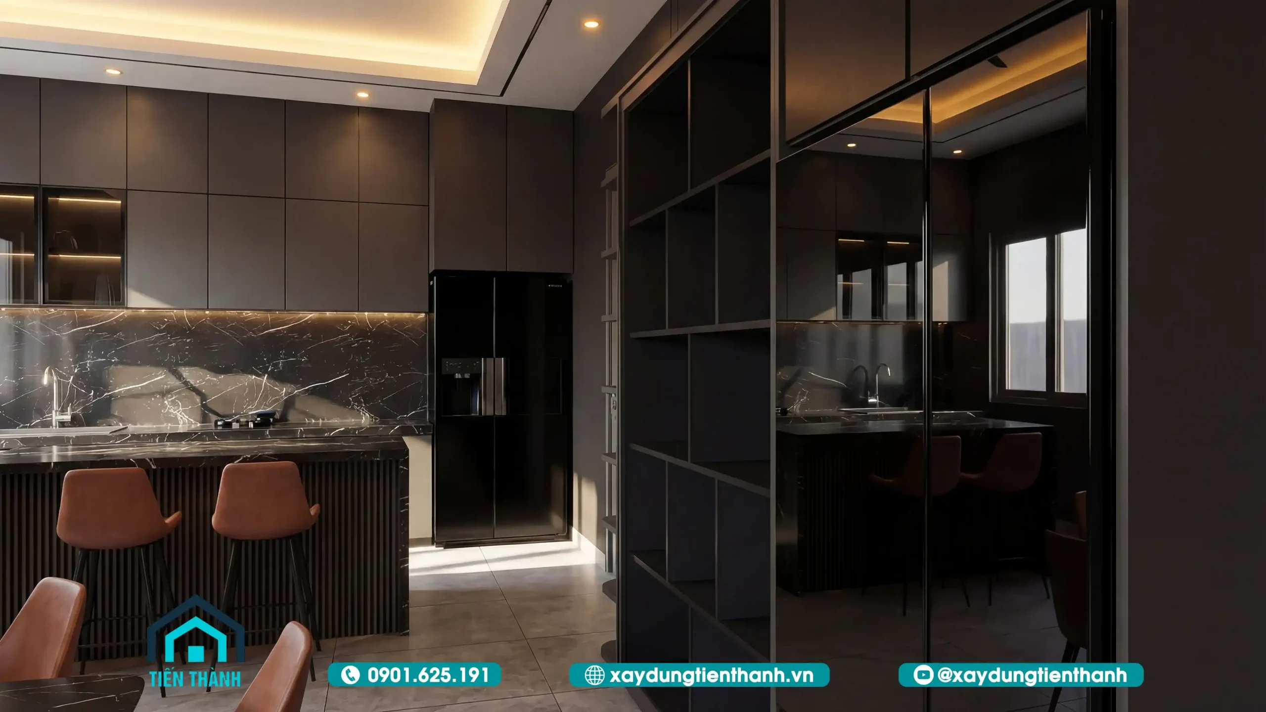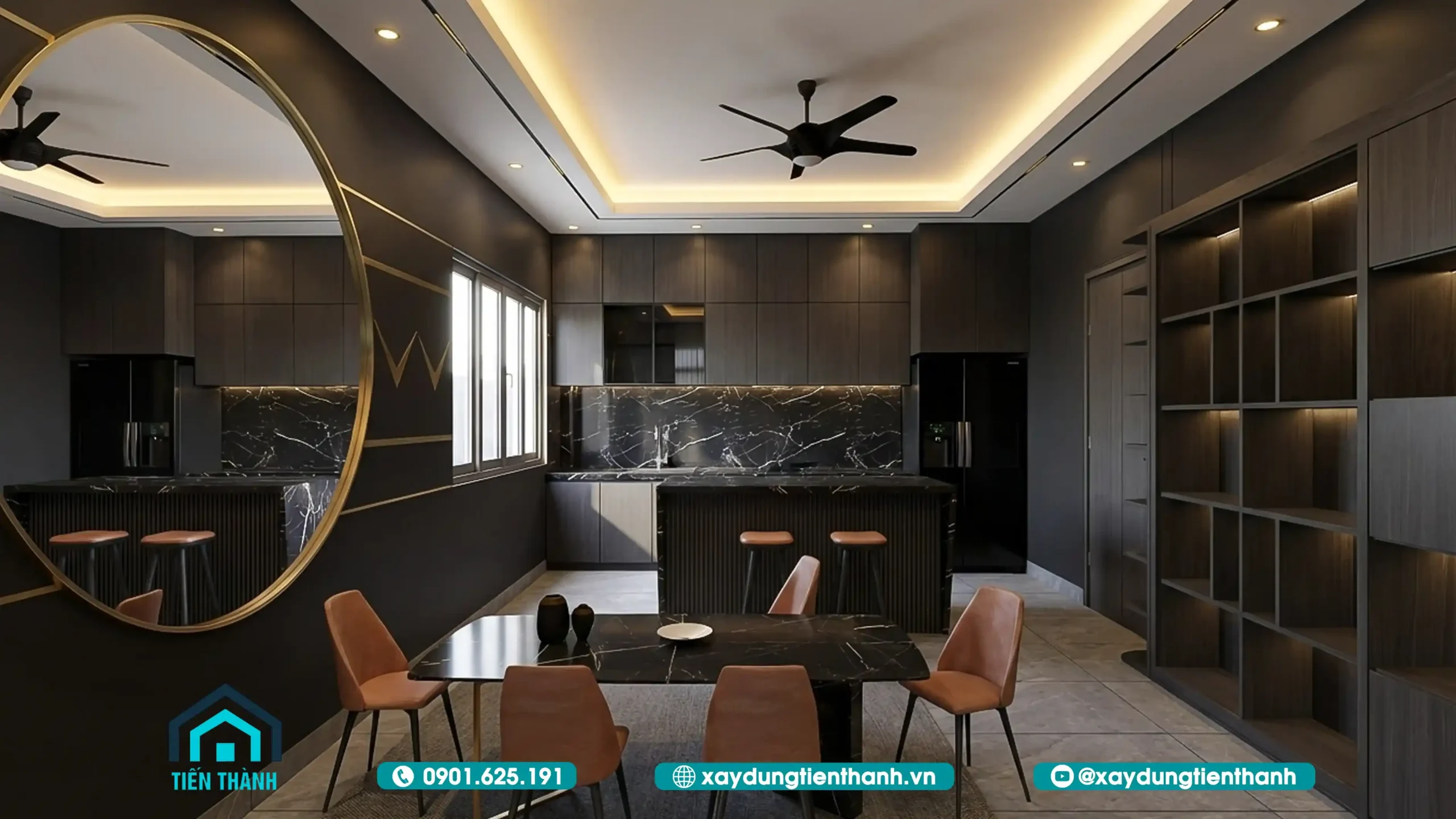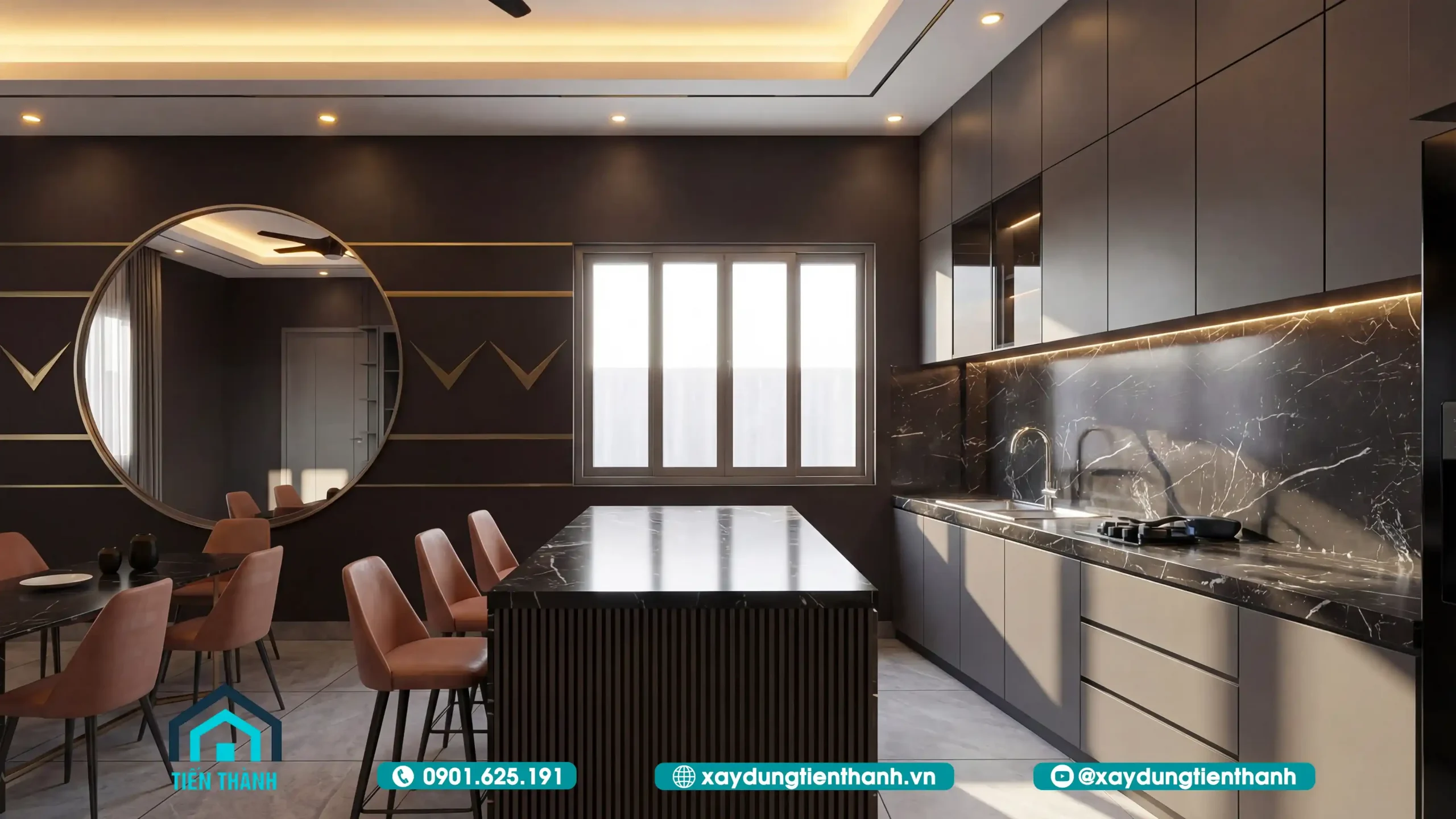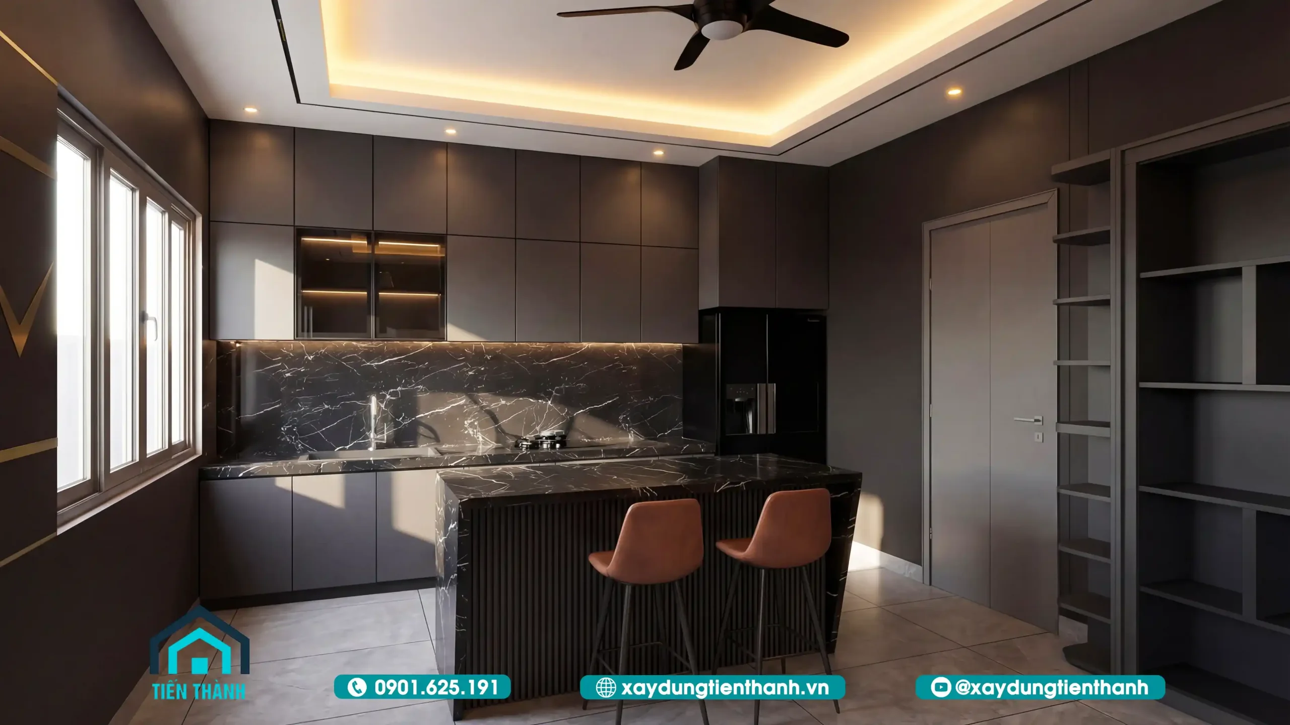 Hệ tủ bếp được làm từ gỗ công nghiệp cao cấp sơn phủ màu xám đen đồng bộ với tổng thể ngôi nhà. Mặt bếp và phần tường bếp được ốp đá Marble đen vân mây trắng tạo cảm giác sạch sẽ và cực kỳ sang trọng. Việc bố trí bàn đảo không chỉ tăng thêm diện tích chuẩn bị thực phẩm mà còn đóng vai trò như một quầy bar mini, nơi gia chủ có thể thưởng thức những ly rượu vang sau giờ làm việc.