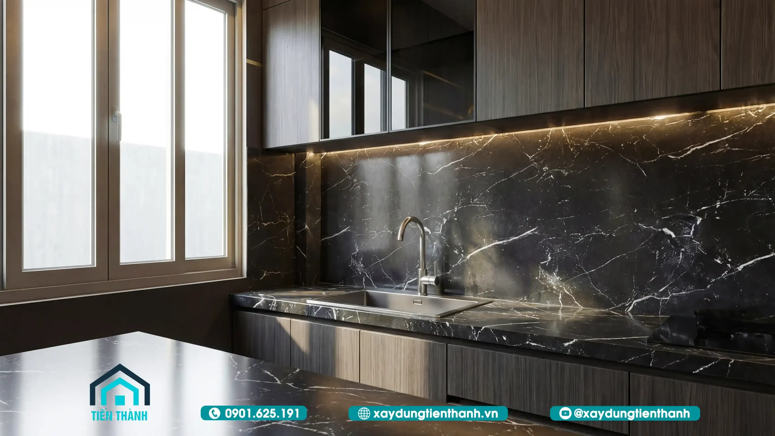 Cận cảnh khu vực bồn rửa bát với mặt đá marble đen vân trắng cực kỳ tinh tế.